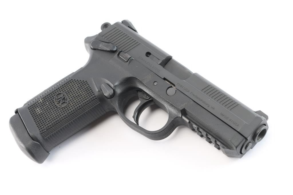 SN: 61DZZ04786. Manufactured by FNH U.S.A. FNP series are hammer-fired firearms utilizing a Browning cam system with an external extractor. 4 1/2" barrel, matte black slide with fore & aft cocking serrations, controls are ambidextrous. The black polymer frame has a section of picatinney rail on the dust cover and interchangeable backstraps for ergonomic customization, checked grip with grooved straps. White 3-dot dovetailed sights. Comes with factory extended 15-rd magazine. Bore is excellent/bright, pistol is like new condition. Comes in original factory hard case with manual, cable lock, 2 spare 14-rd magazine. Also comes with Blade-Tech FN holster and two additional FN 15-rd magazine still in the boxes. 5 Magazines total.