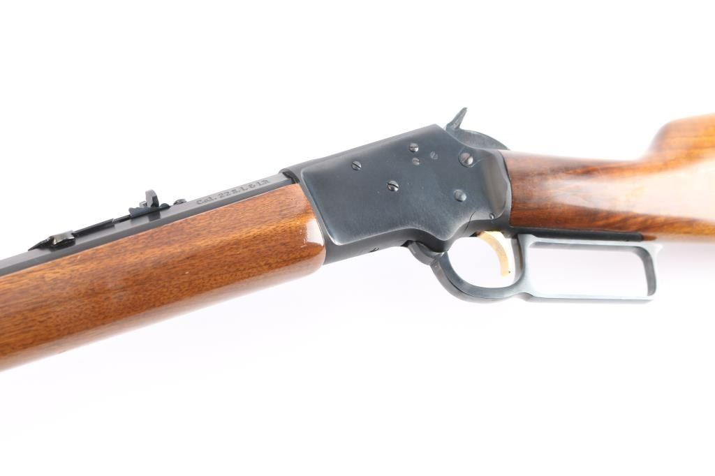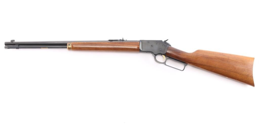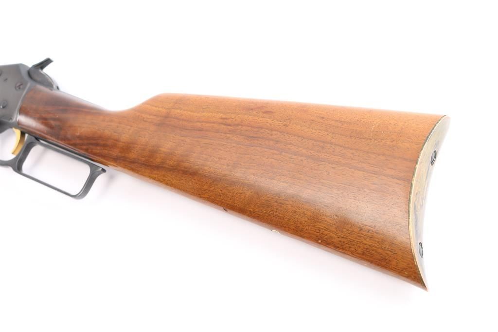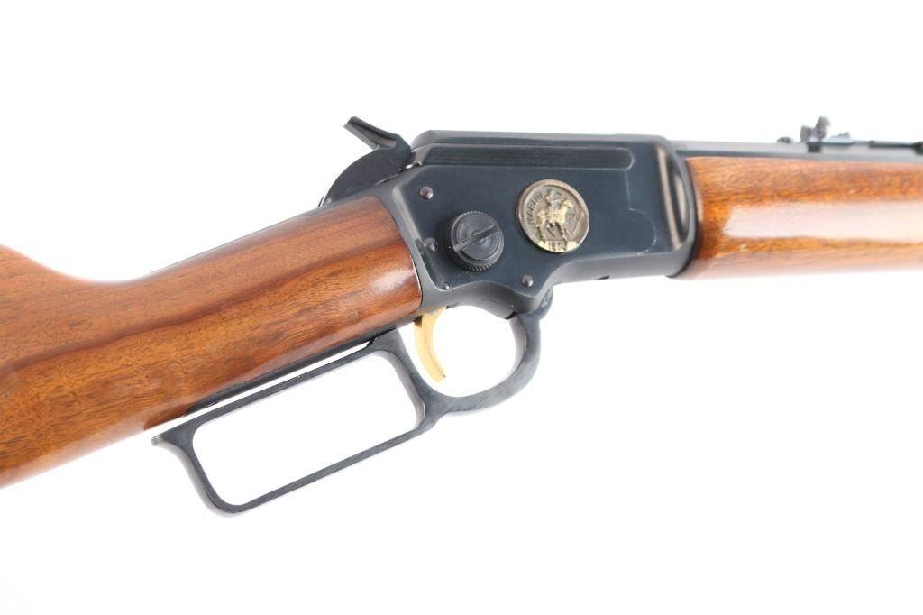 Marlin Firearms Co. made Limited edition commemorative rifle manufactured in North Haven, CT. Featuring a blued finish, 20" "JM" marked octagon barrel, full-length tube magazine, blade with brass bead front sight, adjustable sporter rear sight, drilled & tapped receiver, installed hammer extension, smooth curved gold colored trigger, take-down receiver with with Marlin centennial seal type embellishment on the right side, smooth wood forend with bass cap and straight grip shoulder stock with tacked bass plaque in the right side & brass crescent buttplate. Smooth action, and excellent bore. The blued finish is about 98% with the metal showing a spot of rust on the trigger guard area of the lever, and there is wear/scratches on the face of the trigger. Buttstock and handguard have very minimal handling marks. Manufactured circa 1970.