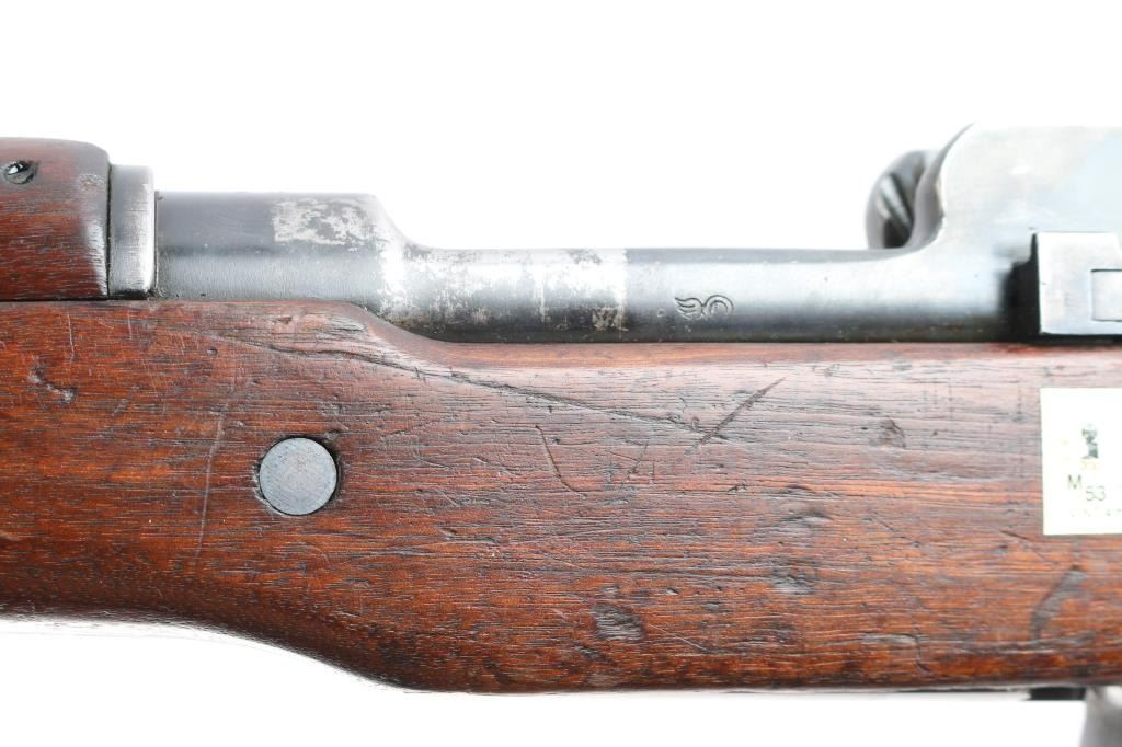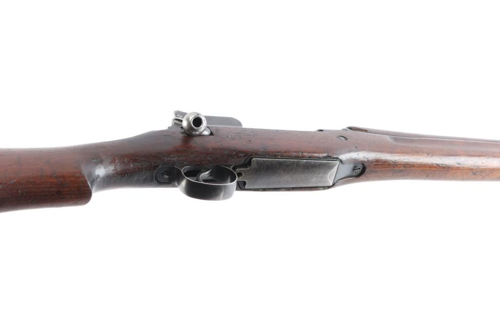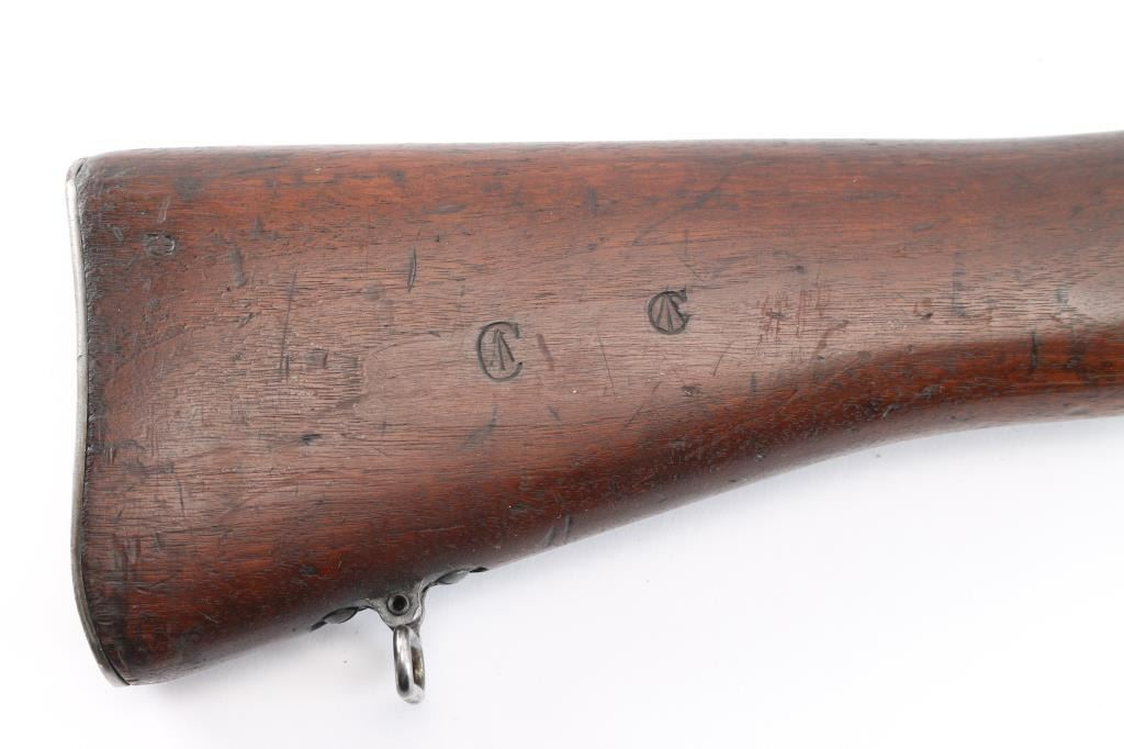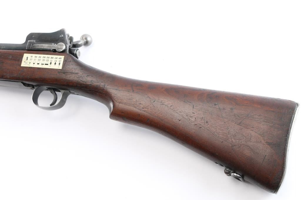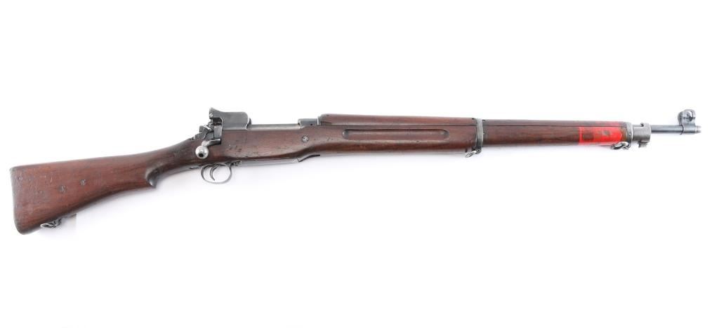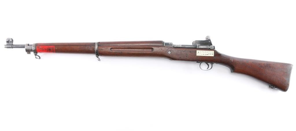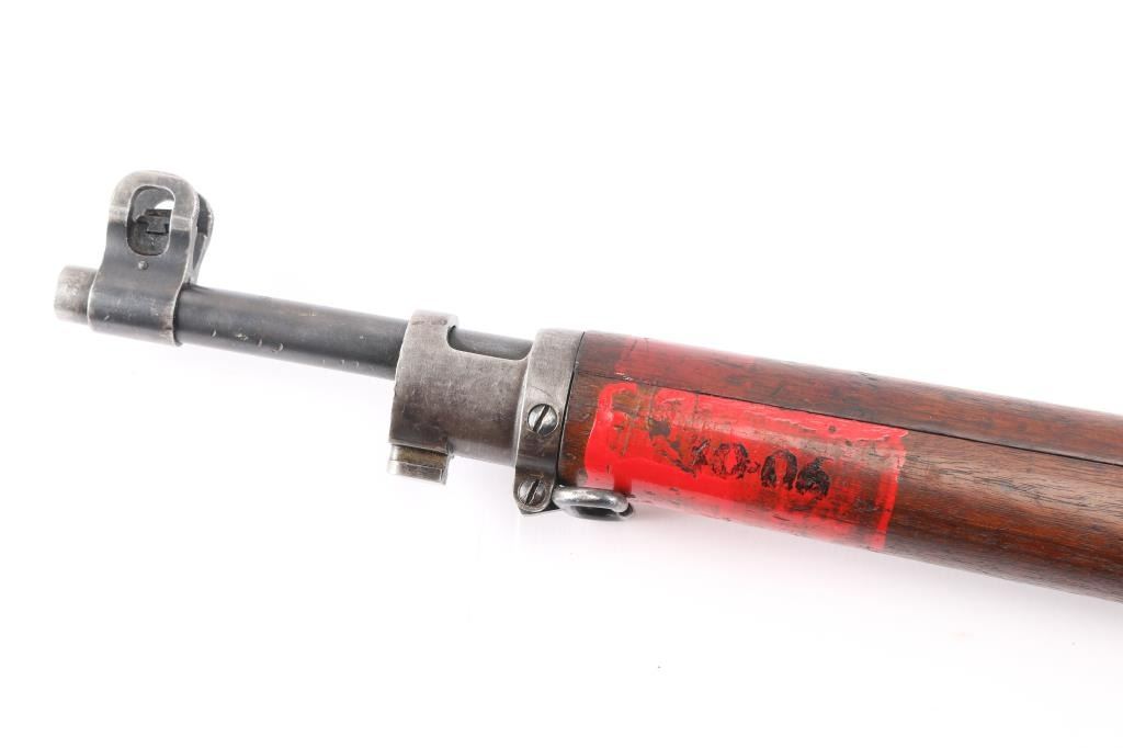 "Lend Lease" (to British Commonwealth, probably during WWII). Imported by CAI, St Albans VT. US military Mauser pattern bolt action rifle manufactured circa 1918 for use in WWI by the Eddystone division of Remington. Often referred to as "Enfield", due to British Enfield type rifling. Features 26" barrel, protected blade front sight. folding ladder type rear peep sight, manual safety, 6 round magazine, wood handguard & stock with grasping grooves, trap door in butt, sling swivels, stacking swivel. Bore is dark, lightly pitted throughout, shows strong rifling. Retains 60% blued finish with much bare metal, some cleaned patina, thinning wear handled. Wood shows dents & dings, red paint behind front band with stenciled "30-06" in black paint. Aiming guide diagram sticker on left side near receiver. Metal fit to wood is very good. Retains US Army Ordnance "bomb" marks. Barrel dated "9-18". Broad Arrow inside letter "C" stamped on right side of butt.
