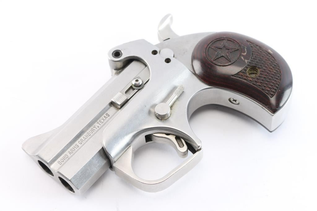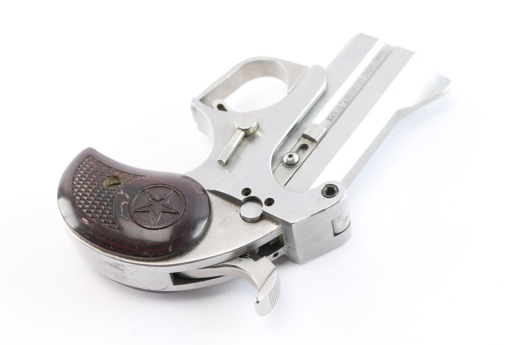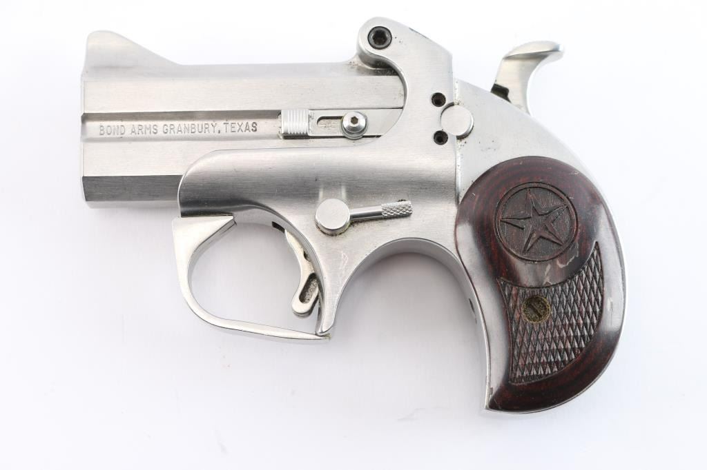 SN: 144220. 'Texas Defender' Stainless steel two shot derringer accepts .45 Colt or 2 1/2" .410 shotgun shells. Features break open over/under barrel assembly, manual extractor lever, manual safety, fixed sights, checkered wood grips with engraved Texas stars, 3" barrels. Bores are excellent. Brushed stainless finish is overall very with a few minor scuffs. Grips are very good with minor scratches. Includes soft case