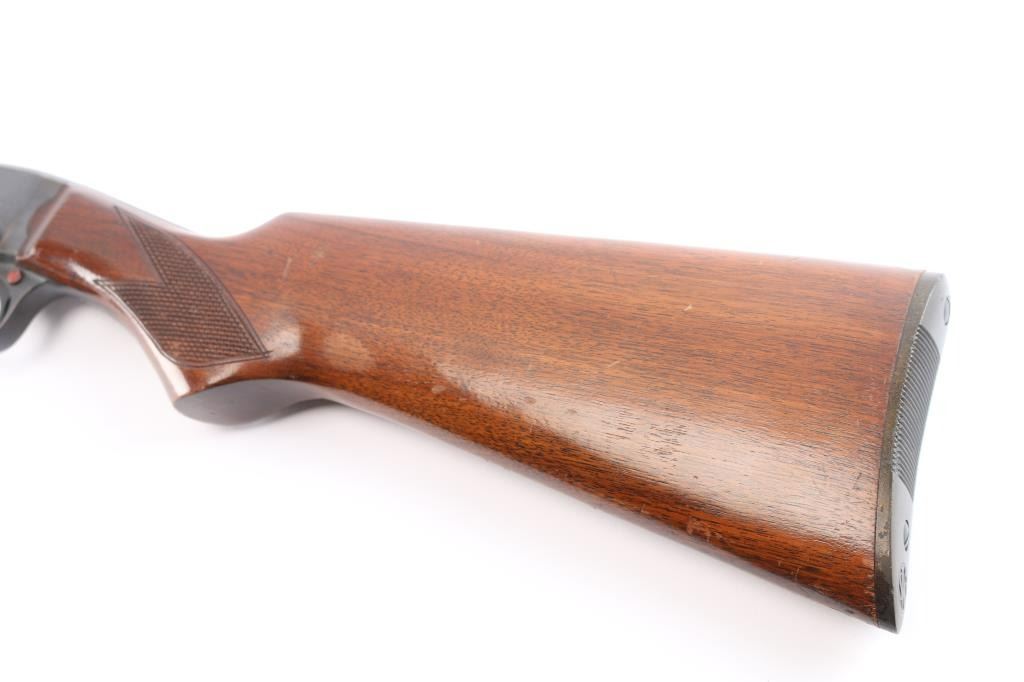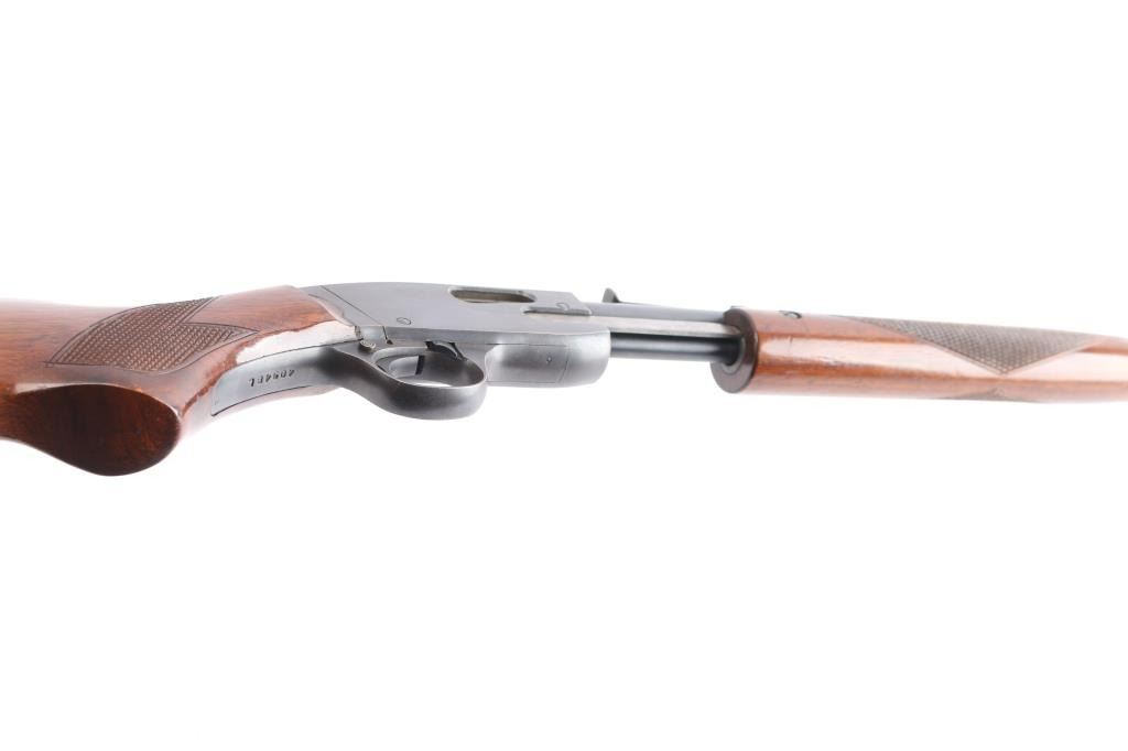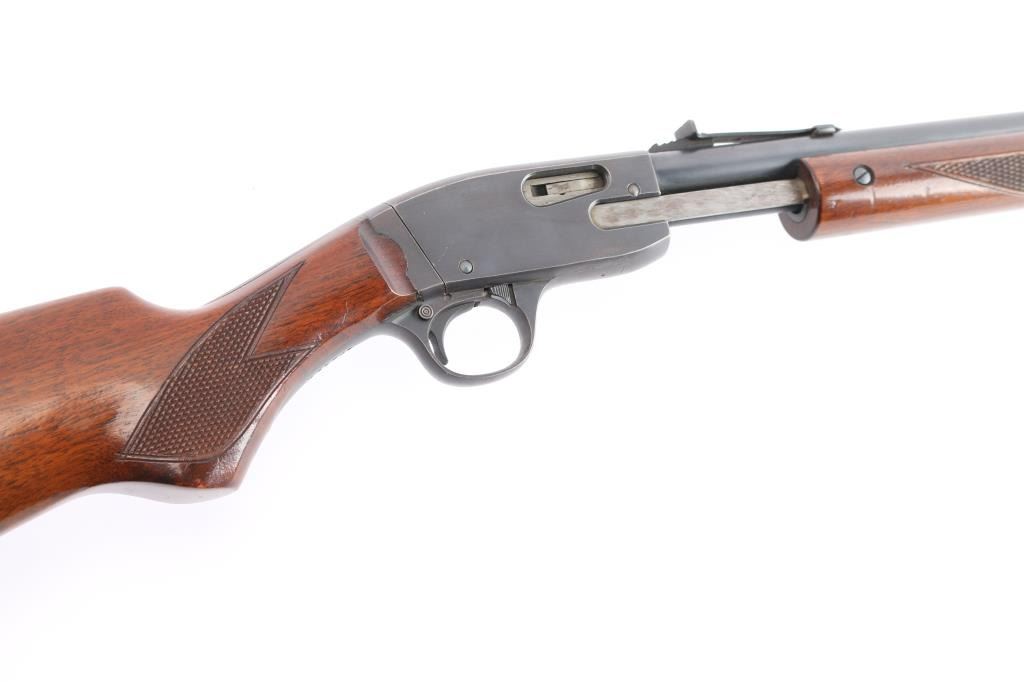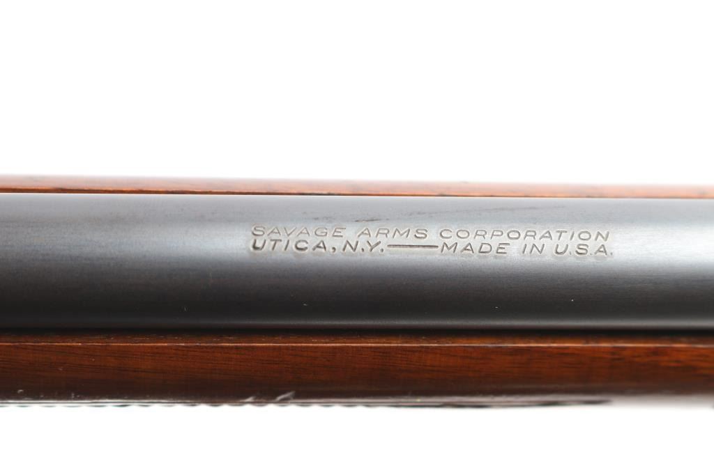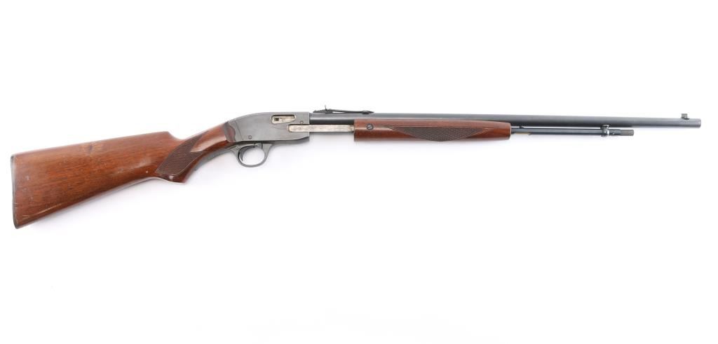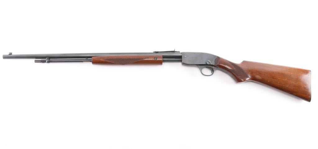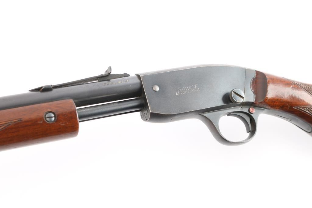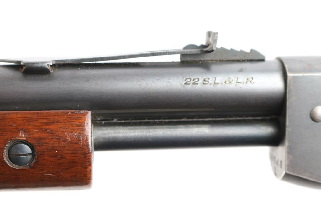 Vintage take-down slide action repeating rifle chambered in .22 Short, Long or Long Rifle. Manufactured by Savage Arms Co. Utica, NY. Features a blued finish, 24" barrel, 3/4 length tube magazine, blade front sight with brass bead, adjustable rear sight, take-down receiver, smooth trigger, push button safety, checkered wood slide handle, and checkered semi-pistol grip shoulder stock with serrated black hard rubber buttplate. Rifle exhibits approximately 85% of it's original finish showing patina on the receiver and trigger guard, slide wear on the magazine tube & barrel, small amounts of edge wear, and some rust on the slide rail. Action is smooth, bore appears bright with good rifling, and wood stocks are good with numerous small blemishes.