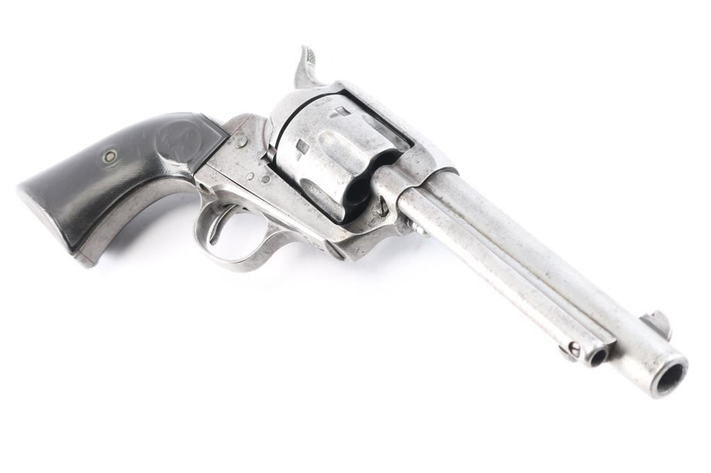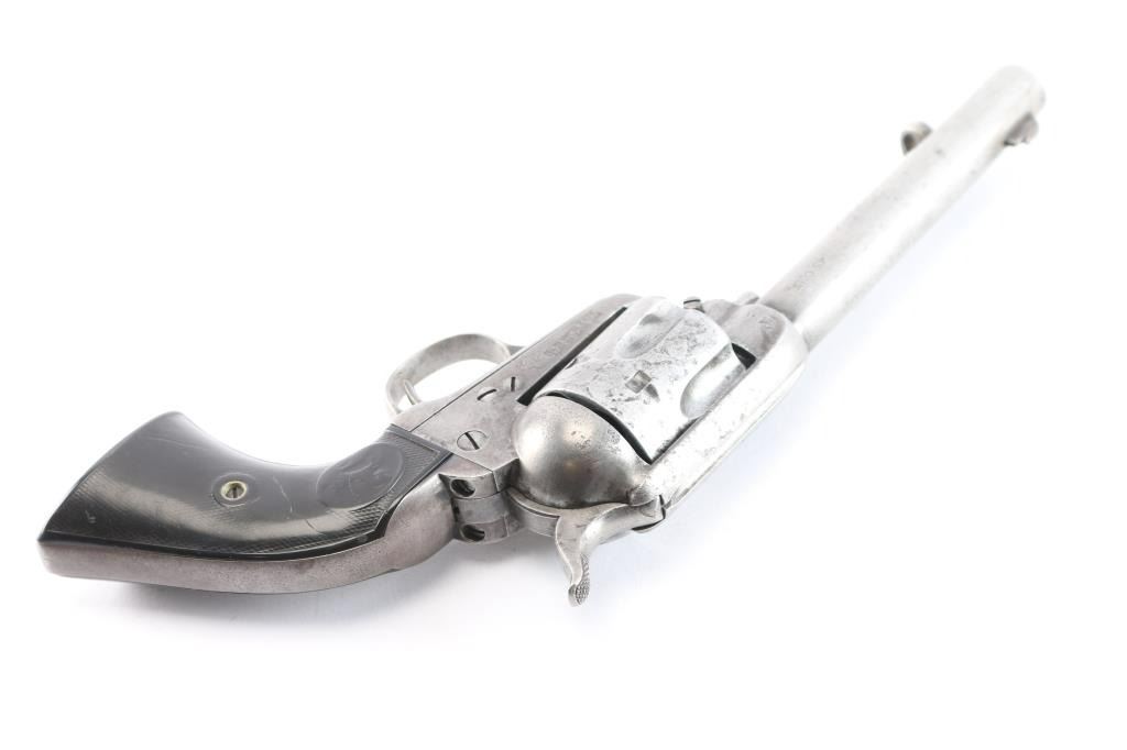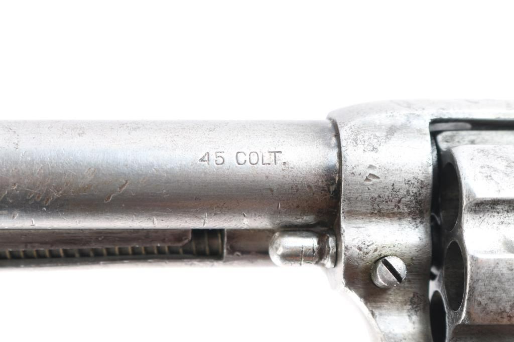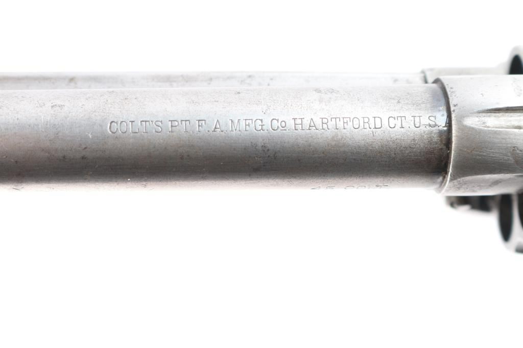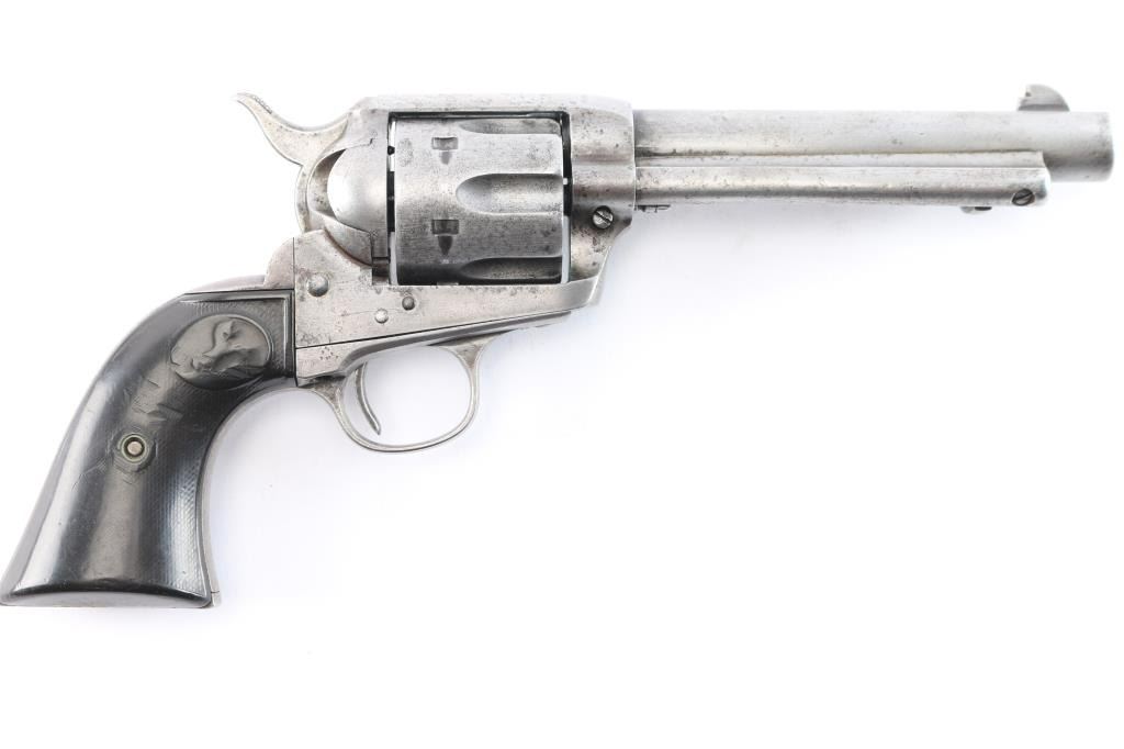 Colt S. A. Army Revolver 45 Long Colt Caliber, 5 1/2" barrel, gray patina finish, hard rubber grips #232025. Light gray metal surfaces with good markings and scattered light pitting and erosion. Grips are worn almost smooth and fit impeccably well. Marks on left side of barrel tube possibly from turning "barbed wire" tight like a wrench. The front sight has been slimmed and notched during period of use. 3 clicks on action with good bore, 2nd notch gone. All matching numbers. From an old collection and from the turn of century where records at factory often indicate Western shipment. Made about 1902.
