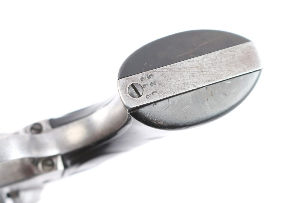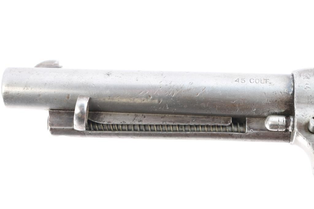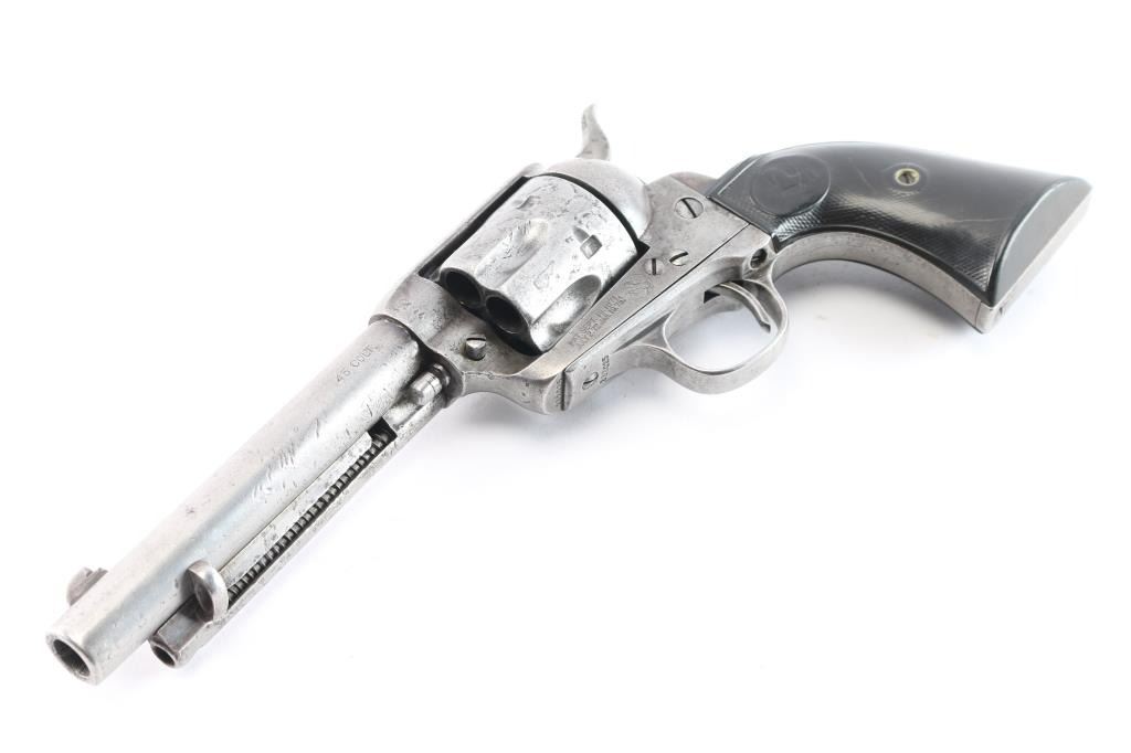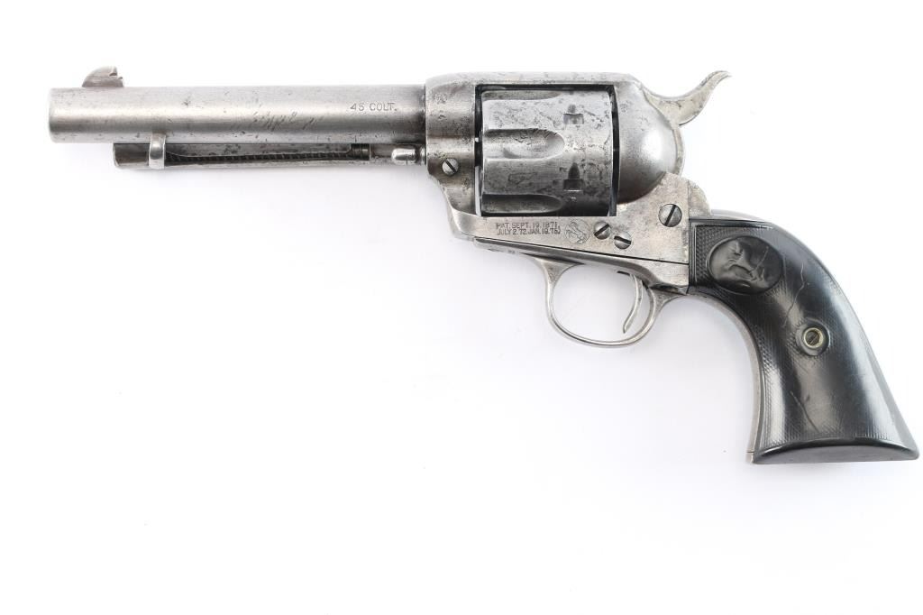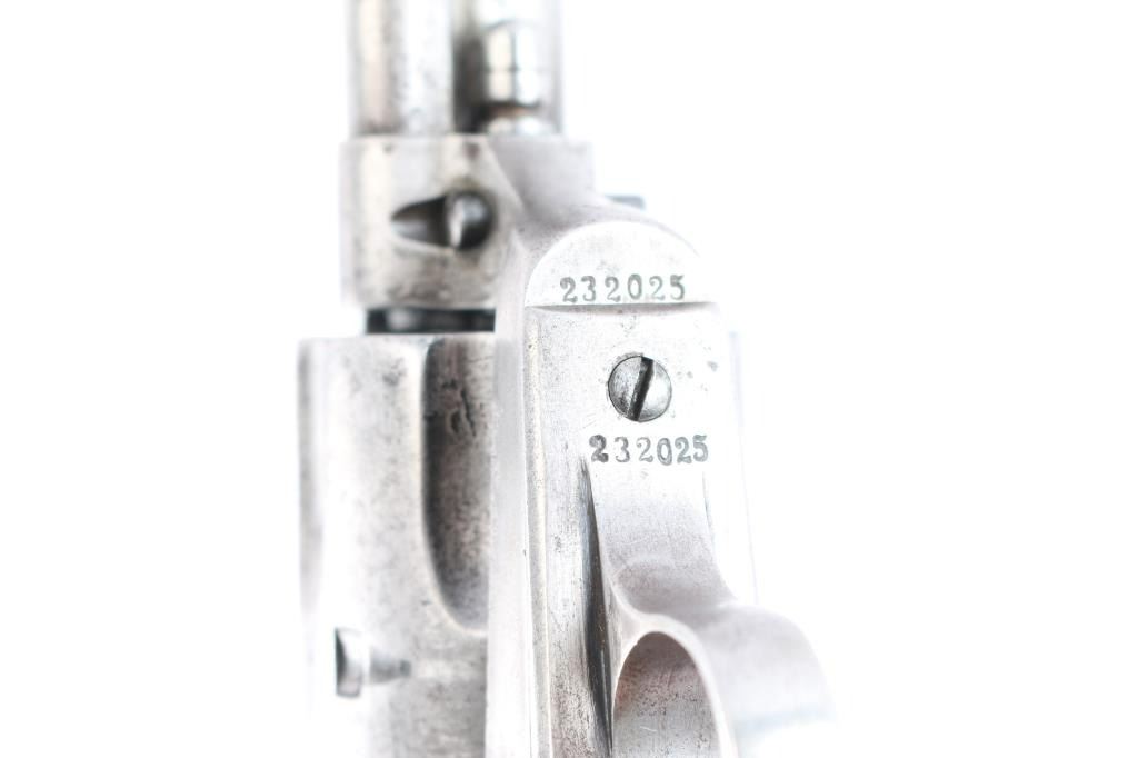 Colt S. A. Army Revolver 45 Long Colt Caliber, 5 1/2" barrel, gray patina finish, hard rubber grips #232025. Light gray metal surfaces with good markings and scattered light pitting and erosion. Grips are worn almost smooth and fit impeccably well. Marks on left side of barrel tube possibly from turning "barbed wire" tight like a wrench. The front sight has been slimmed and notched during period of use. 3 clicks on action with good bore, 2nd notch gone. All matching numbers. From an old collection and from the turn of century where records at factory often indicate Western shipment. Made about 1902.