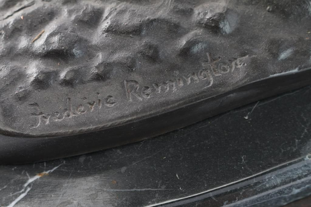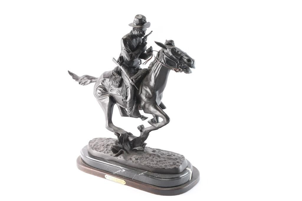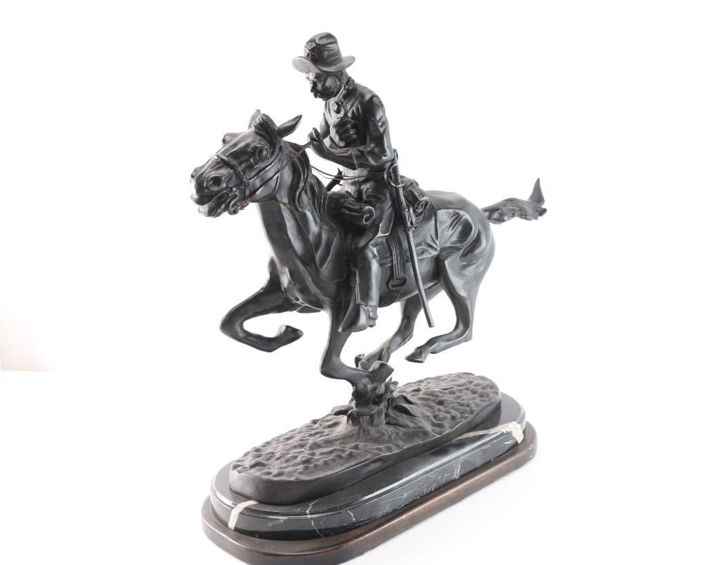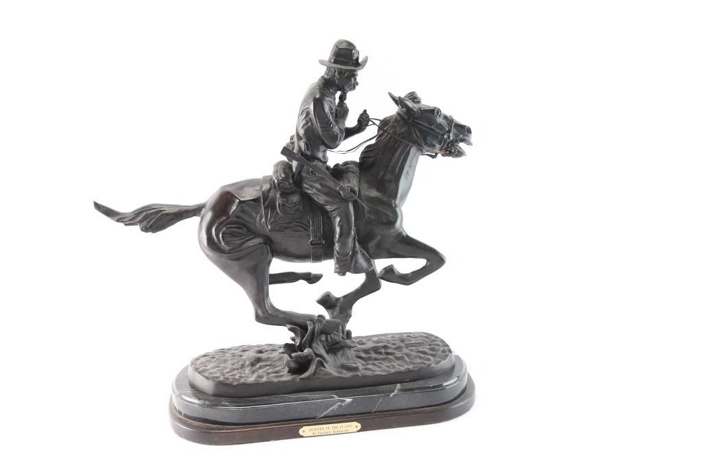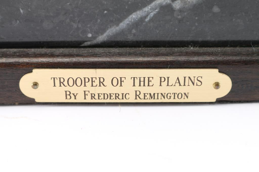 "Trooper of the Plains" restrike on marble base with brass title plate. Measures: 21-1/2"H x 32"W x 9"D. ***Local Pickup Only or Buyer Must Arrange Shipping***