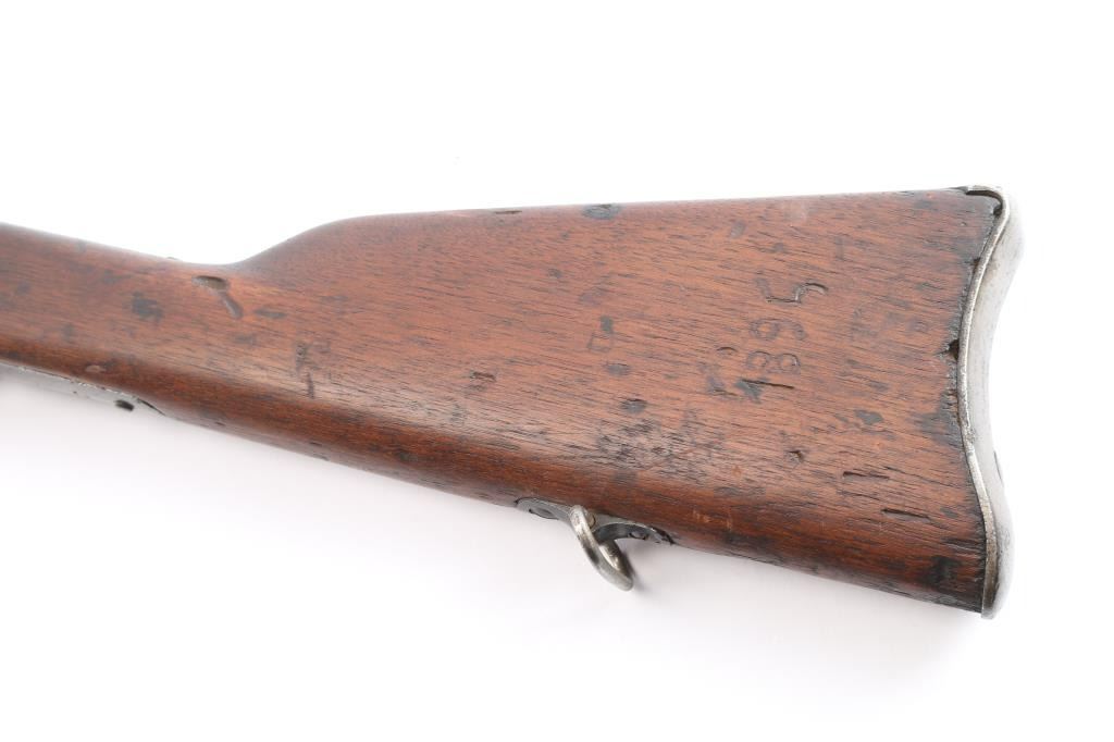 This rifle is unmarked except for the "P" on the lower left barrel and "(?)31" on the upper left tang under the butt stock and "137" on the lower tang. 35" barrel with blade front and No.1 adjustable rear sight, (Missing the slider),no bayonet lug. 3 barrel bands, sling swivels, crescent steel butt plate, cleaning rod. Action works well, the bore is dark/rough with worn rifling, the metal finish is in the white, there is some deep pitting along the barrel where it meets the forearm and the wood is sound with two slivers of wood gone on the top lower forearm forward of the action. "1895" carved in the lower left butt stock. Many of these Remington contract rifles that went to Spain and South American countries were scrubbed of markings when sold as surplus. Do not attempt to fire this rifle without bore cast and check by competent gunsmith.