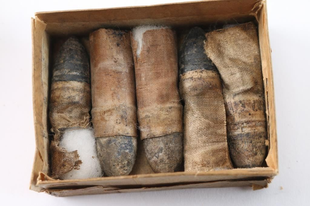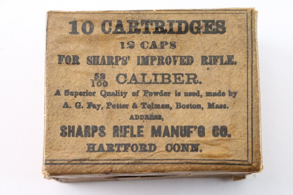 Rare Civil War ammunition artifact, is an opened pasteboard box of ten linen cartridges made specifically for the .52 caliber Civil War Sharps breechloading carbine. The brown-beige colored, paper-wrapped container is a two-piece box with thin wrap. Within the pasteboard box are five .52 caliber linen cartridges, 5 missing. One cartridge is intact with powder in place with the other four the black powder is missing and packed with cotton for appearance. The original brown paper wrap retains its printed label in black ink that reads: “10 CARTRIDGES / For Sharps’ Improved Rifle / 52/100 caliber / SHARPS RIFLE MANUF’G CO. / HARTFORD, CONN.” There is a separation on one corner of the lower box. There is a vintage label on the bottom of the box for John P. Lower's Sons, Denver, Colo. Entire box wears slight surface grime and has some light staining. Great display with your Model 1863 Sharps carbine.