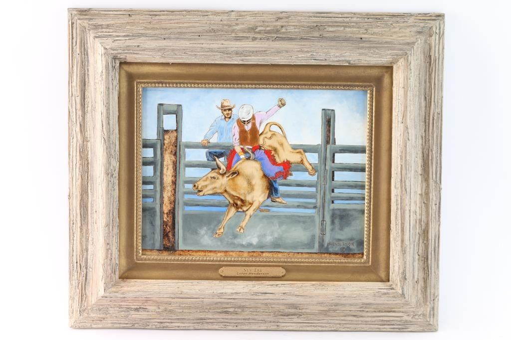 Titled "New Era", depicting a bull rider. Signed lower right, in gold and made-to-look-old wood frame. Measures 17 1/2" x 20 1/2".