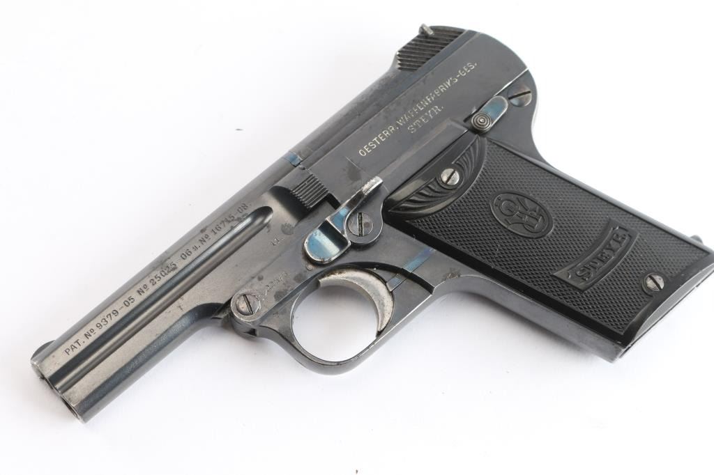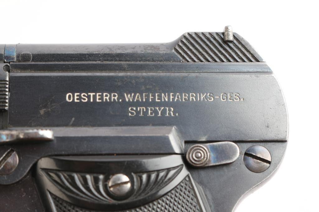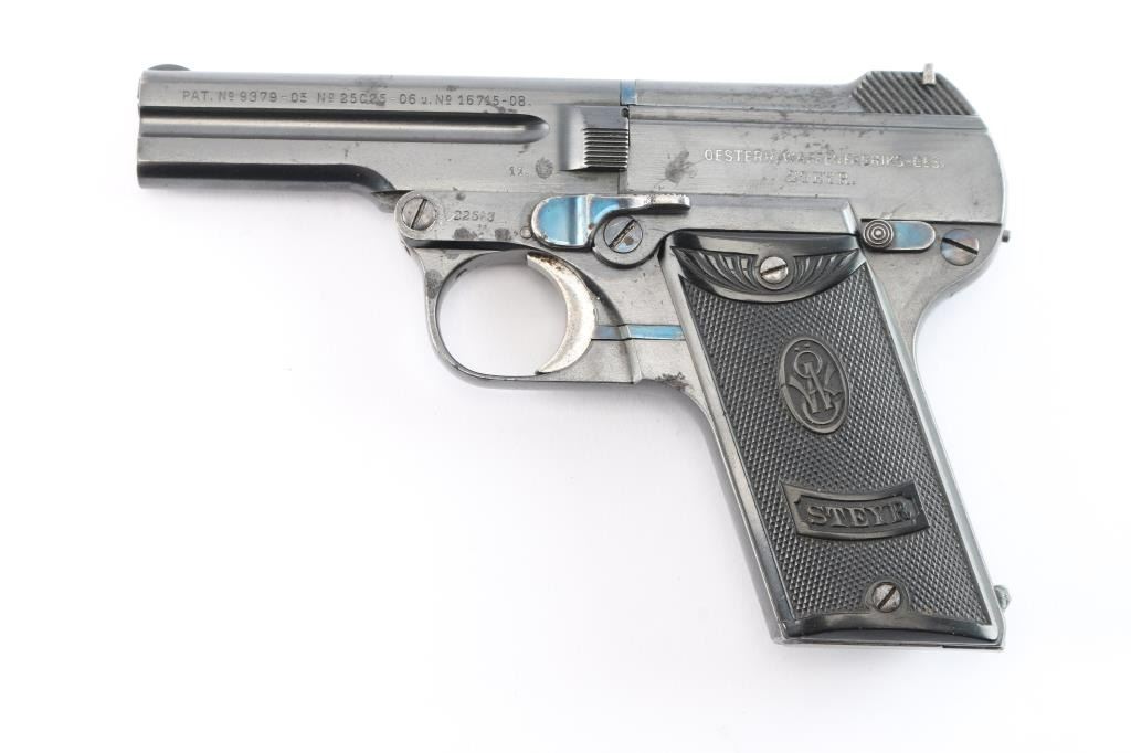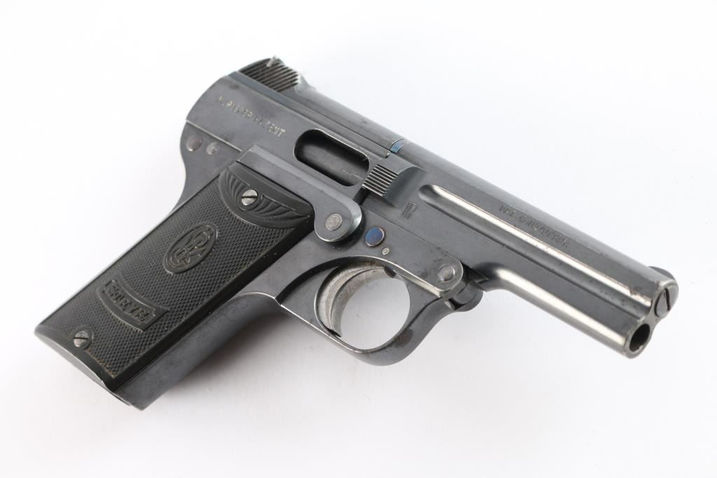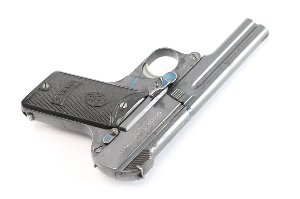 Unique blowback-operated single-action semi-automatic pistol chambered in .32 Auto. Manufactured in Austria for the commercial market circa 1911, using the patents of Nicolas Pieper of Liege. Approximately only 6,000 of these pistols were produced from 1909-1911 and 1919-1929. Features a blued finish with niter blued small parts, 3.62” ‘tip-down’ pivoting barrel, fixed low-profile round blade front sight, drift-adjustable ‘v’ notch rear sight, smooth curved trigger, concealed hammer, cocked indicator on the rear of the frame, heel magazine release, 7 round magazine, steel frame, and checkered hard rubber grips with Steyr motifs. Pistol retains approximately 90% of its original finish showing carry wear and scattered light rust/pitting. The action is mechanically sound, the bore is dull with good rifling & light pitting, and the grips are very good with some wear.