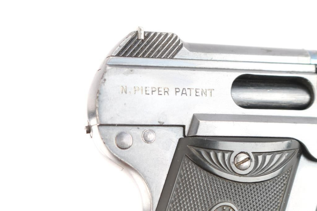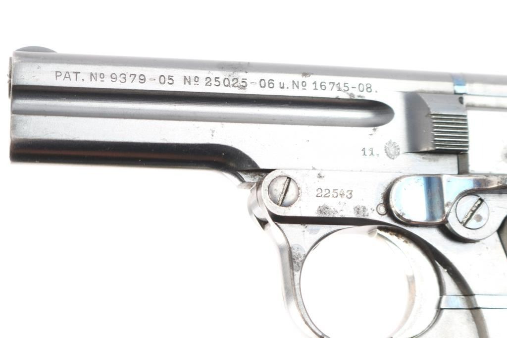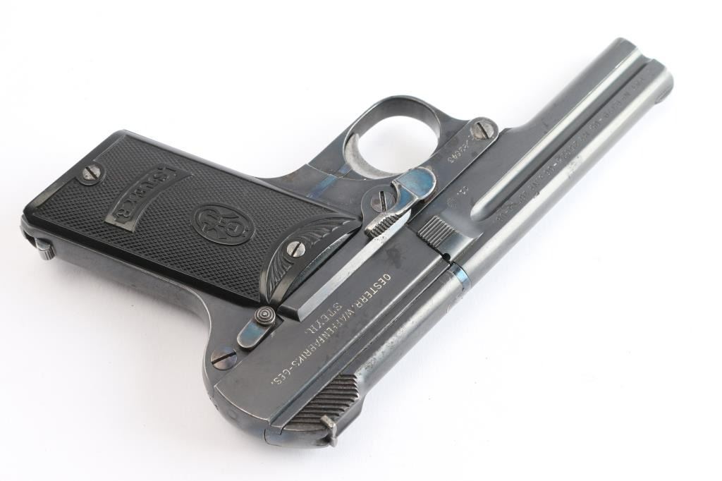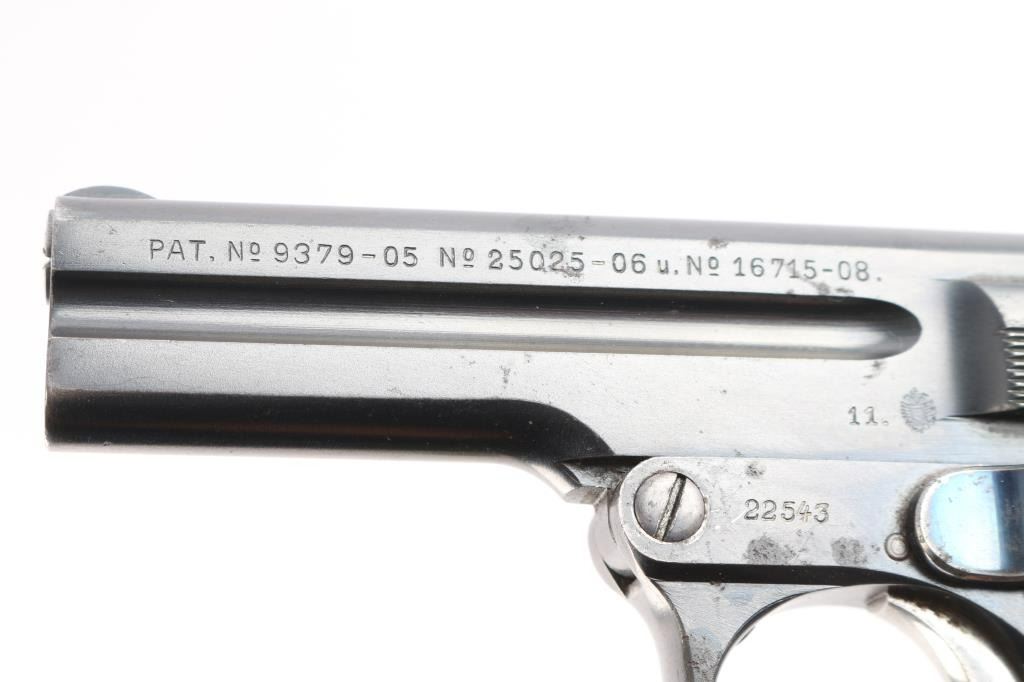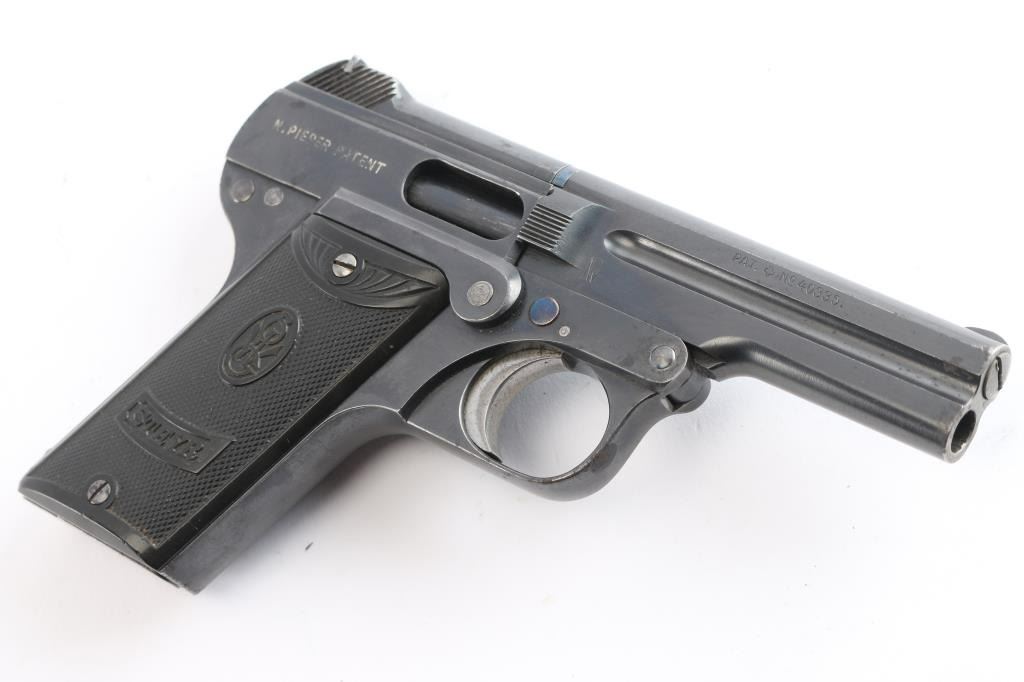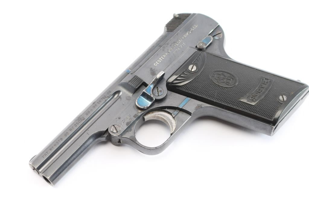 Unique blowback-operated single-action semi-automatic pistol chambered in .32 Auto. Manufactured in Austria for the commercial market circa 1911, using the patents of Nicolas Pieper of Liege. Approximately only 6,000 of these pistols were produced from 1909-1911 and 1919-1929. Features a blued finish with niter blued small parts, 3.62” ‘tip-down’ pivoting barrel, fixed low-profile round blade front sight, drift-adjustable ‘v’ notch rear sight, smooth curved trigger, concealed hammer, cocked indicator on the rear of the frame, heel magazine release, 7 round magazine, steel frame, and checkered hard rubber grips with Steyr motifs. Pistol retains approximately 90% of its original finish showing carry wear and scattered light rust/pitting. The action is mechanically sound, the bore is dull with good rifling & light pitting, and the grips are very good with some wear.