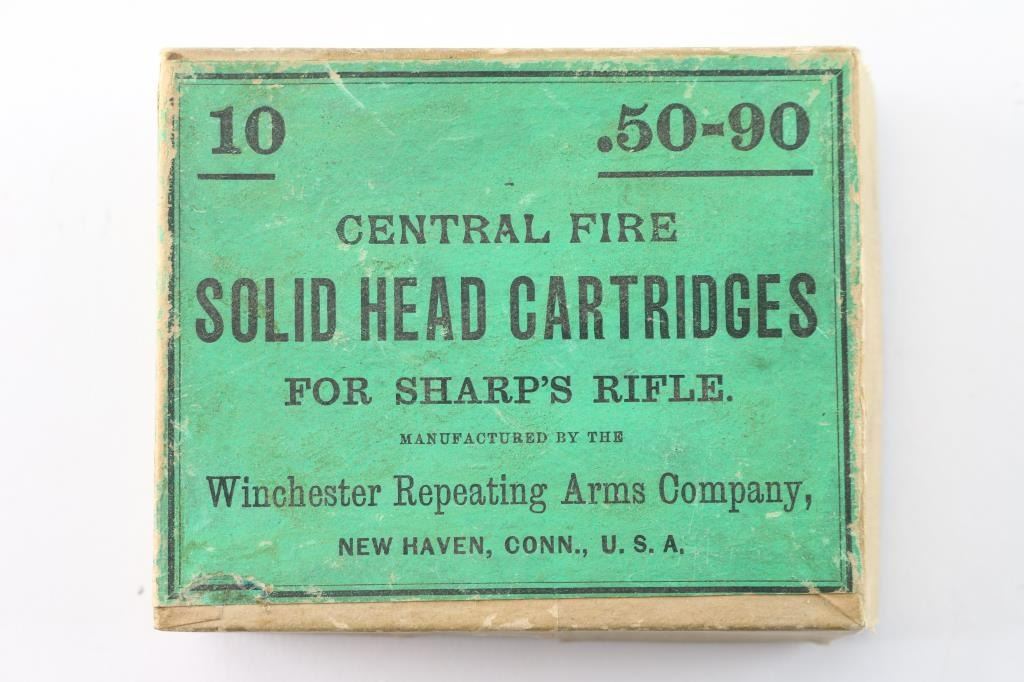 Vintage 'Green Label' box of 10 Winchester Sharps .50-90 cartridges. The 'Big Fifty' buffalo rounds. The top and side labels are intact/complete, printed guarantee on the bottom and inside label to use Winchester Primer No. 2 1/2 for reloading. The right side of the lid has separation. The 10 cartridges have no head stamps.