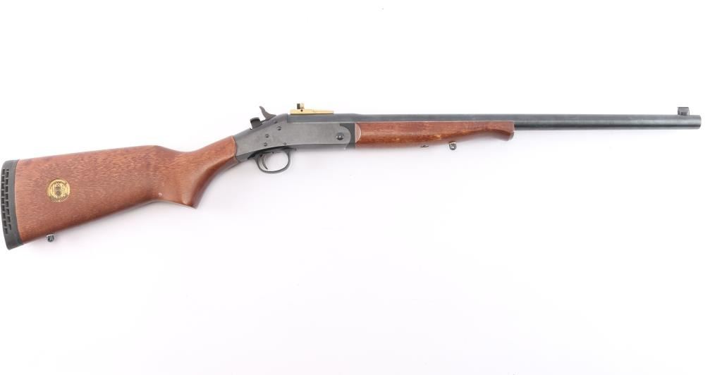 #nn257363. "H&R 1871 Handi-Rifle" refers to the modern line of single-shot rifles produced by New England Firearms after the original H&R went out of business. Modular break-open single-shot rifle with a .44 magnum chambered barrel. Features a blued finish, 22" medium-contour barrel with recessed crown with blade/bead front and Skinner brass plated rear peep sights, smooth trigger, knurled hammer extension, schnabel wood forend and semi-pistol grip shoulder stock with factory recoil pad, right side of stock has inletted brass disk reading "H&R 1871 Limited Edition". Rifle retains approximately 95% of its blued finish showing scattered handling marks/scratches. Barrel locks-up tight, the bore is excellent, wood stocks are very good/sound with some handling loss to the finish..