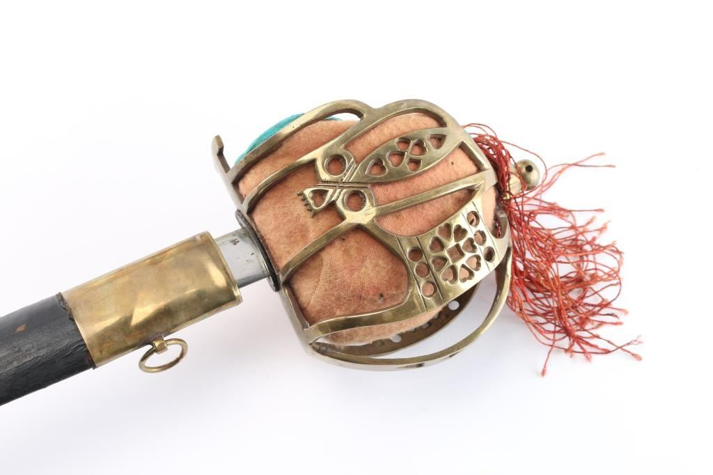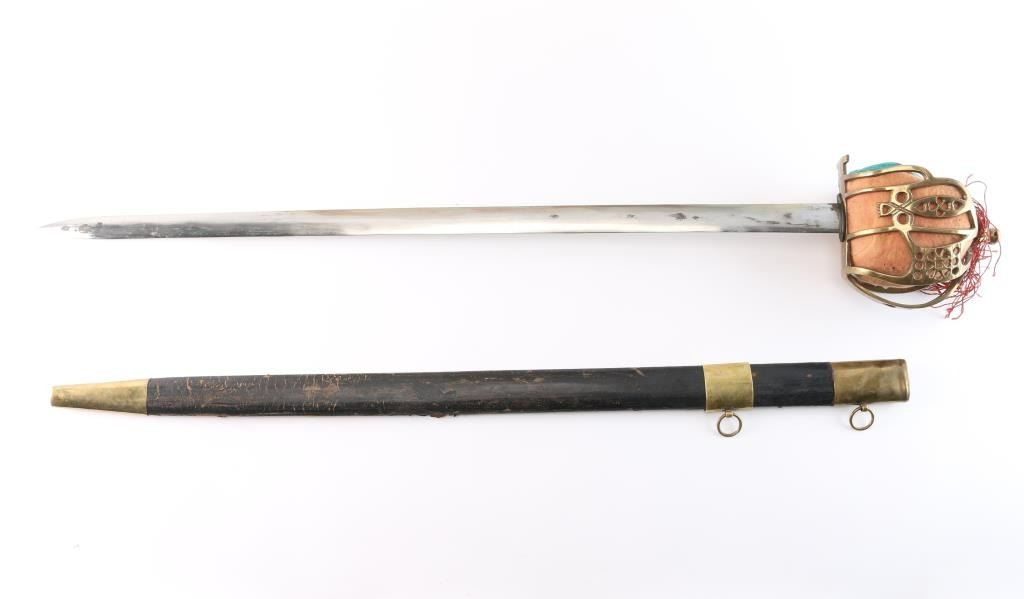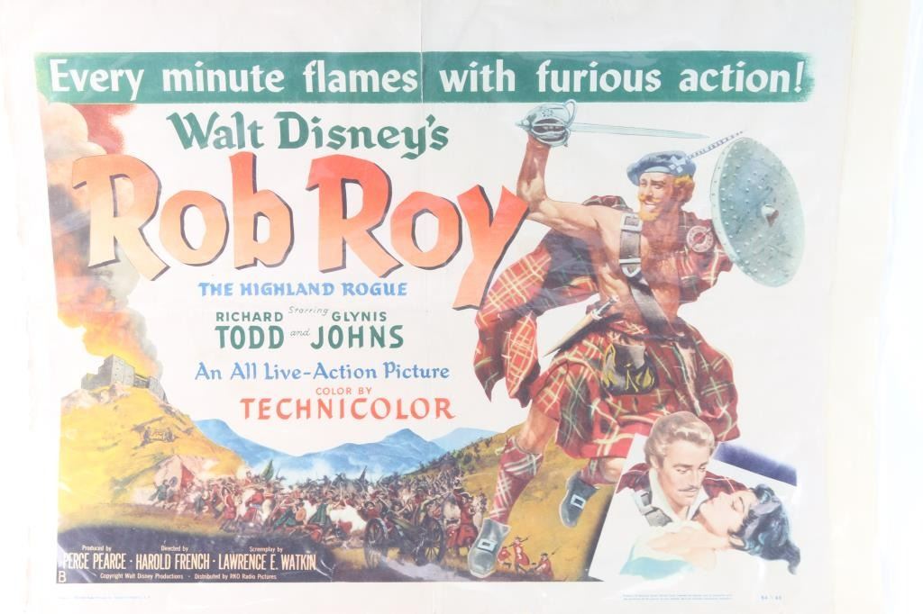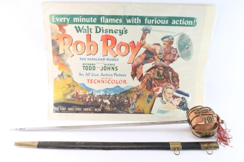 With scabbard, made for Disney production "Rob Roy" starring Richard Todd circa 1953. Also comes with an original movie poster, ID #54 of 83 (copyright RKO Studio and National Screen Services distributor marked. Measures approximately 22' x 30". The sword is in good condition with some wear to the scabbard and aging from carry and movie use. Poster is in good condition with normal fading adn aging. Formerly from the Joseph Musso Collection.