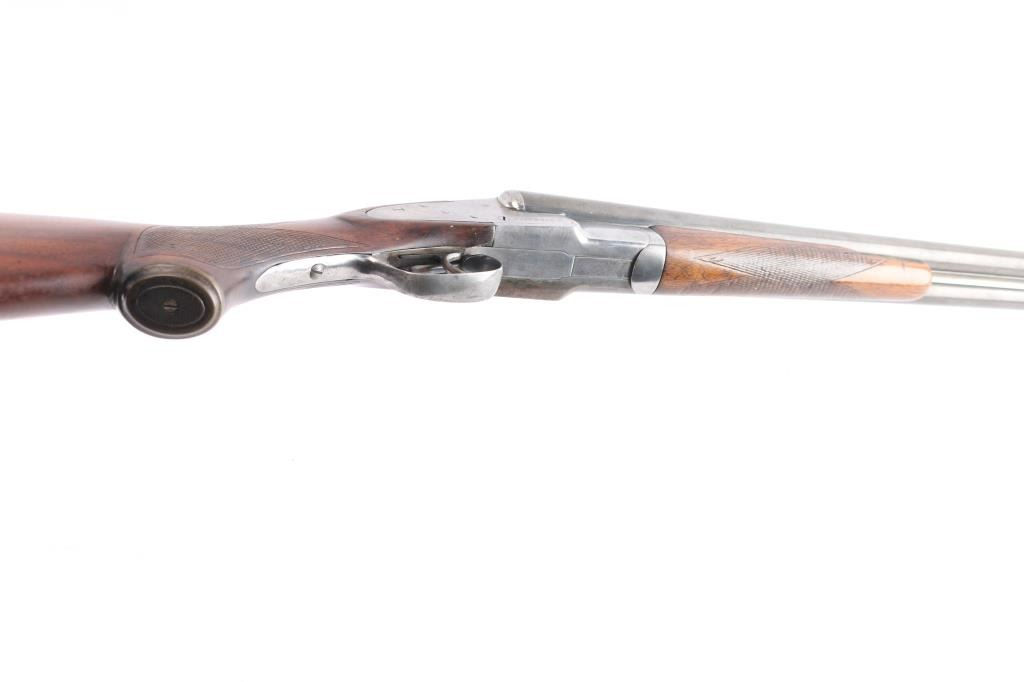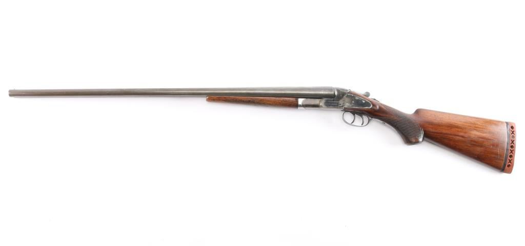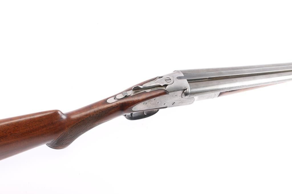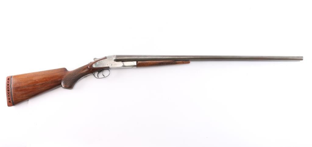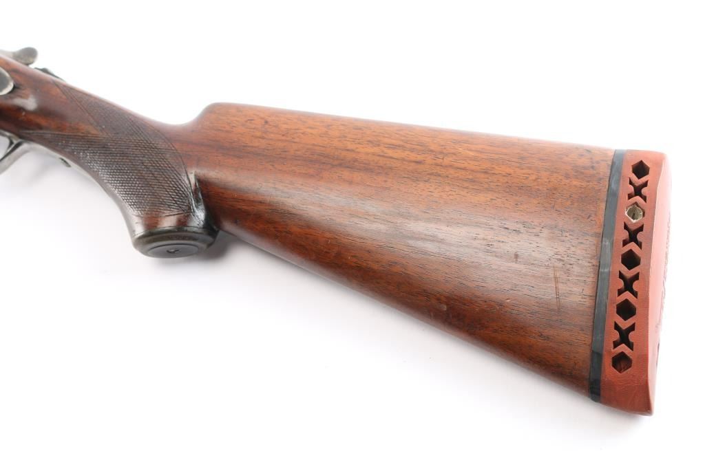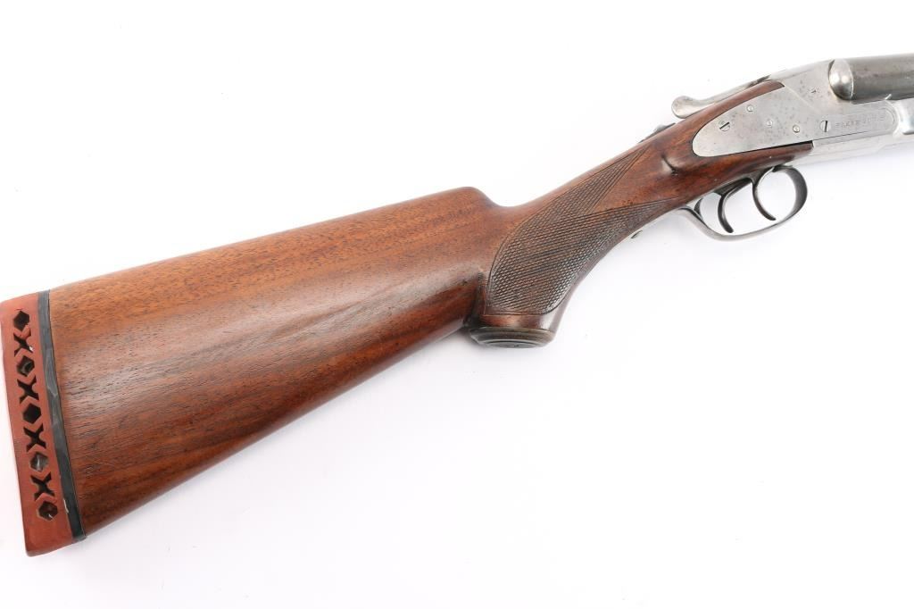 SN: 6089F. Vintage Baker Gun Go. Batavia Leader Sidelock Double Shotgun. Made by Baker Gun Co., Batavia, N.Y. circa 1920's. Considered to be one of Americas classic shotguns. 28" barrels, 2 3/4" chambers, brass sighting bead, low profile rib, double triggers, sliding tang safety, blue barrels, case colored action, top lever. American walnut checkered forearm and pistol grip buttstock with horn grip cap and vented Western Field recoil pad. Chokes measure Cyl-left, IM-Right. LOP-15 1/4"to front trigger. Bores are very good, barrels lock-up tight, wood is overall very good/sound with the exception of a slight hairline crack in the top of the forearm, the action is mostly in the white with traces of case colors and the barrels have turned mostly a gray/brown patina with blue in protected areas. comes with a vintage pair of brass 20 gauge inserts.