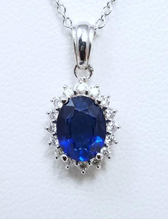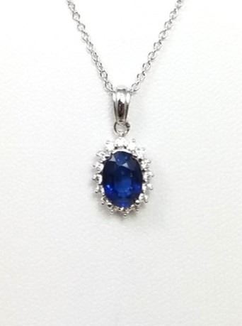 Brilliant EFFY Designer Blue Sapphire and Diamond Pendant featuring an oval cut vivid Blue Sapphire weighing approx. 1.50 carats framed with 16 round cut accent Diamonds weighing approx. 0.40 carats with G-H colors and VS/SI clarity set in a 14 karat white gold Halo setting.