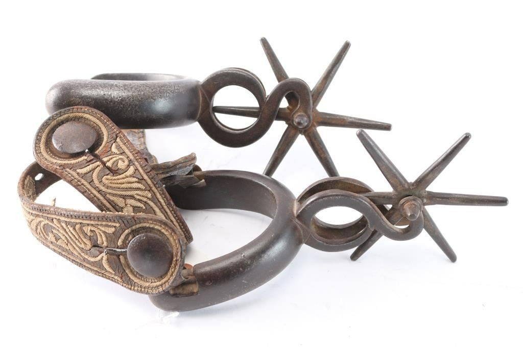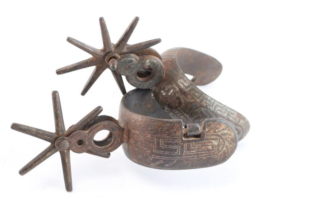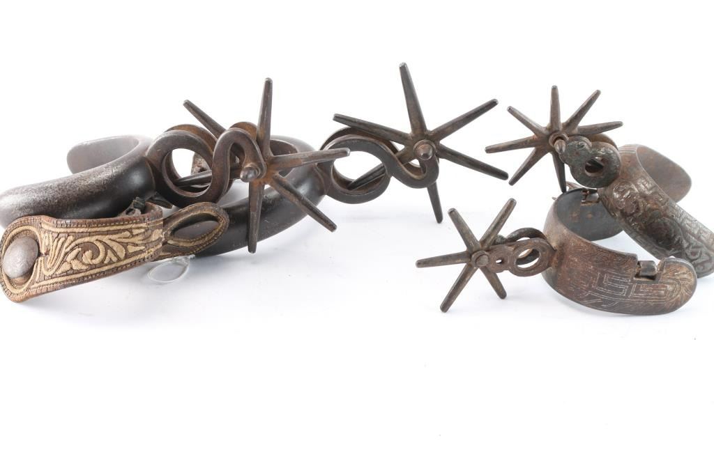 Heavy iron spurs, one pair without leather straps, but etched design in heel guards; the other with woven design in leather straps and large spurs with thick iron heel guards.