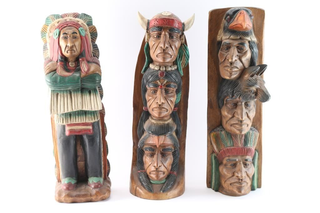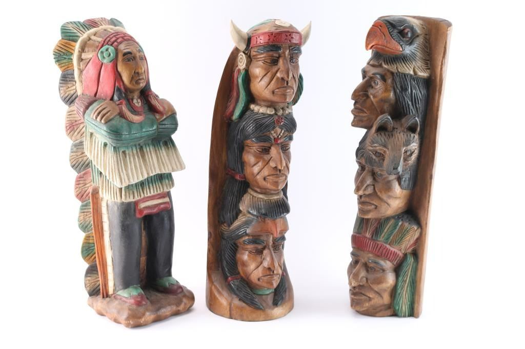 Includes: (3) Wood carvings of Native Americans. Two (1) carving has 3 Native American faces. (1) carving has 3 Native American heads, a wolf, and eagle. (1) carving of Native American with arms crossed. Each carving measures 20"H x 6"W x 5-1/2"D.