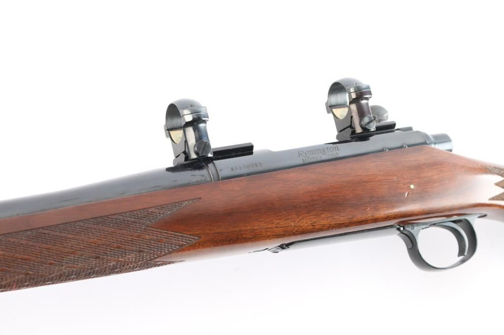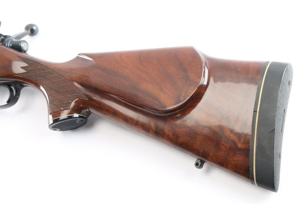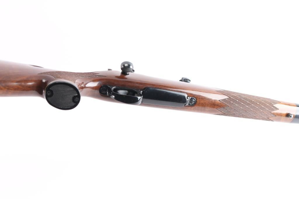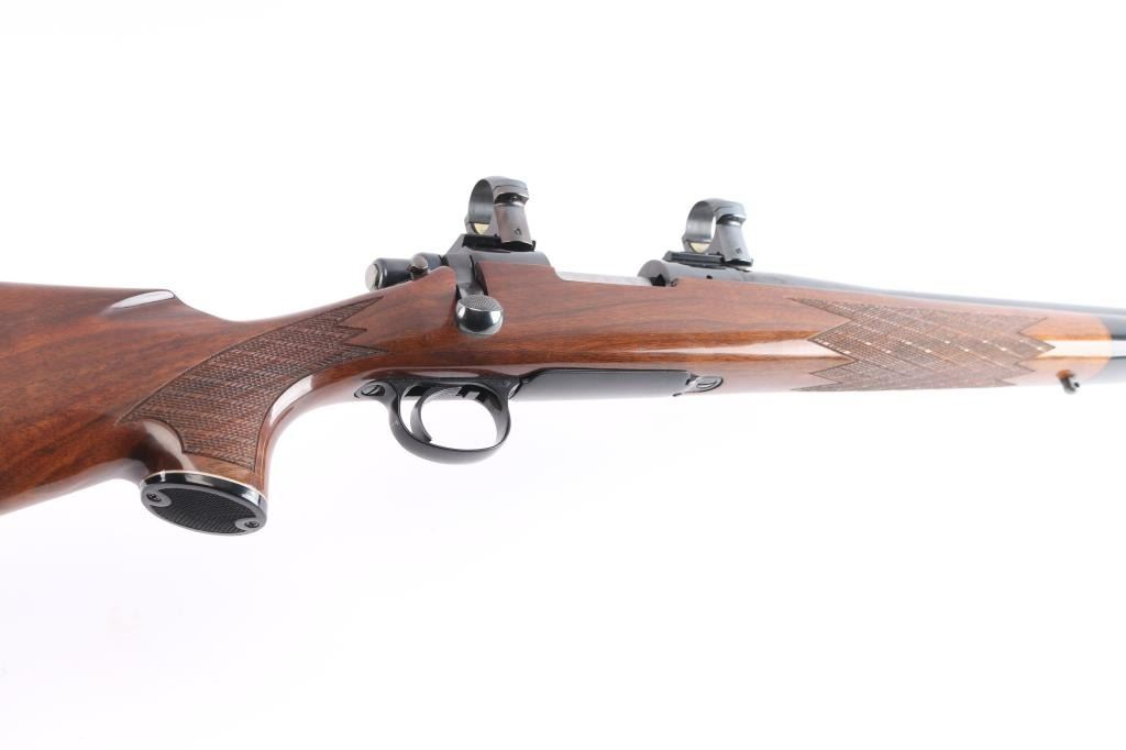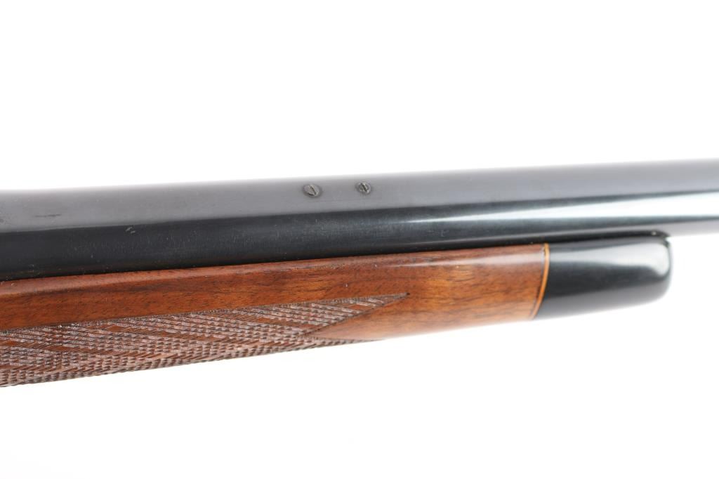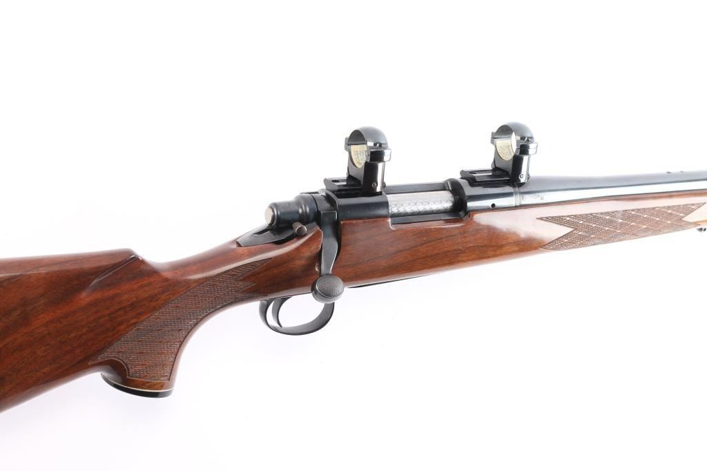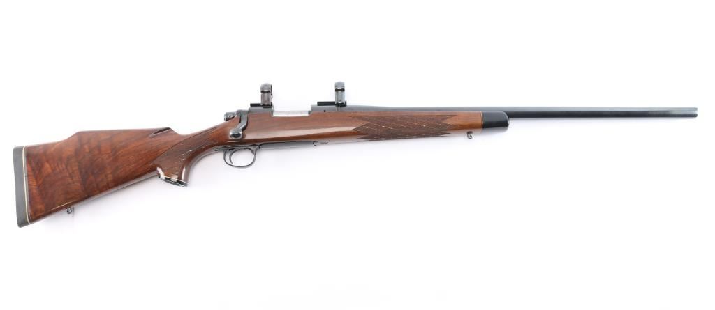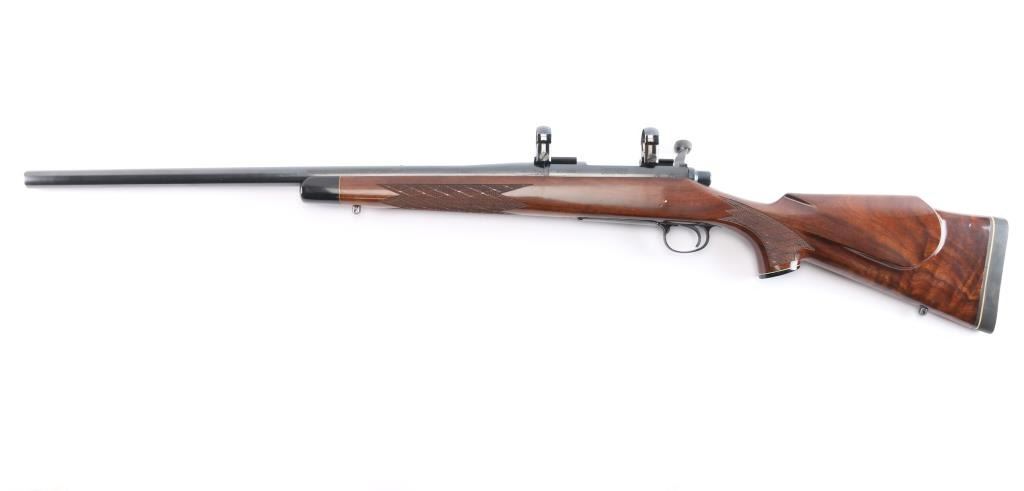 'Short Action' American bolt action sporting rifle. Features blued finish, walnut stock with checkered panels at wrist & forend, right hand cheek piece, solid rubber recoil pad, sling studs, grip cap, black forend tip. 24" medium weight barrel, no sights (plug screws in factory holes for mounting sights), Weaver type bases & rings (no scope), hinged floorplate, manual safety. Bore is bright. Retains 95% finish with handling marks. Stock is very good with minor blemishes, fancy figure and some fiddle grain showing on both sides of butt.