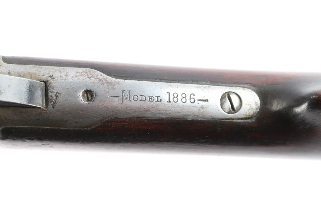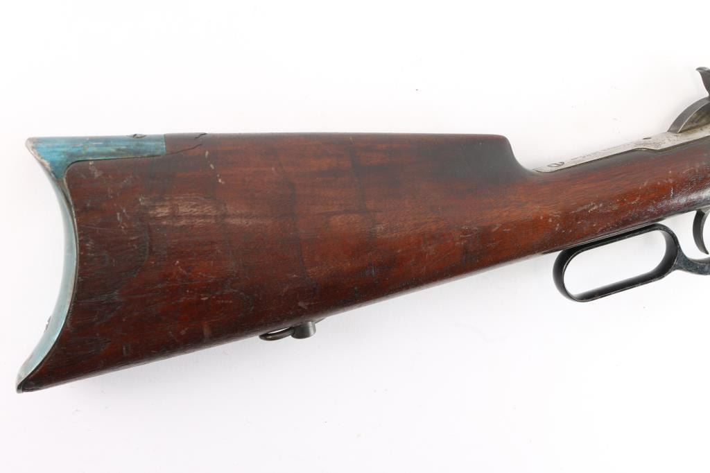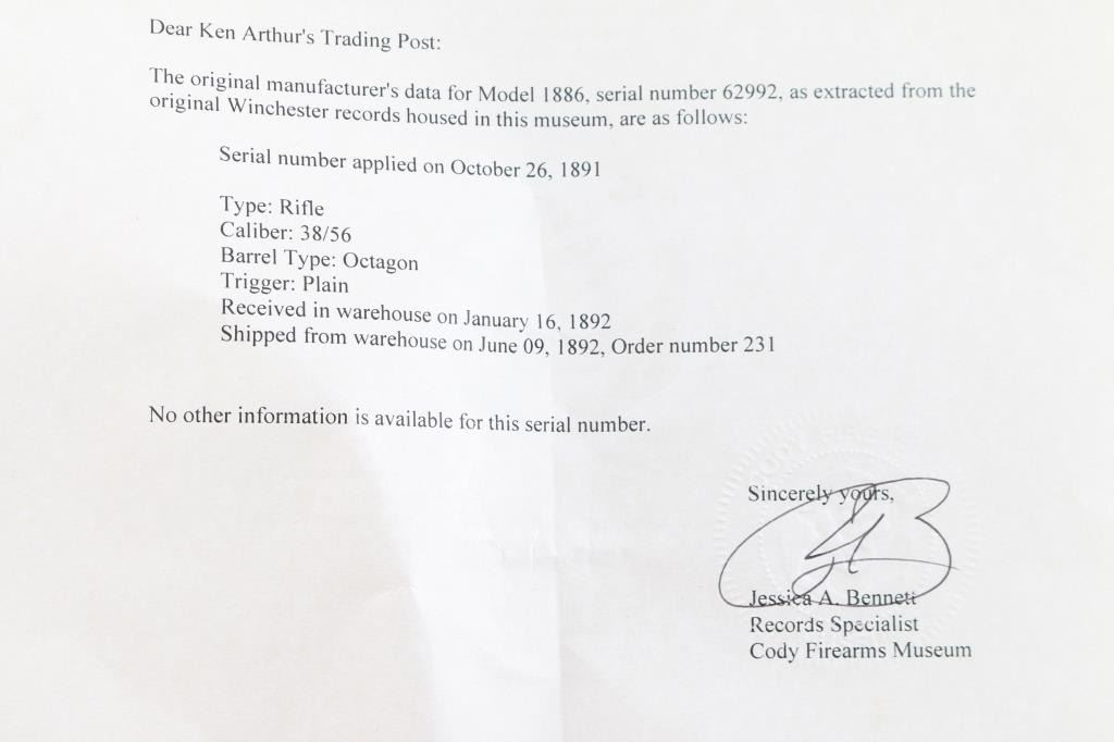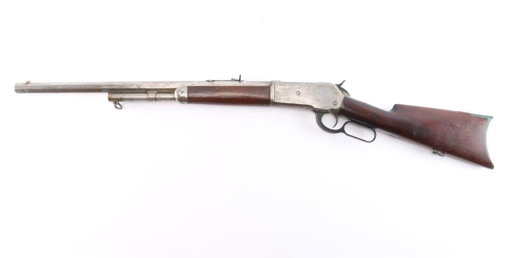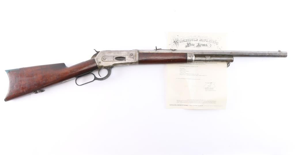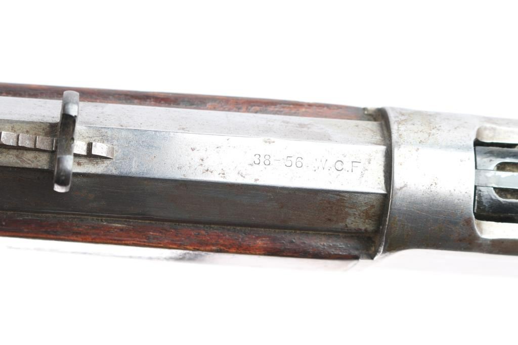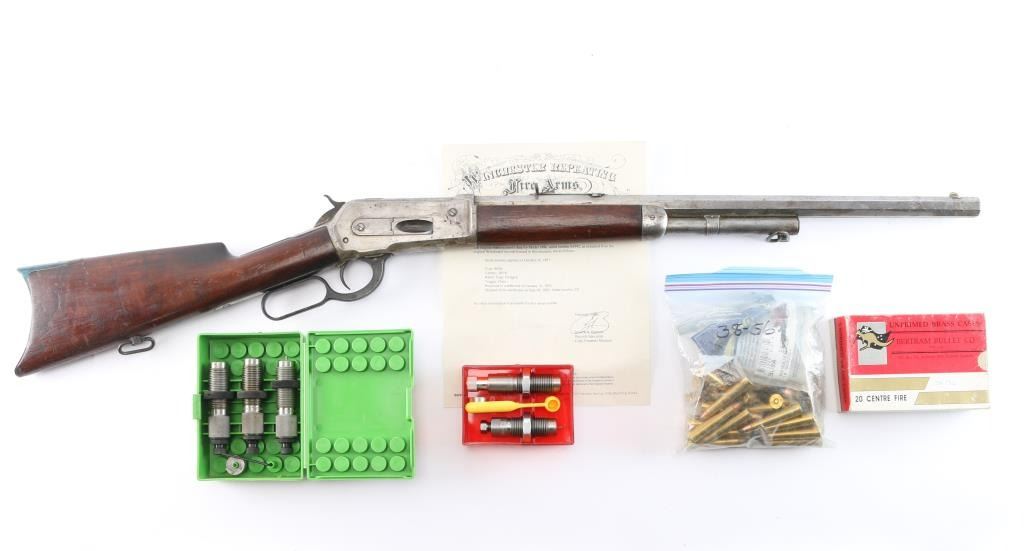 Antique large frame lever action repeating rifle chambered in .38-56 Winchester, manufactured circa 1890. This rifle has been modified into carbine configuration by shorting the barrel, magazine and forearm. The work has been done a long time age. Features a 22" octagon barrel, 13 1/4" tube magazine and 6 1/2" forearm. Dovetailed front sight with German silver blade, adjustable semi-buckhorn rear sight, smooth trigger, knurled hammer spur, smooth walnut forend with metal cap and straight grip shoulder stock with crescent metal buttplate, sling swivels are installed in stock and magazine tube, probably at the time of modification. Rifle exhibits a molted bright metal finish with scattered patches of brown patina, the lever, top of the bolt and the hammer have been painted in gloss black, action is smooth, the bore is fair to good/bright with rifling, scattered very light pitting and the wood stocks are overall good/sound with scratches/dings, have an old coat of varnish. Comes with a Cody Firearms Museum letter confirming this started out as a rifle, octagon barrel, and correct caliber. Shipped on June 9, 1892. Also included is a set of Lee 38-56 reloading dies, a set of Redding dies, a box of reloaded 38-56 cartridges weighting 5.6 lbs, a box of Magnus no.908 38/55 .378 Dia, bullets weighting 10.8 lbs and a small box of Barnes .375" 255 gr. FNSP .032" bullets.
