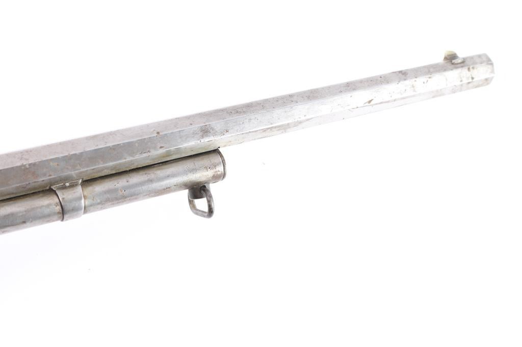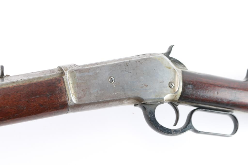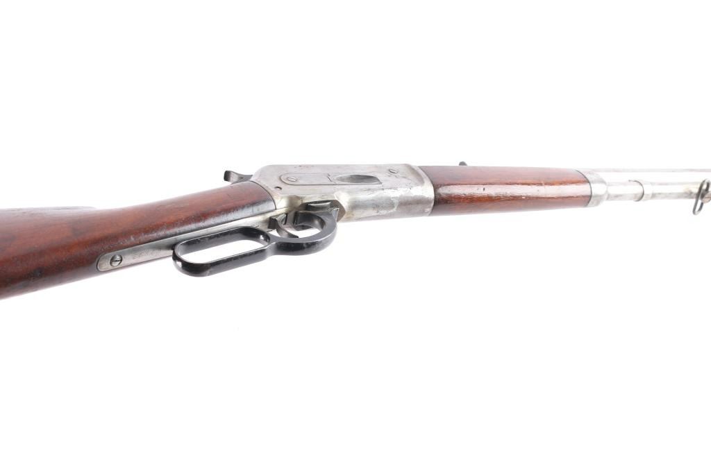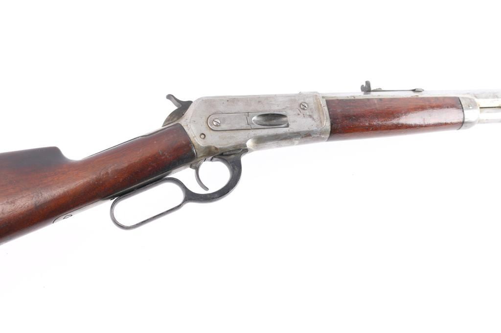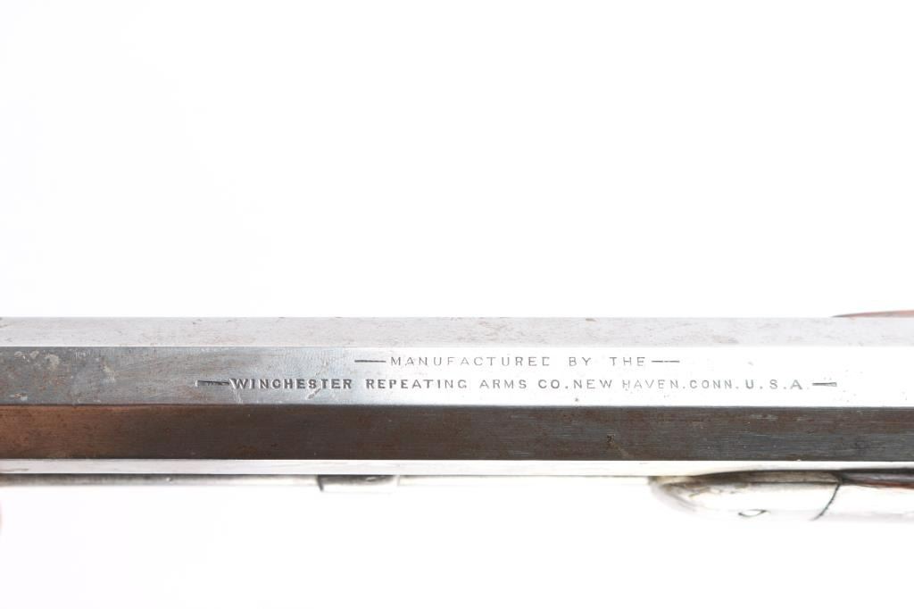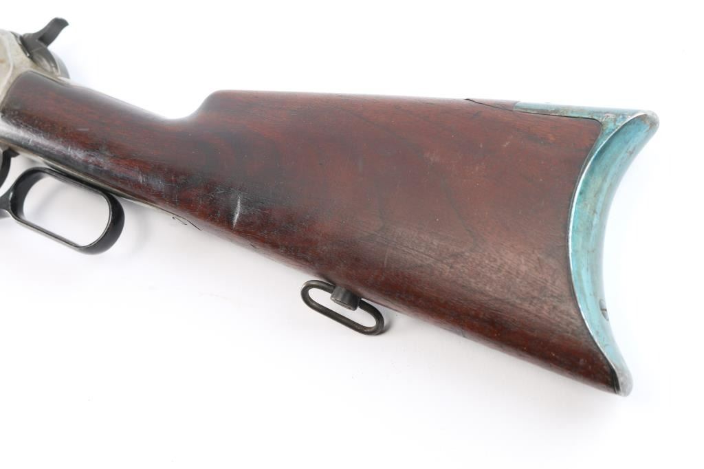 Antique large frame lever action repeating rifle chambered in .38-56 Winchester, manufactured circa 1890. This rifle has been modified into carbine configuration by shorting the barrel, magazine and forearm. The work has been done a long time age. Features a 22" octagon barrel, 13 1/4" tube magazine and 6 1/2" forearm. Dovetailed front sight with German silver blade, adjustable semi-buckhorn rear sight, smooth trigger, knurled hammer spur, smooth walnut forend with metal cap and straight grip shoulder stock with crescent metal buttplate, sling swivels are installed in stock and magazine tube, probably at the time of modification. Rifle exhibits a molted bright metal finish with scattered patches of brown patina, the lever, top of the bolt and the hammer have been painted in gloss black, action is smooth, the bore is fair to good/bright with rifling, scattered very light pitting and the wood stocks are overall good/sound with scratches/dings, have an old coat of varnish. Comes with a Cody Firearms Museum letter confirming this started out as a rifle, octagon barrel, and correct caliber. Shipped on June 9, 1892. Also included is a set of Lee 38-56 reloading dies, a set of Redding dies, a box of reloaded 38-56 cartridges weighting 5.6 lbs, a box of Magnus no.908 38/55 .378 Dia, bullets weighting 10.8 lbs and a small box of Barnes .375" 255 gr. FNSP .032" bullets.