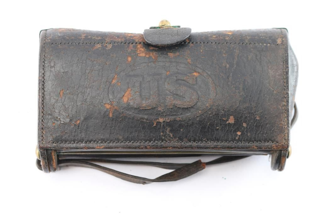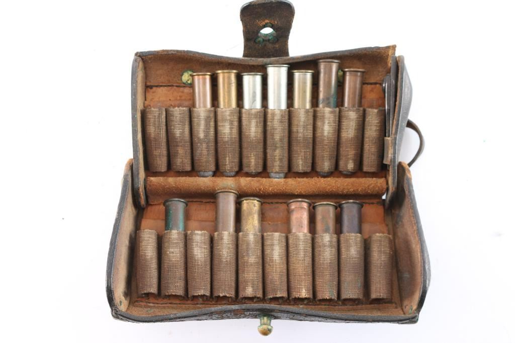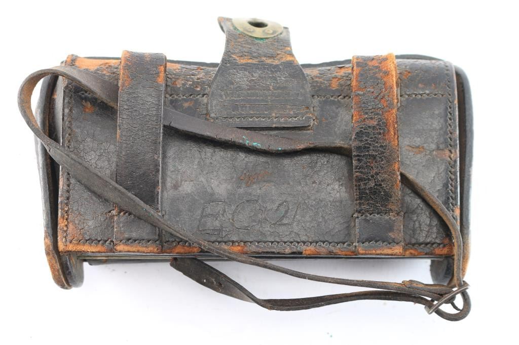 For rounds and rifle tool (included). 13 loaded military round also included. Fair to good condition. Some leather flaking and frontier type wear. The estate collection of John Kopec.