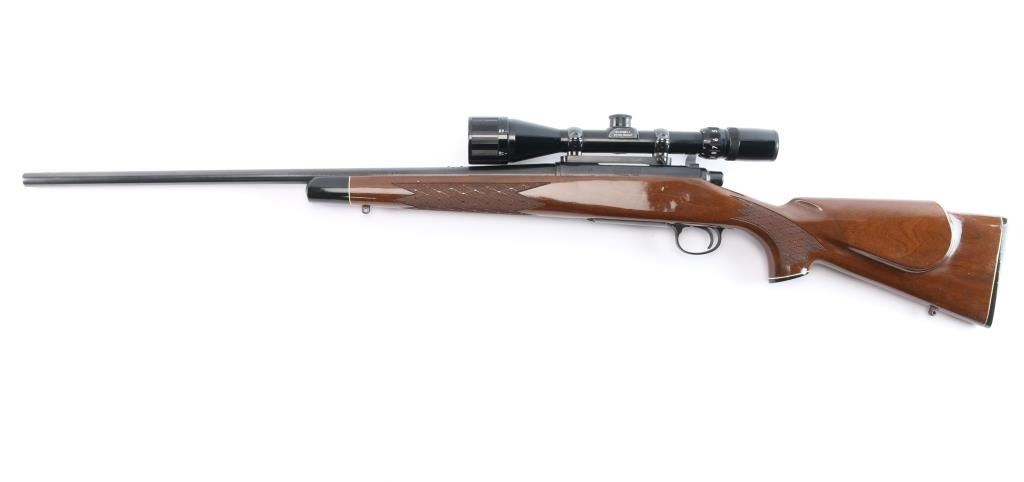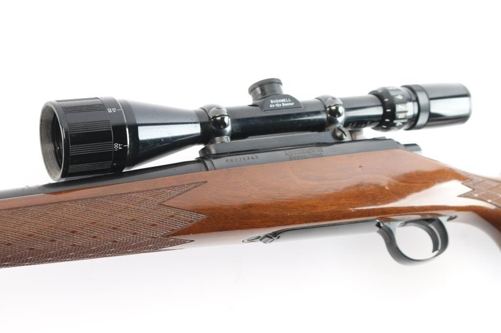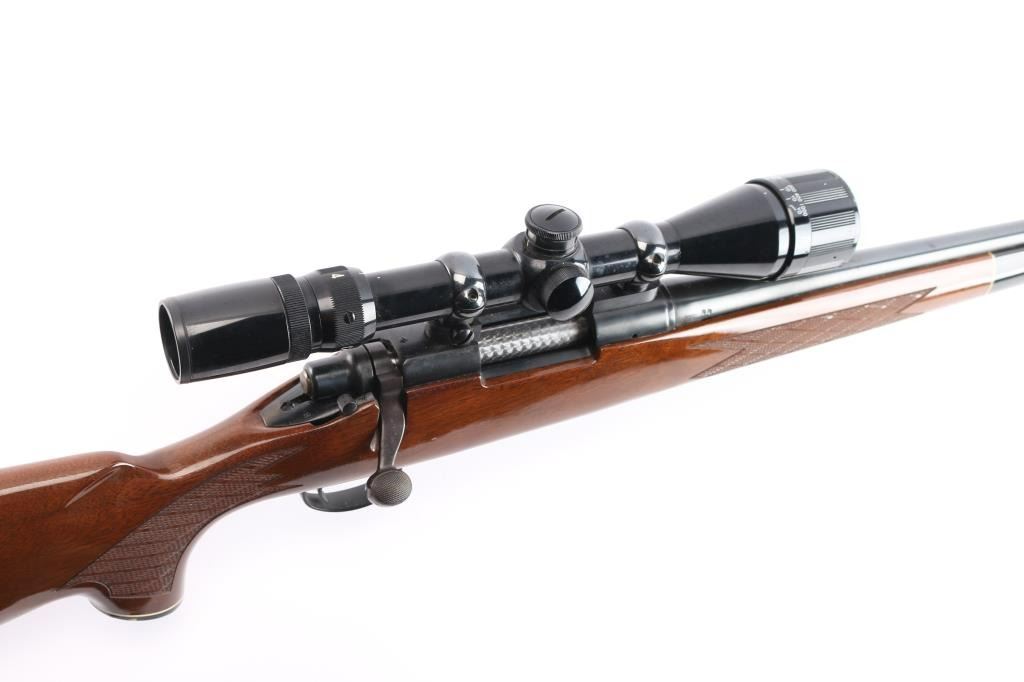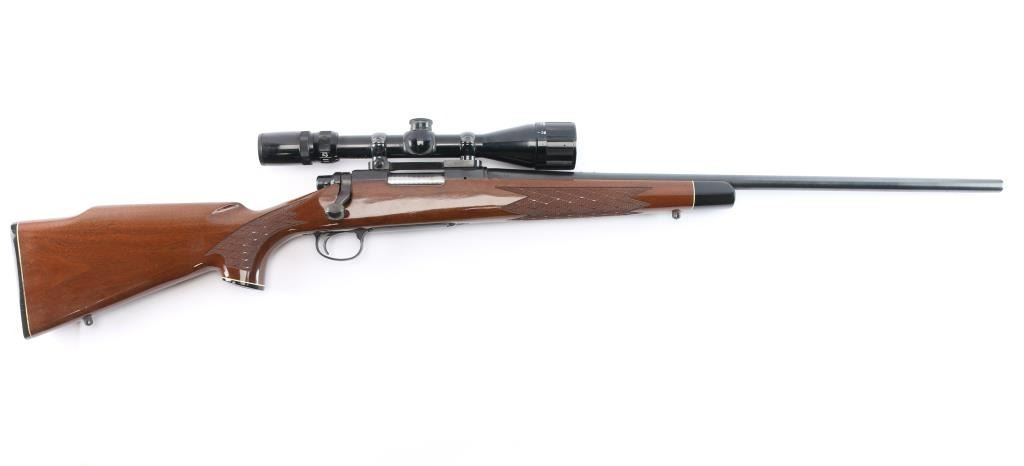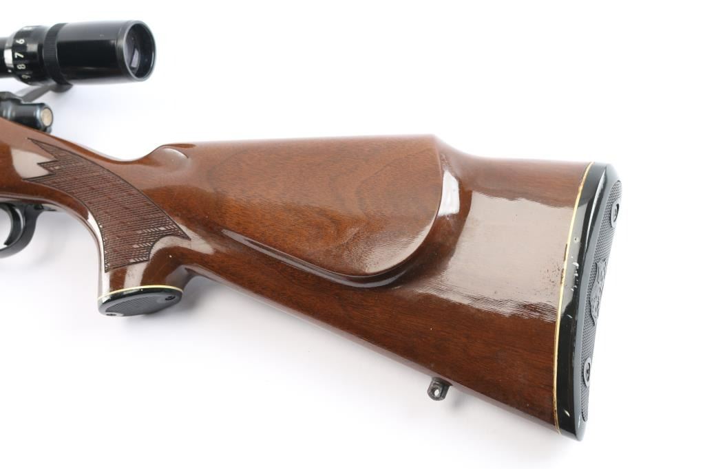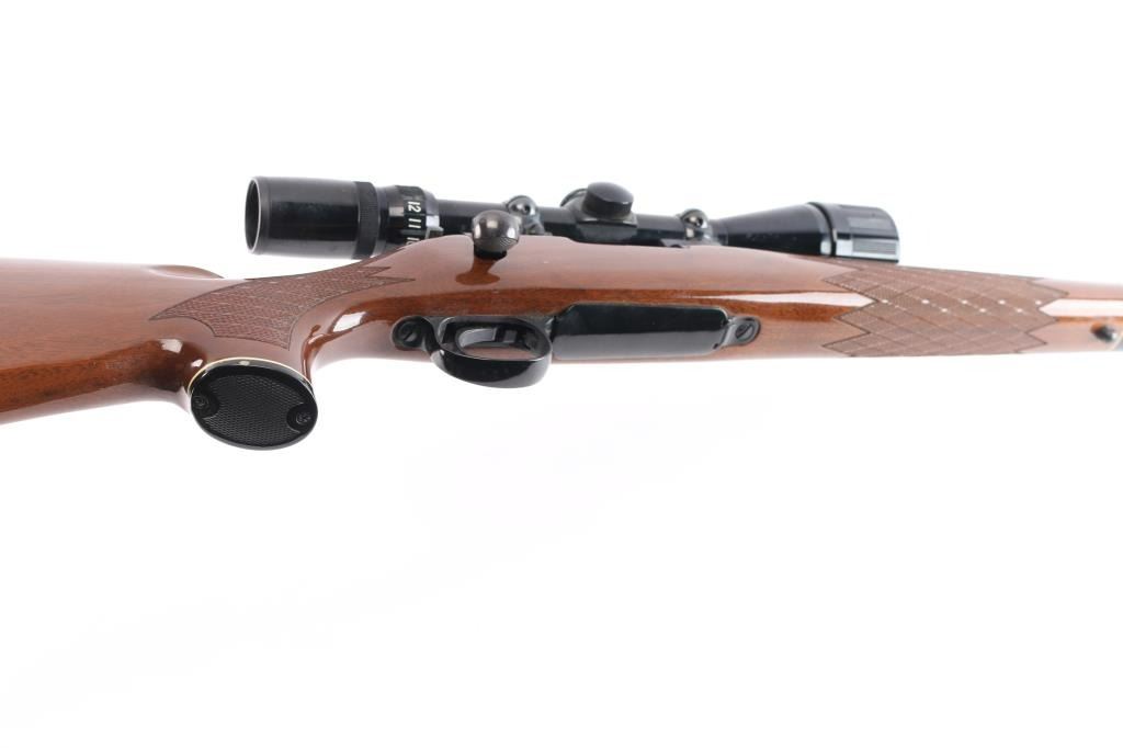 'Short Action' American bolt action sporting rifle. Features blued finish, wood stock with checkered panels at wrist & forend, right hand cheek piece, factory butt plate, sling studs, grip cap, black forend tip. 24" tapered barrel, no sights (plug screws in factory holes for mounting sights), hinged floorplate, manual safety. Mounted with a Bushnell Banner 4-12x scope with duplex reticle, adjustable objective lens, clear optics. Bore is bright. Retains 95% finish with handling marks. Stock is near excellent with few minor blemishes.
