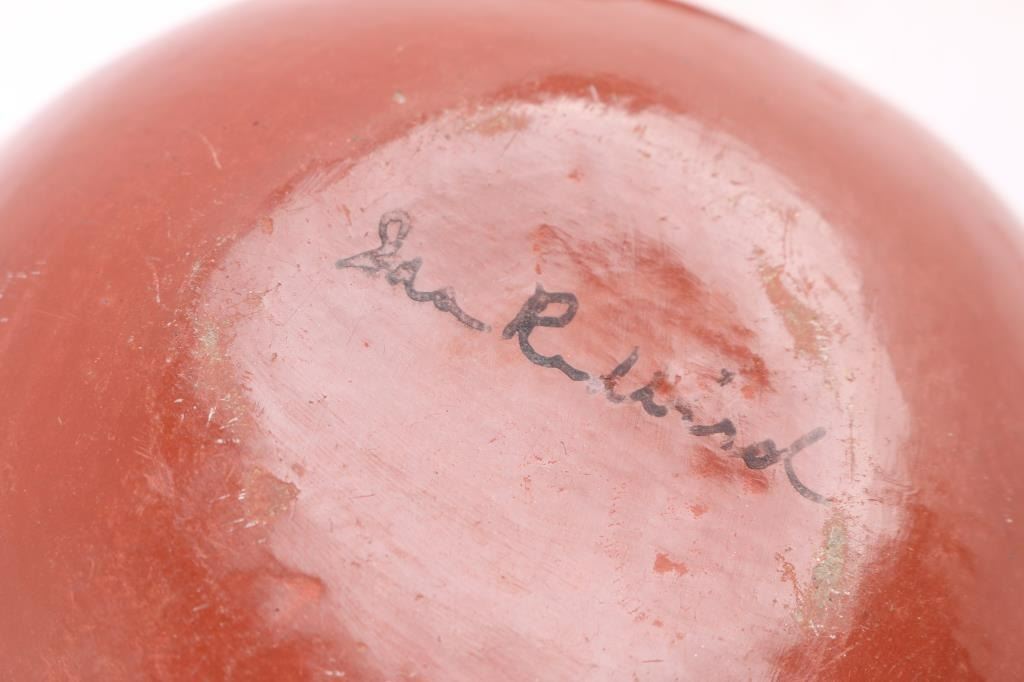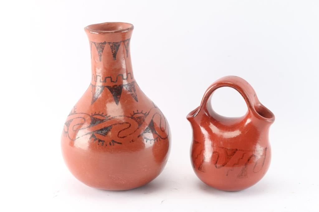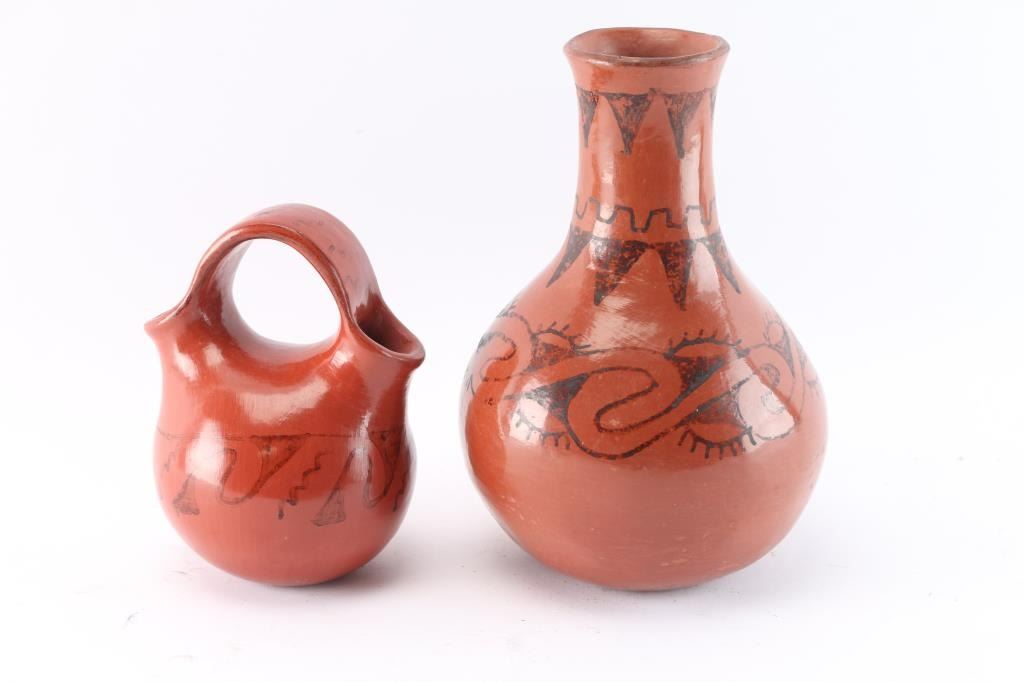 One is a thin neck vase by Sam Redbird, signed on bottom, measuring 7 3/4" by approximately 5 1/2" wide. The second is a wedding vase signed B. J. on bottom, measuring 5 1/2" tall by 4" wide.