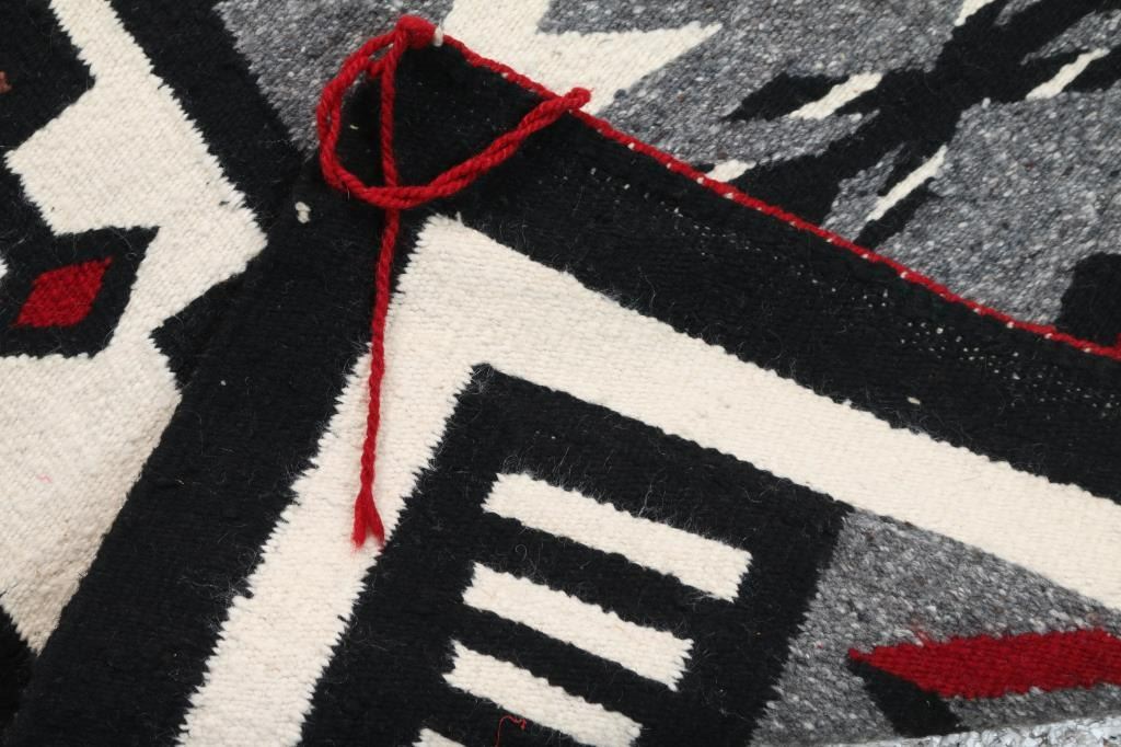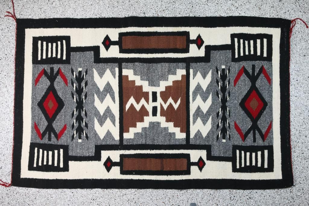 In red, black, and white. Maize and geometric design, 39"X64", light staining, otherwise good.