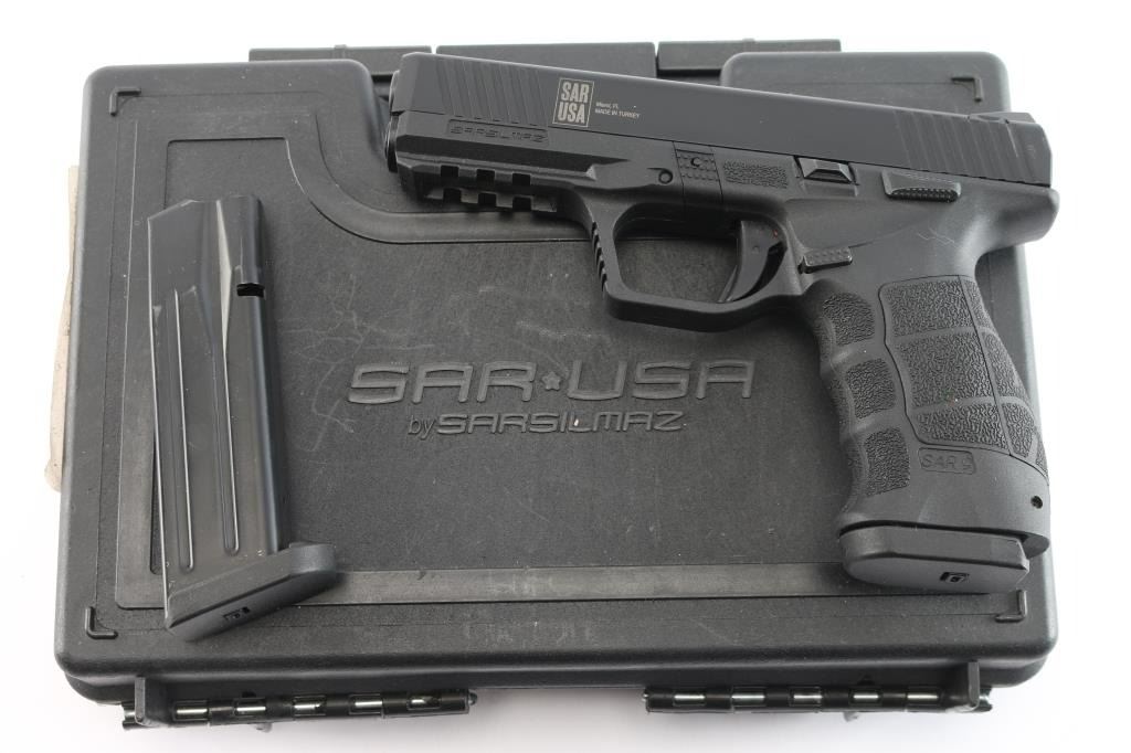Turkish made striker fired semi-automatic full-size pistol chambered in 9x19mm. Imported by SAR USA Miami, FL. Features matte black finish, 4.4" barrel, 3 dot white sights, polymer frame with accessory rail & replaceable backstraps, polymer trigger with integral safety, frame mounted ambidextrous safety. Includes the original factory hard case with manual, cleaning tools, two additional backstraps with side plates, (2 total) 17 rd magazines. Gun is new.