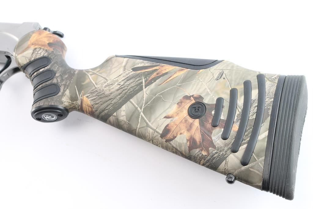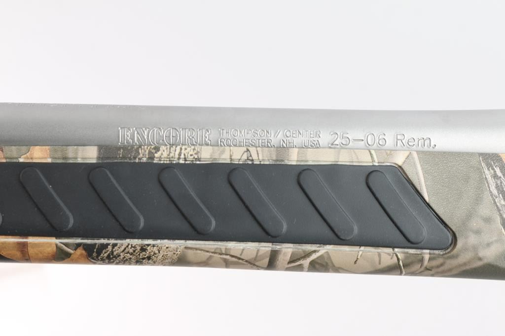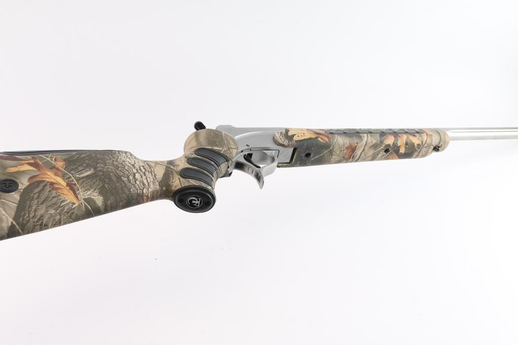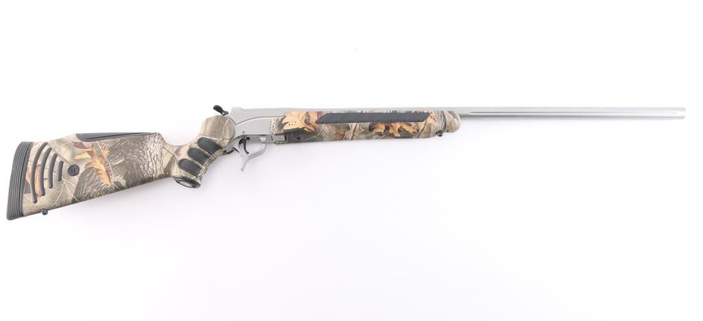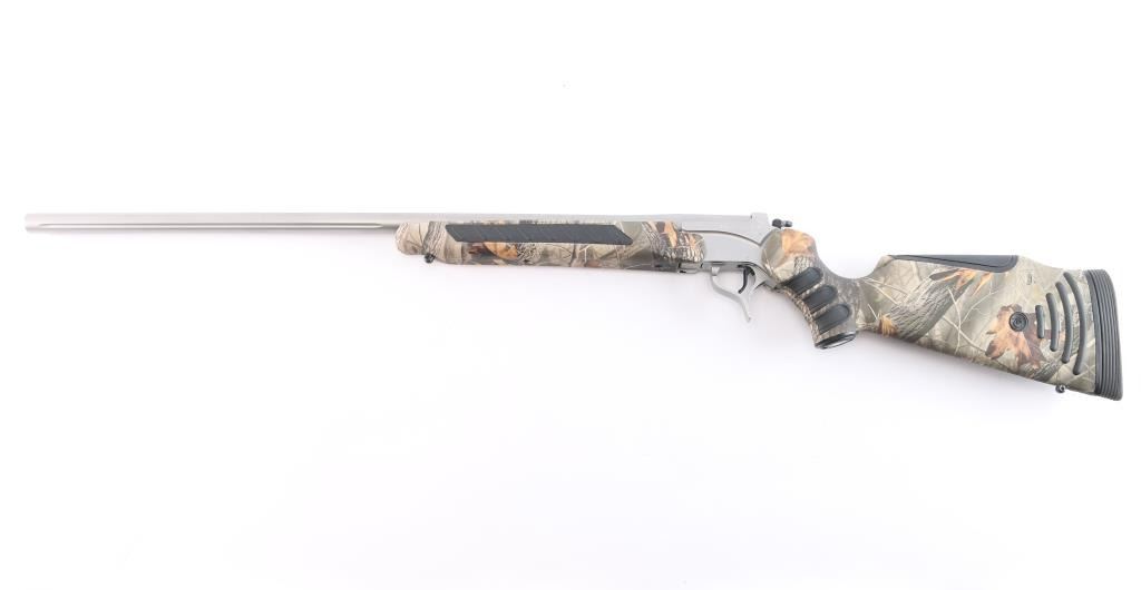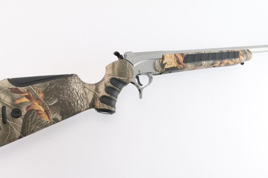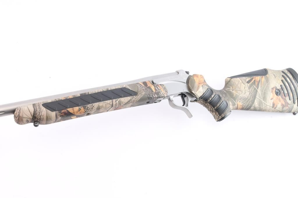 Sn: #582069. Single shot, break-barrel rifle in .25-06 Remington. Satin stainless steel construction, 28" partially fluted barrel with no provision for sights, back of barrel drilled and tapped for optics with set screws, angle-adjustable knurled hammer spur and smooth semi-curved trigger, 'Realtree hardwoods' camo hydrographic film covered synthetic pistol grip stock and forearm with grip panels on wrist & forearm, LimbSaver black rubber recoil pad, sling swivels studs. Bore is pristine. Retains approx. 98% finish with no visible losses, synthetic surfaces are excellent. NRA Condition is excellent - like new. ***Modern Firearm***.