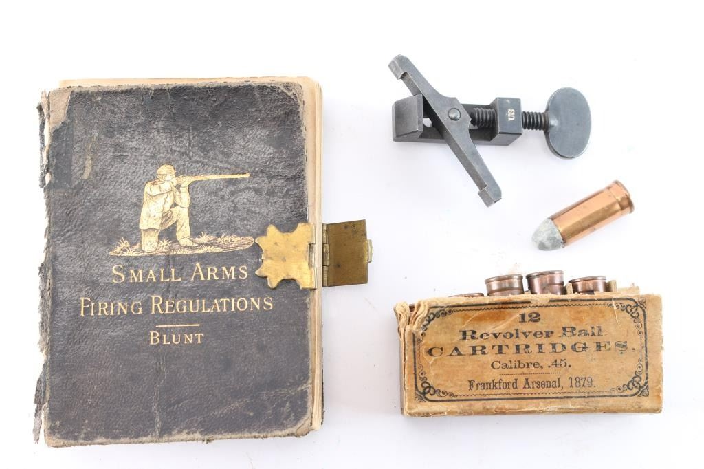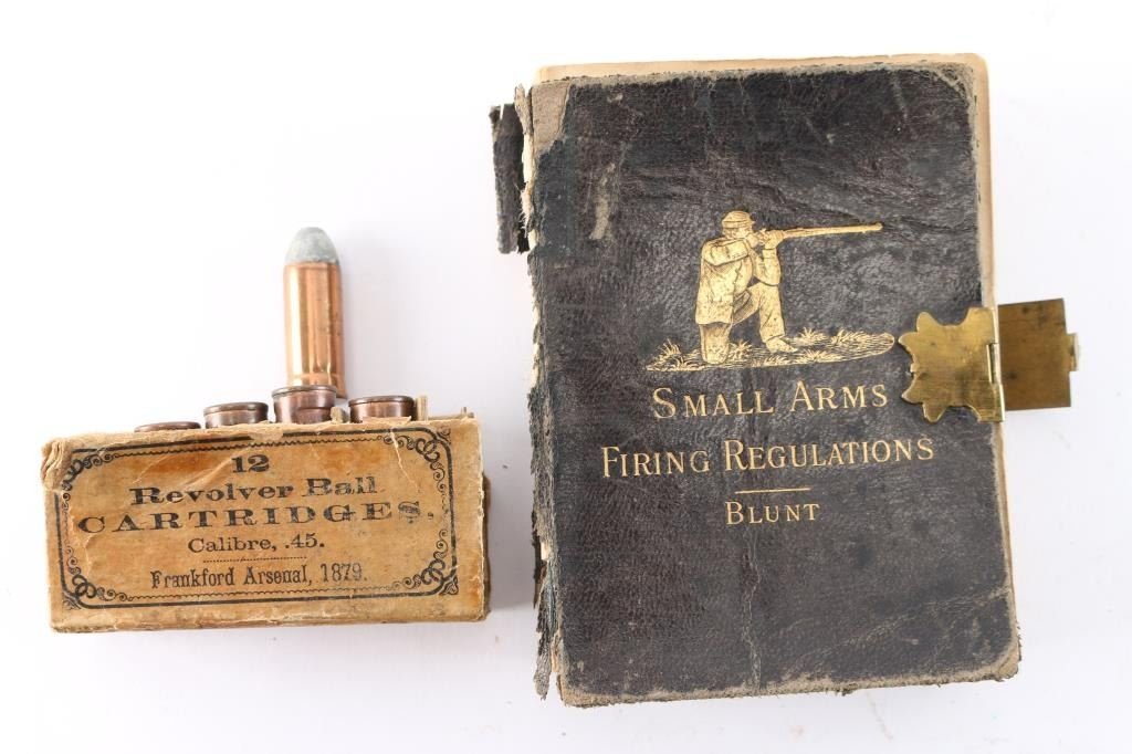 Made cartridges in fragmenting box with no labels on top. Internal primed copper case. Along with minty U.S. marked spring V.SE probably for trapdoor. Small arms regulations pocket book by Blunt. The estate collection of John Kopec.