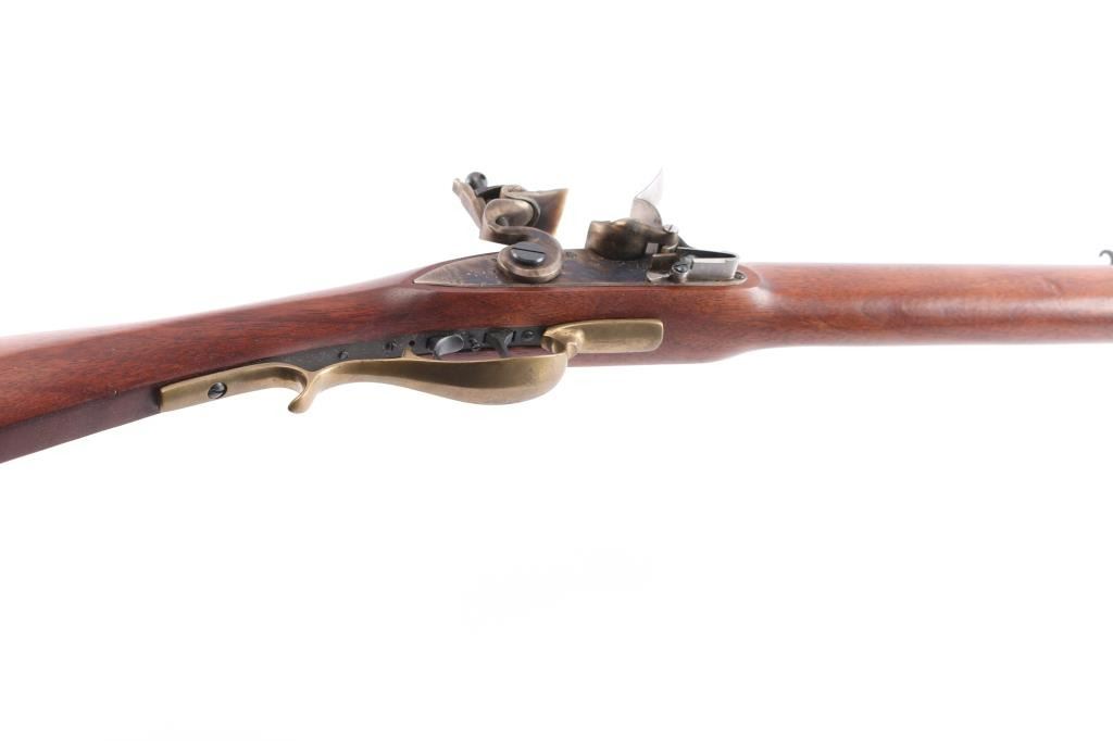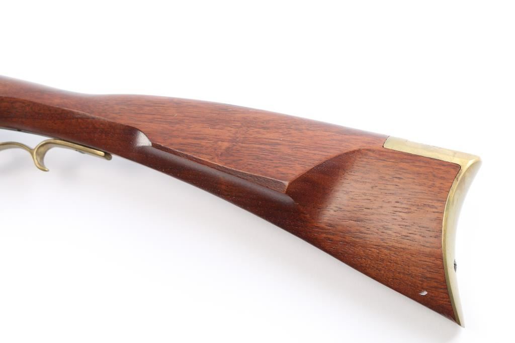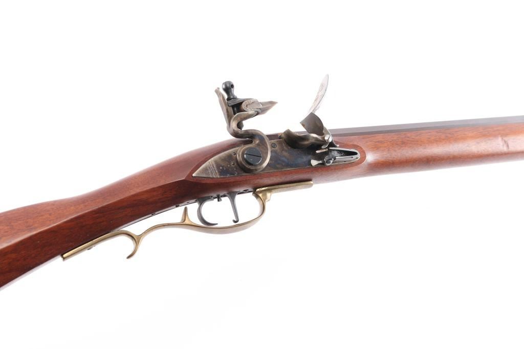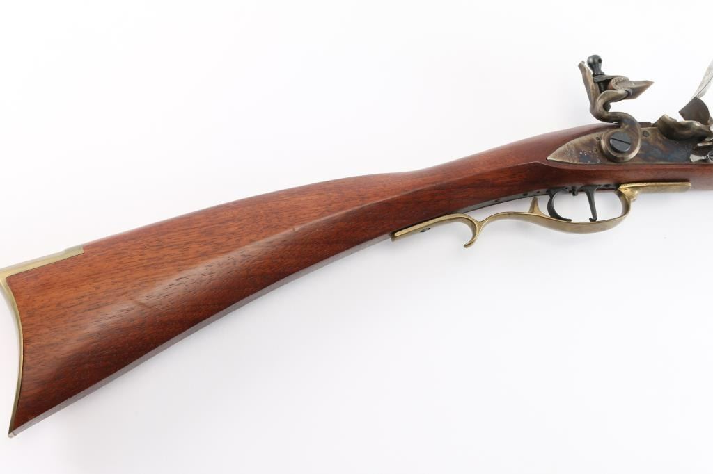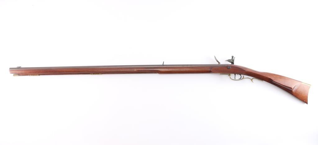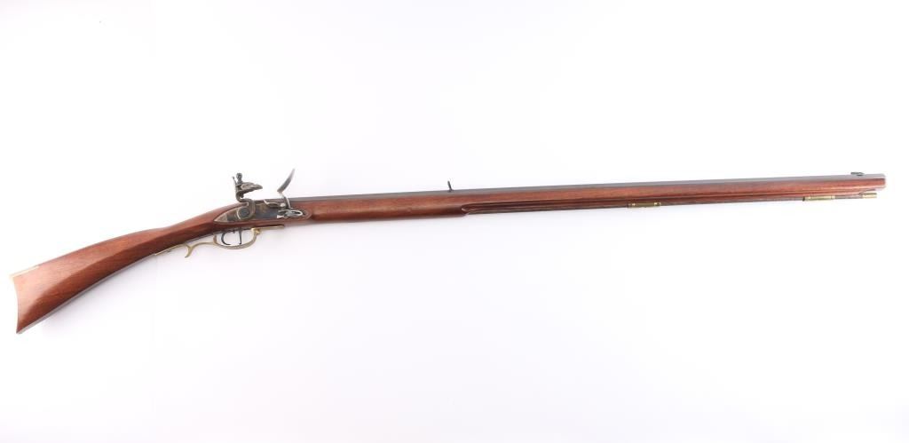 Italian made flintlock rifle, manufactured 2001. 39" octagonal barrel, fixed sights, double set trigger, full length walnut stock with right-handed cheek piece, brass plated furniture, wood ramrod with brass tip. Bore is excellent/bright, dusty, Rifle is in like new condition.