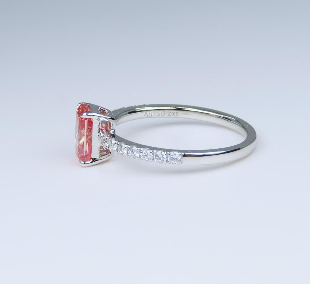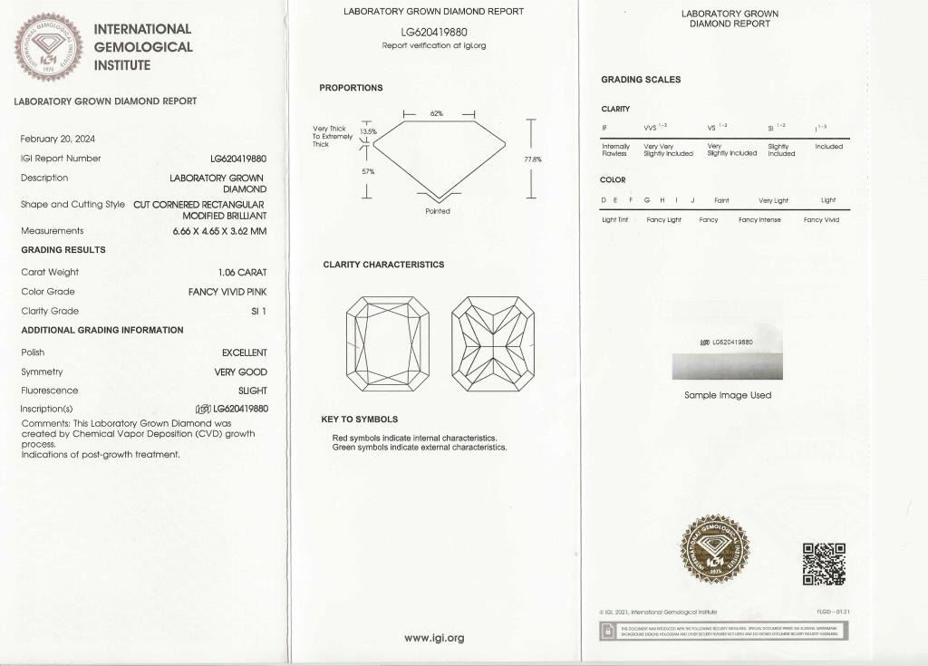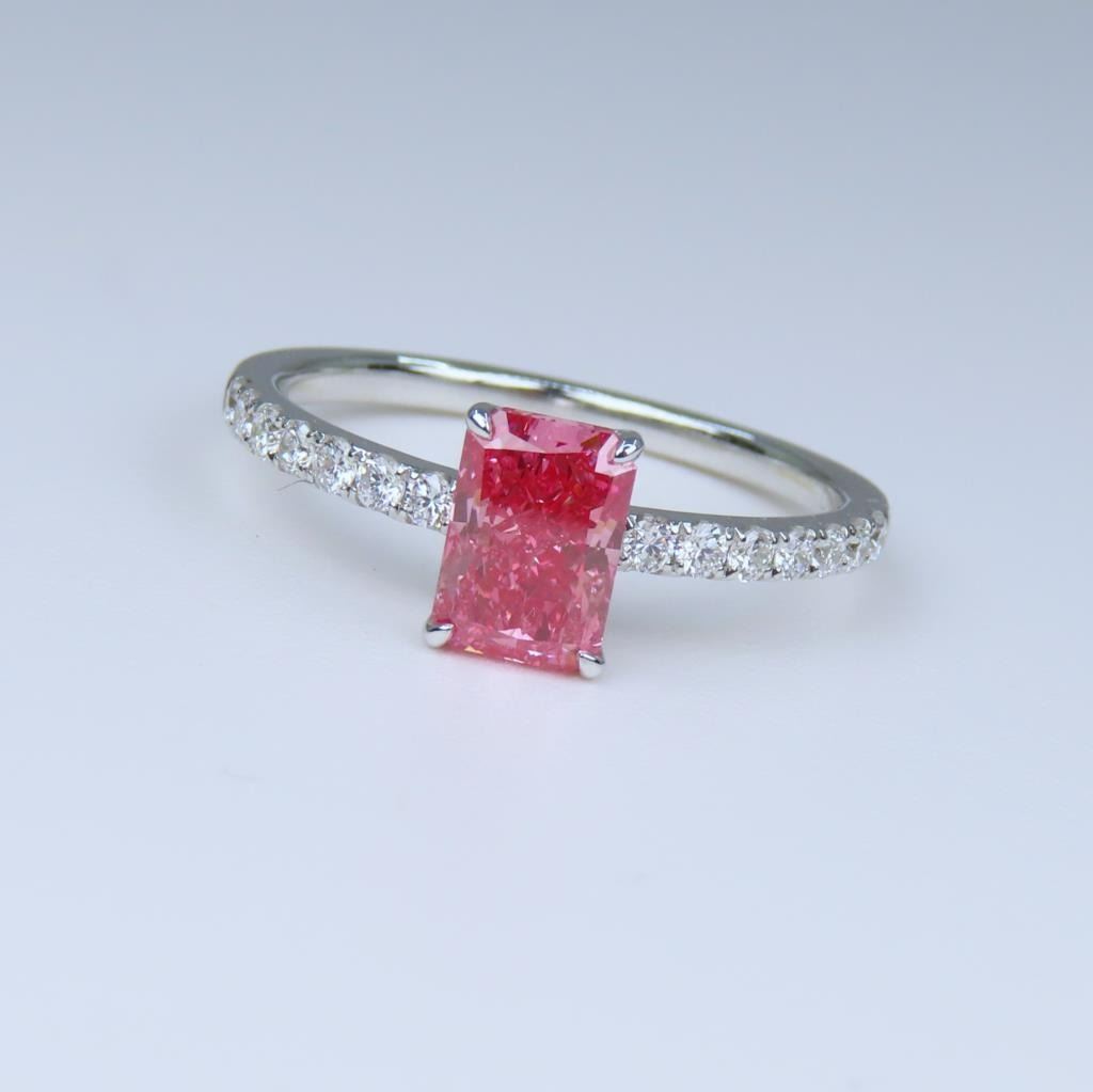 Dazzling Fancy Vivid Pink Created Diamond Ring featuring I.G.I. Certified vivid Pink lab created Diamond weighing 1.06 accented with 14 natural white accent Diamonds set in 14 karat white gold setting. Ring size 5 ¾. Compared to Natural Earth mined Diamonds = $80,000-$100,000.