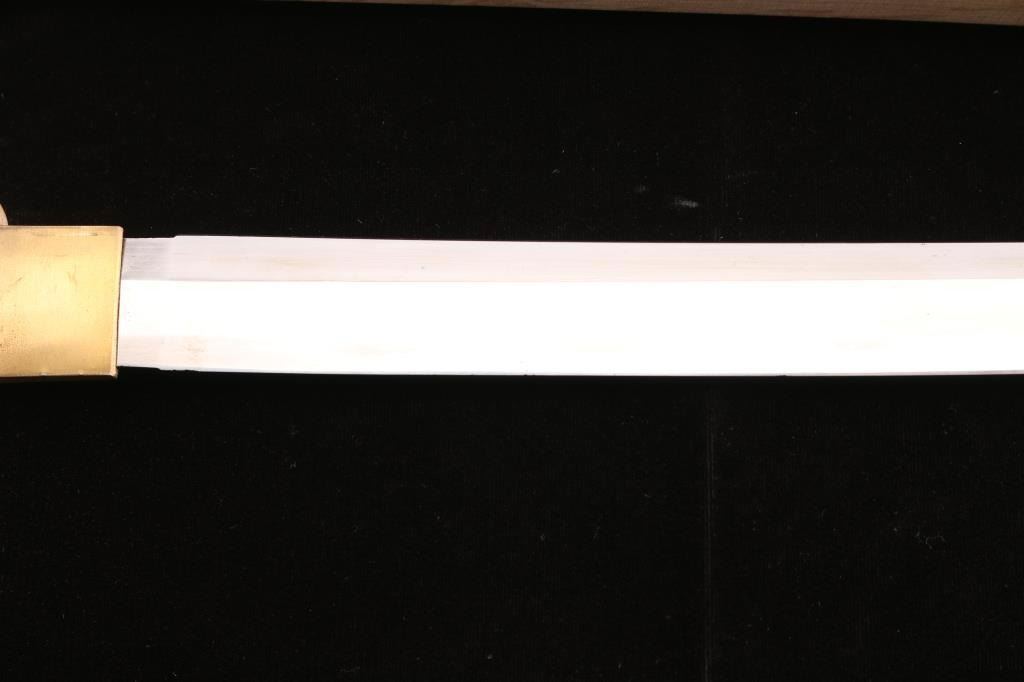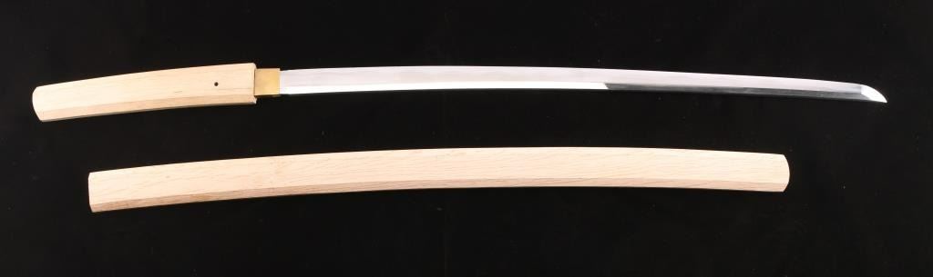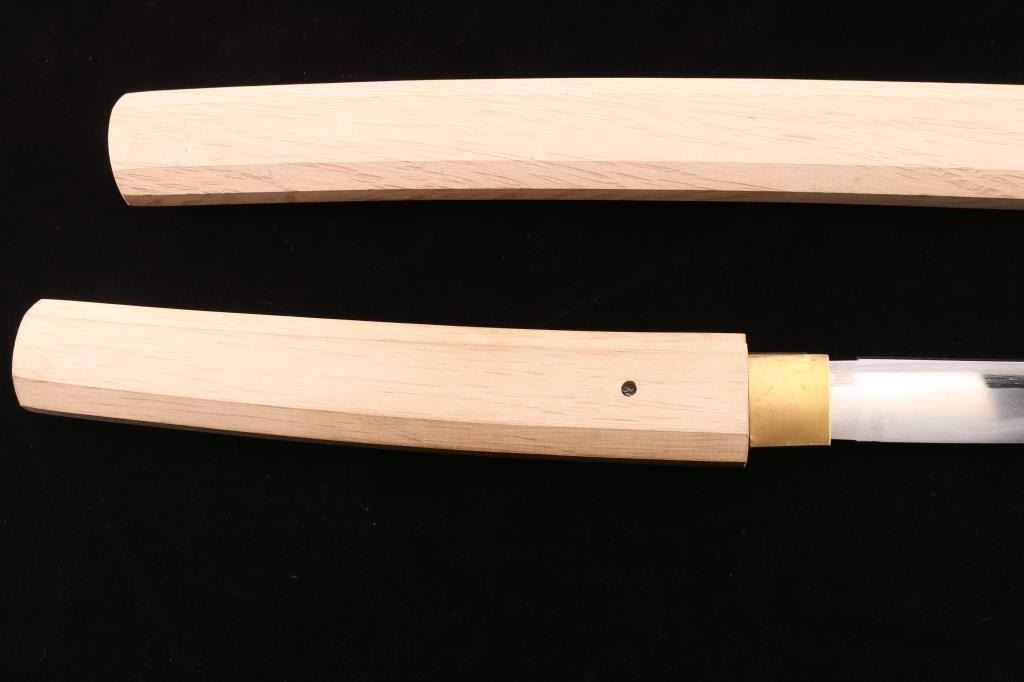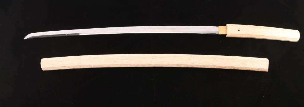 26 5/8" katana blade With Wavy Temper Line and a copper habaki (blade collar) 39 1/2" overall. The tang has a 7 mei signature. Contained in a natural wood shirasaya. The shirasaya was custom made to fit a blade for the purpose of storage or transportation. The blade is overall very good/bright with some minor scratches, no nicks to the edge. The shirasaya appears to be of newer manufacture.