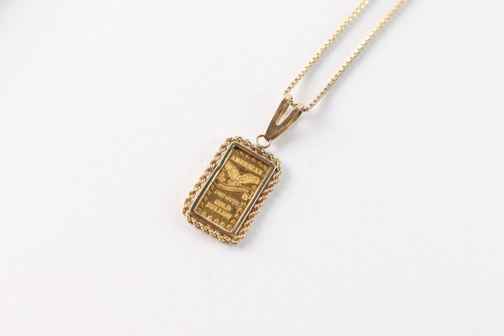 .999 pure 1g gold bar pendant and gold-plated sterling silver chain. Total weight is 4.10g.