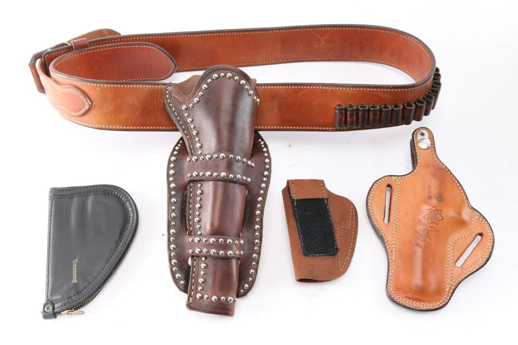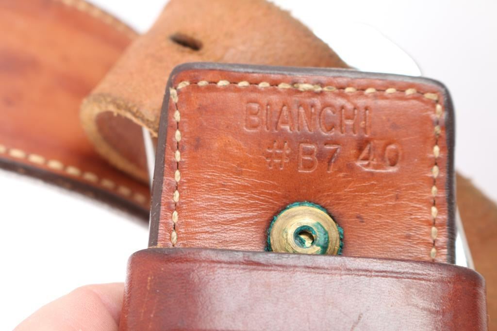 With metal studs and double loops on Bianchi cartridge belt (holster marked Williams-Klamath CA.). Belt size 40. Very good plus used condition with Bianchi leather 4 inch S&W holster, Browning zipper case .25 auto size, Bianchi 2 inch soft leather belt holster D.A. .38. The estate collection of John Kopec.