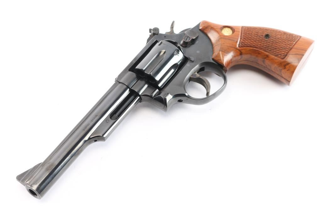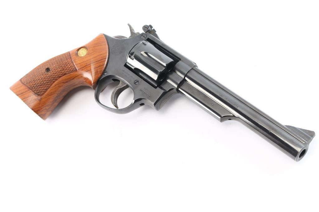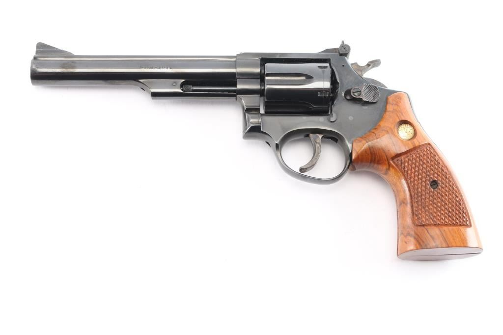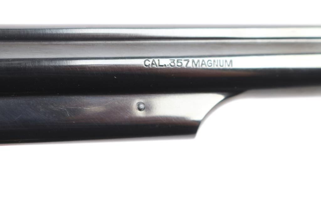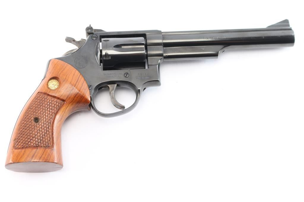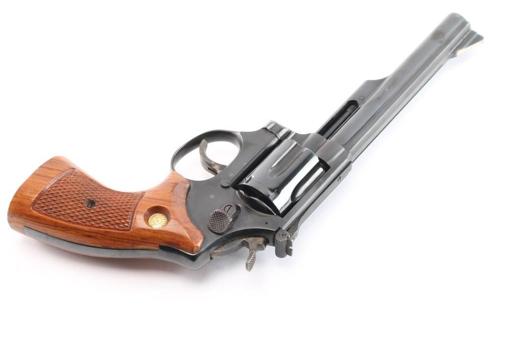 Brazilian made six-shot double action revolver chambered in .357 Magnum imported by Taurus Int. Mfg., Miami, FL. It features a blued finish, 6" barrel with solid top rib & half underlug, ramped serrated front sight, adjustable notched blade rear sight, fluted cylinder, serrated curved target trigger, checkered hammer spur, passive firing pin, internal locking safety, and two-piece checkered wood grips with Taurus medallions. Revolver exhibits approximately 95% of it's original finish showing only a faint drag line on the cylinder, some edge wear, and a minor blemish and wear at the left side of the muzzle. Action is smooth with very good lock-up, bore is dirty but looks like it is bright and wood grips are very good with minor handling marks along the bottom edge.