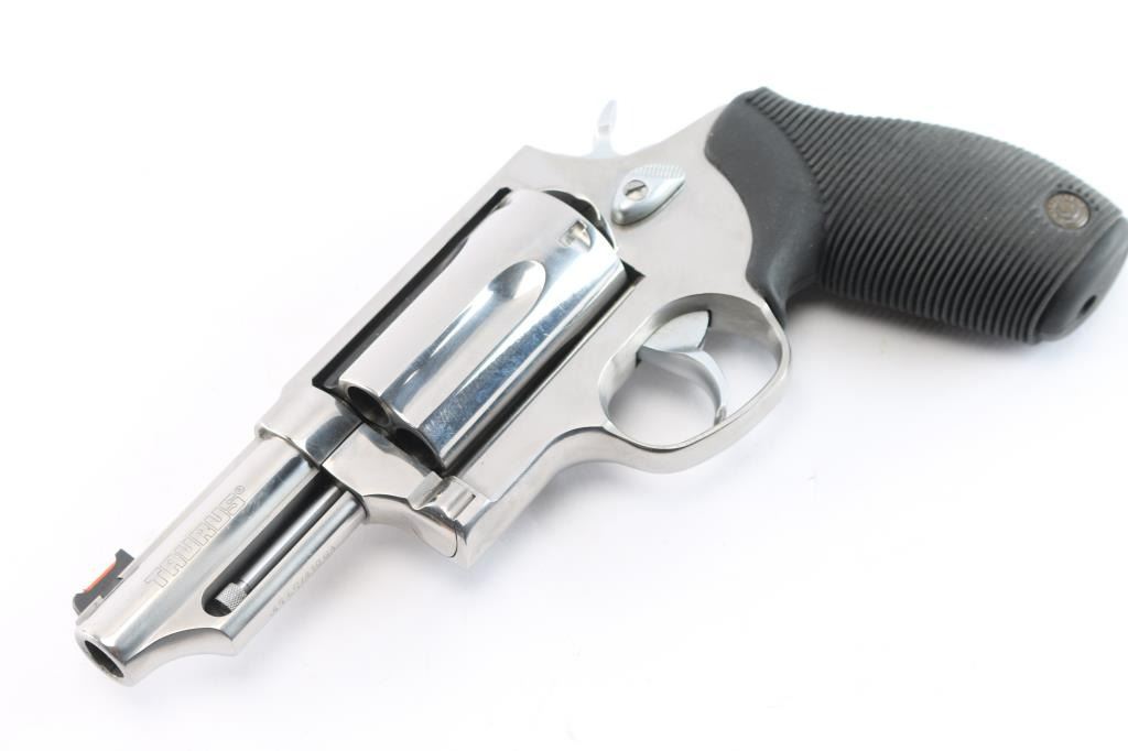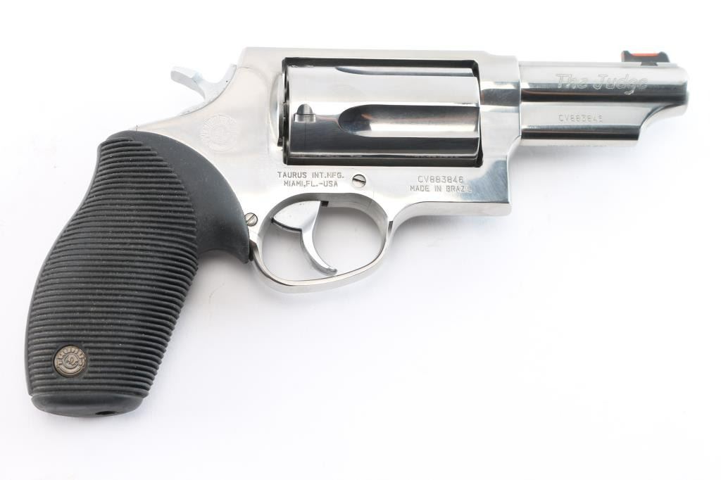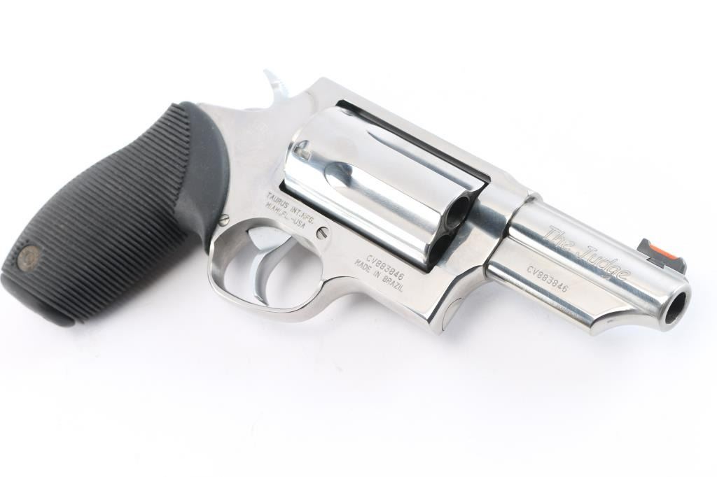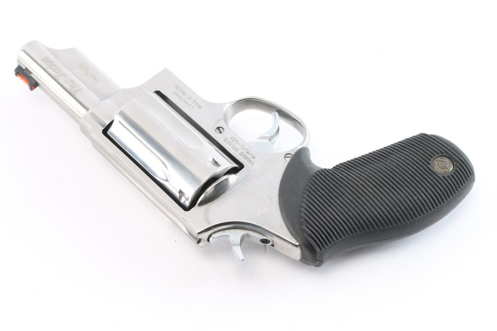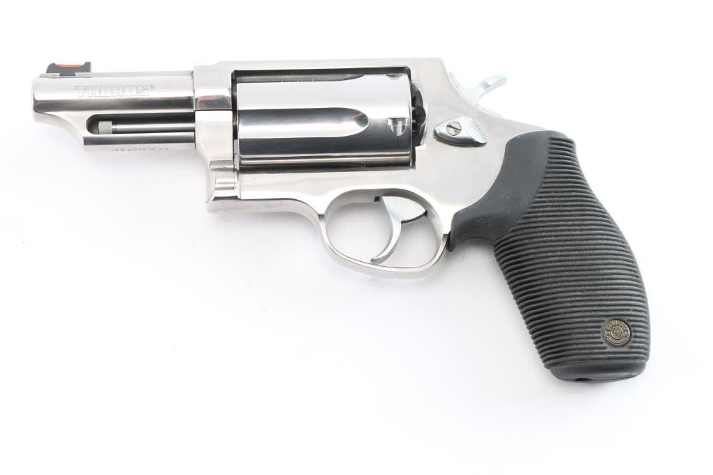 Taurus DA/SA revolver chambered in .45LC/410 GA with a 3" barrel manufactured in Brazil, and imported by Taurus Int. Mfg., Miami, FL. It features a stainless 3" barrel, orange fiber optic front sight, square channel cut rear sight, 3/4 length underlug, fluted five-shot cylinder, checkered hammer spur, passive firing pin, smooth curved wide trigger, internal locking system, transfer bar safety, high luster stainless frame and one-piece ribbed black rubber grip with Taurus medallions. Revolver finish is 99% and exhibits minor scratches and a faint drag line on the cylinder. Action is smooth with solid lock-up, bore is bright with strong rifling, and rubber grip is fine.