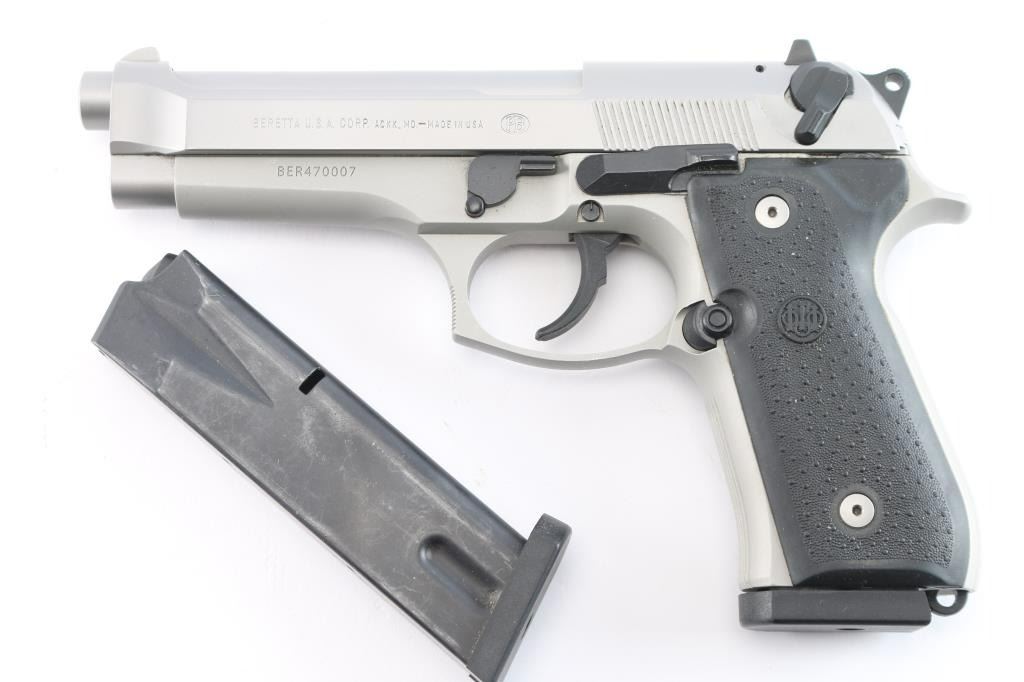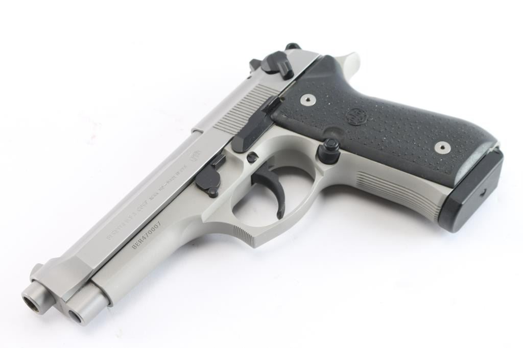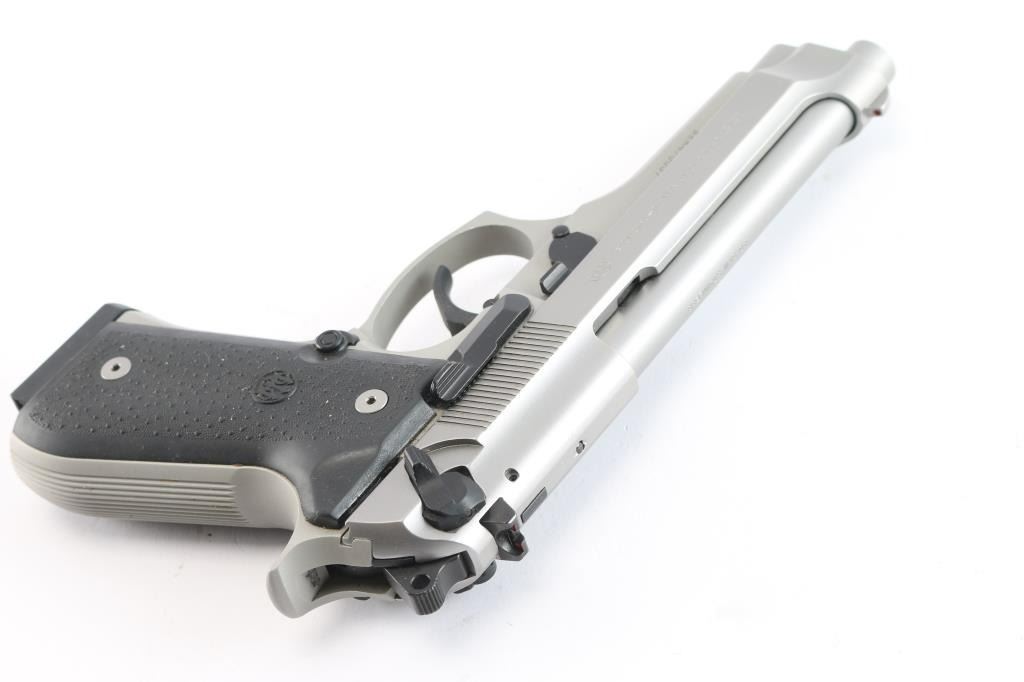 Beretta Model 96 semiautomatic DA/SA pistol is manufactured in Accokeek, MD. It features a stainless barrel and slide, with a silver alloy frame, approximately 4.9" barrel, skeletonized serrated hammer, red 3 dot fixed sights, two piece rubber grips, push button magazine release, serrated front strap, serrated backstrap, ambidextrous slide mounted decocker/safety, 11 round magazine, polymer lanyard stud at butt, curved smooth polymer trigger, and polymer guide rod. Bore is excellent condition. Overall finish is 98% with light scattered handling marks. Black rubber grips are excellent. Includes extra magazine, owners manual, and factory plastic box.