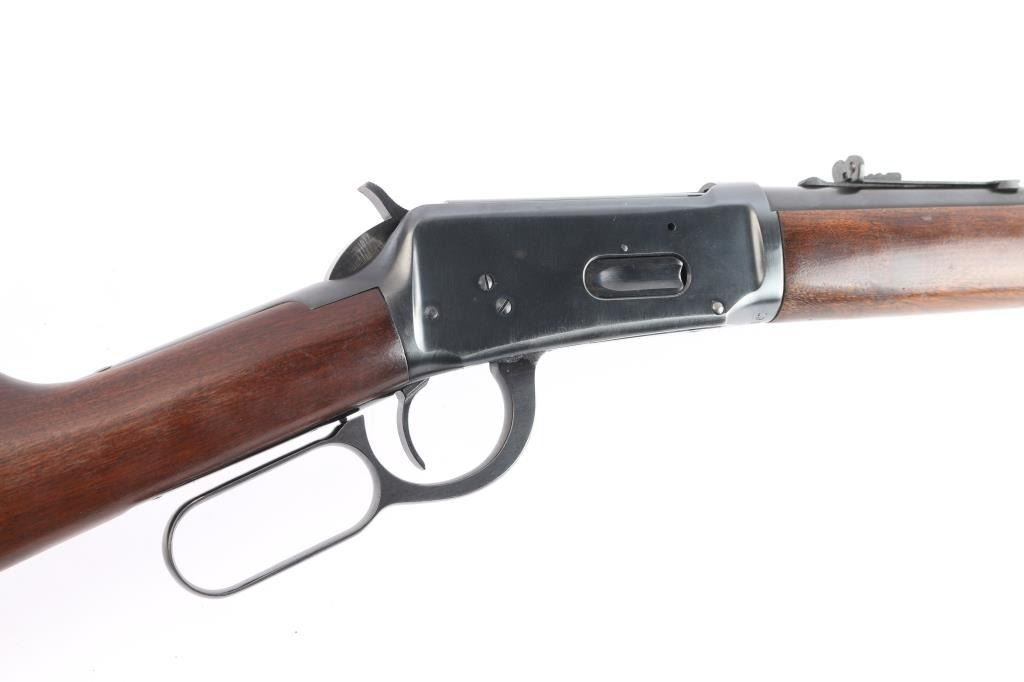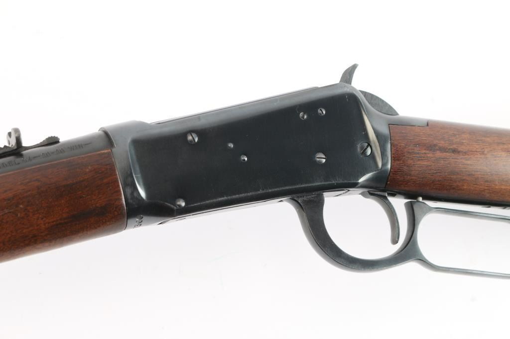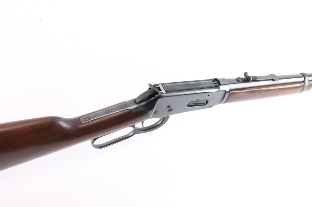 'Pre-64 Eastern Carbine' Vintage lever action repeating rifle chambered in .30-30 Winchester, manufactured in New Haven, CT circa 1952. Features a blued finish, 20" tapered barrel, full-length tube magazine, ramped blade/bead front sight, semi-buckhorn rear sight with elevator, smooth trigger, serrated hammer spur, steel receiver, two barrel bands, smooth walnut forend and straight grip shoulder stock with knurled steel buttplate. Bore is very good, slightly dirty. Retains approx. 95% finish with slight edge wear. Wood is very good with some light scratches. Action is smooth. Winchester markings are crisp/clear. Condition is NRA Excellent. ***C&R Firearm***.