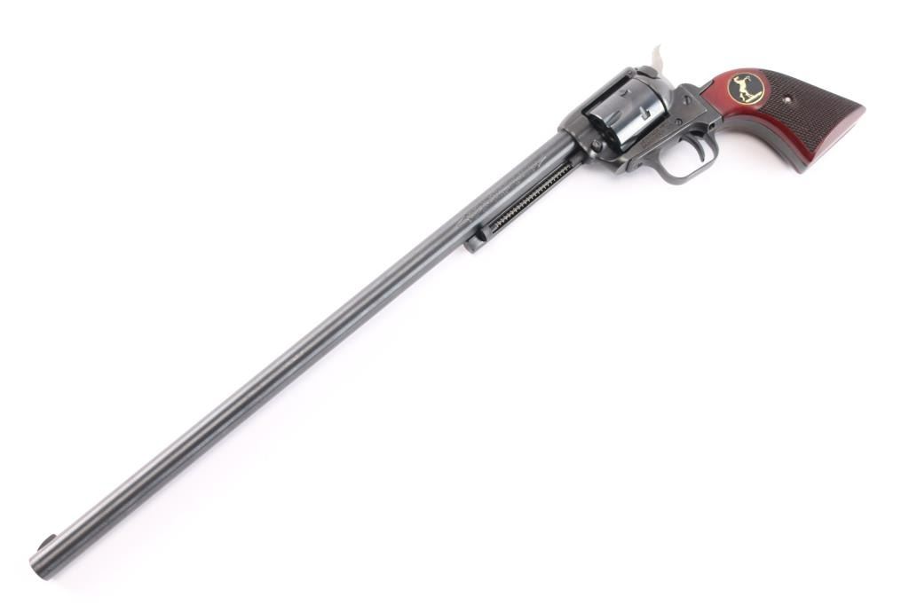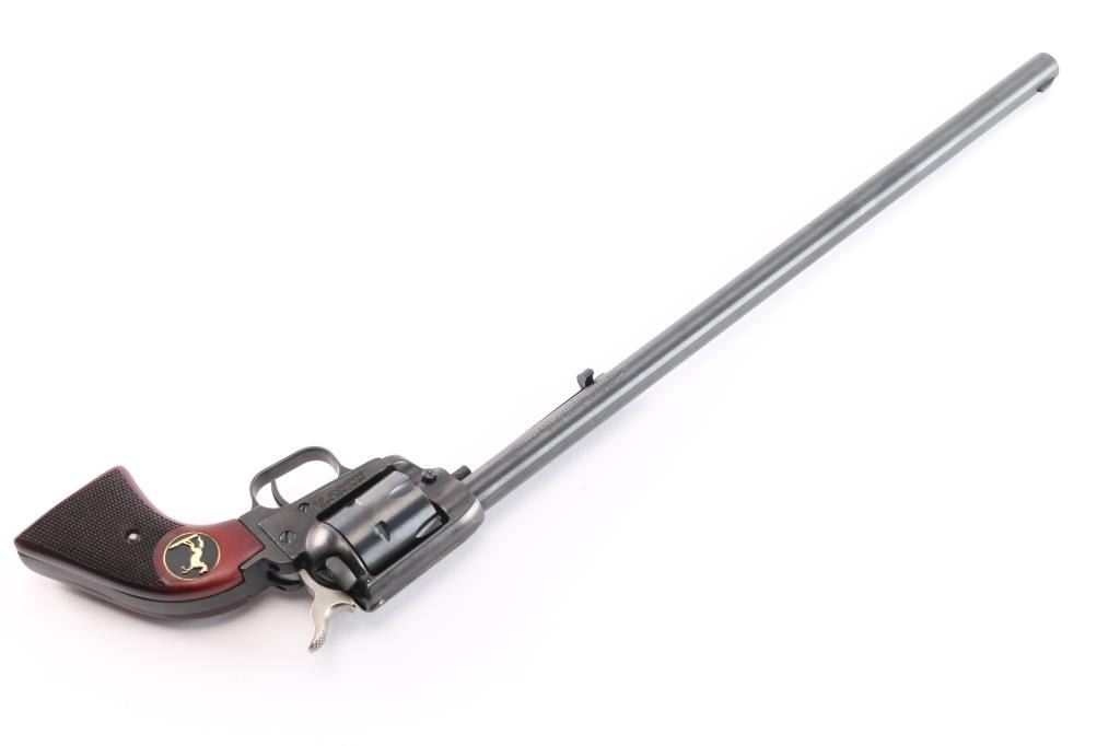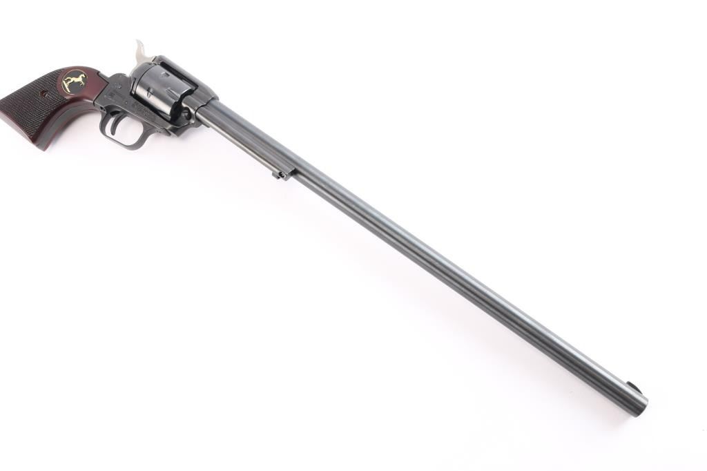 The Rough Rider is chambered for 22 LR ammunition. The metal finish is black with a 16" barrel, blade front sight, notch rear sight, a 6 round fluted cylinder, Cocobolo Grips (Included) are replaced with nice Rosewood “Stud” Version Rough Rider Checkered Rosewood w/ Stud Horse Medallion, thumb safety on the left side of the non-blued hammer. This design is inspired by the 19th-century Colt Buntline. Metal finish looks great, no drag line on the cylinder. Bore is excellent/bright. looks unfired. Grips are fine. Comes with original box, lock, the .22LR cylinder and manual. Also included is a nice black leather single loop holster and a heritage black nylon flap boot, both in new condition