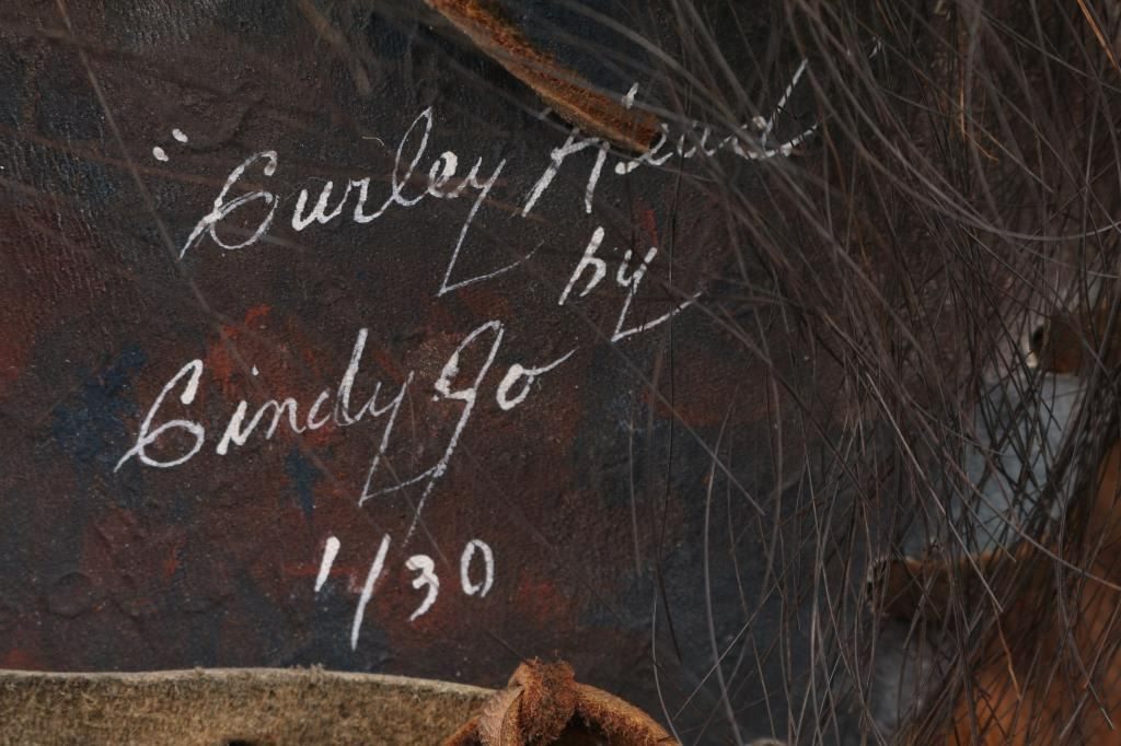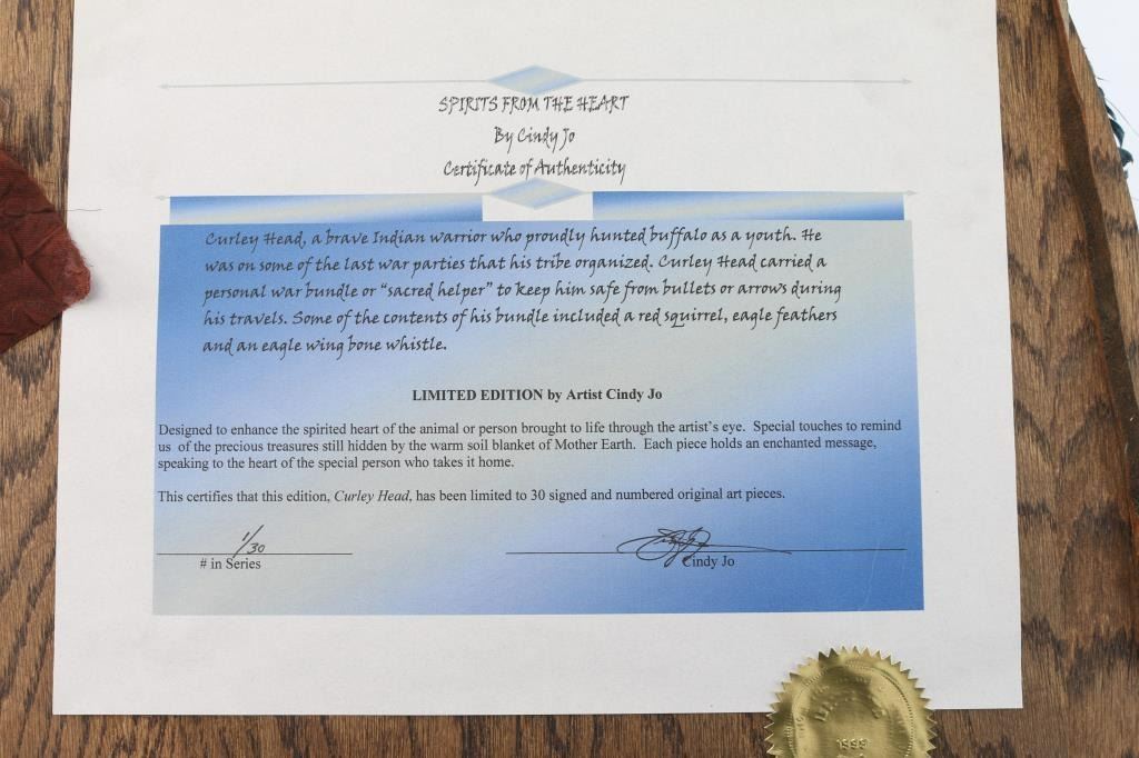 Titled "Curly Head", #1/30, Spirits From The Heart. From the artist: "For more than thirty years, I have immersed myself in the study and creation of Native American art. My love for the narrative beauty of Native American culture, as well as a desire to honor my Cherokee heritage, has driven me to understand and represent the character, strength, and honor of Native American people. I am a self-taught artist, competent in ceramic, clay, bronze, and other mixed media, and I am meticulous in researching and understanding the subject matter I represent with each of my pieces. My intent is always to make my art speak to my audience. If eyes convey emotion, posture portrays movement, and detail portrays a story, then I know my pieces are conveying the stories I wish to tell with each one. My work and business accomplishments have been recognized both locally and throughout the Mountain West. I have been highlighted in magazines such as Cowboys & Indians and Western Art & Architecture, and my various awards and business endeavors have been recognized in local publications such as the Idaho State Journal and the Blackfoot Morning News. I independently owned and operated my own business, From the Heart of Idaho, where I sold my own artwork as well as that of various other local artists. I took great pride in showcasing my talents and providing an avenue for other developing artists to thrive." Comes with Certificate of Authenticity.