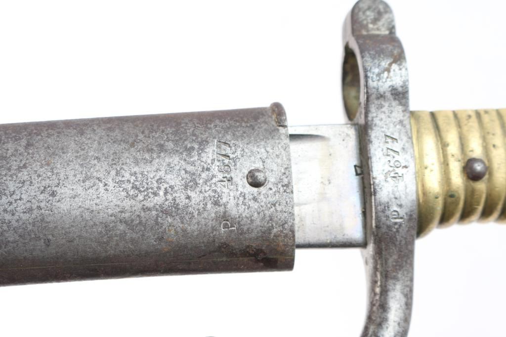 3rd Republic. 22 3/4" Yataghan style blade, wide fuller, the spine of the bayonet is marked St. Étienne 1879, indicating original manufacture at the arsenal in St. Étienne, in 1879. It is in overall good condition showing age & wear, mostly bright blade with some areas of light staining and a couple of nicks in the edge. The brass handle has a aged mustard patina. Serial number matched on crossguard and scabbard. French proofs, scabbard is dent free with scattered dark patina.