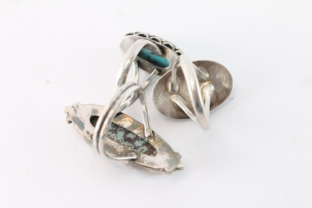 Set in sterling silver, the rings are sizes 11 1/4 (oblong light blue with brown matrix), 11 3/4 (oval bright blue with brown matrix), and 10 (blue with silver matrix).