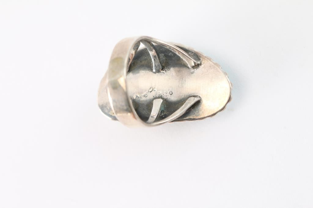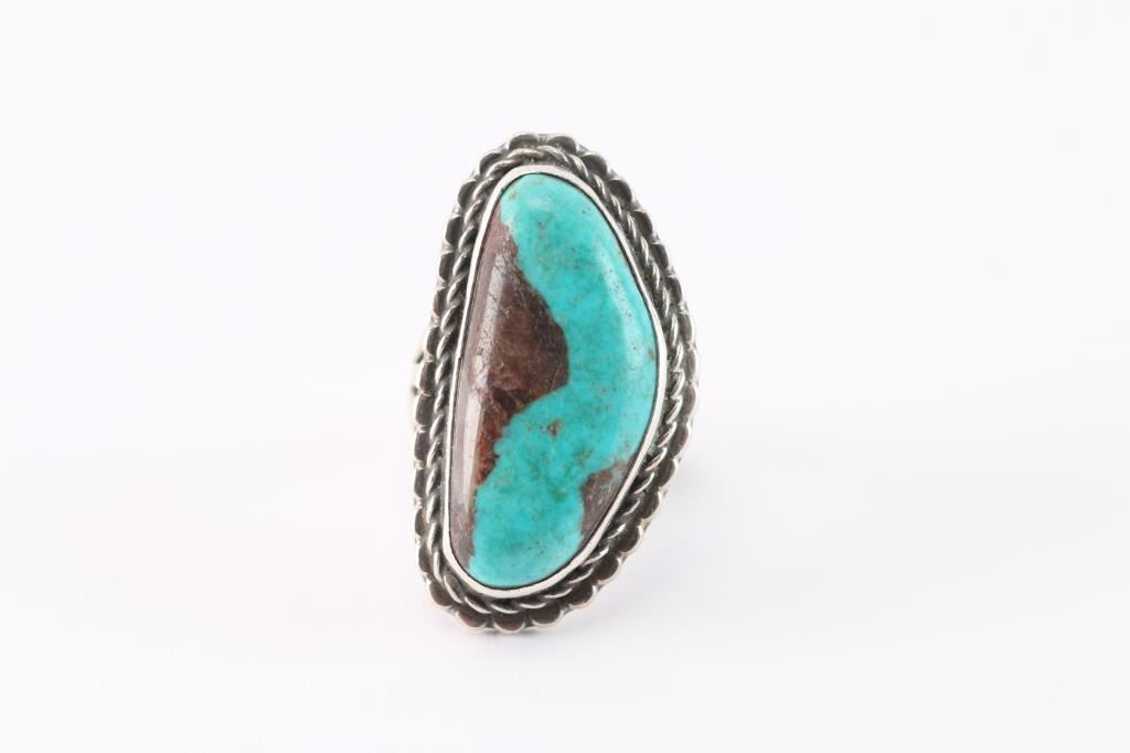 Sterling silver with large side triangle turquoise stone which has nice brown matrix. Size 7 1/2.