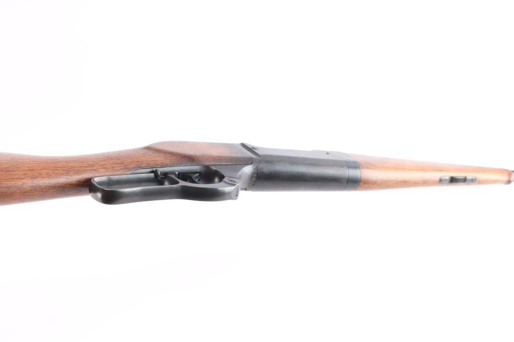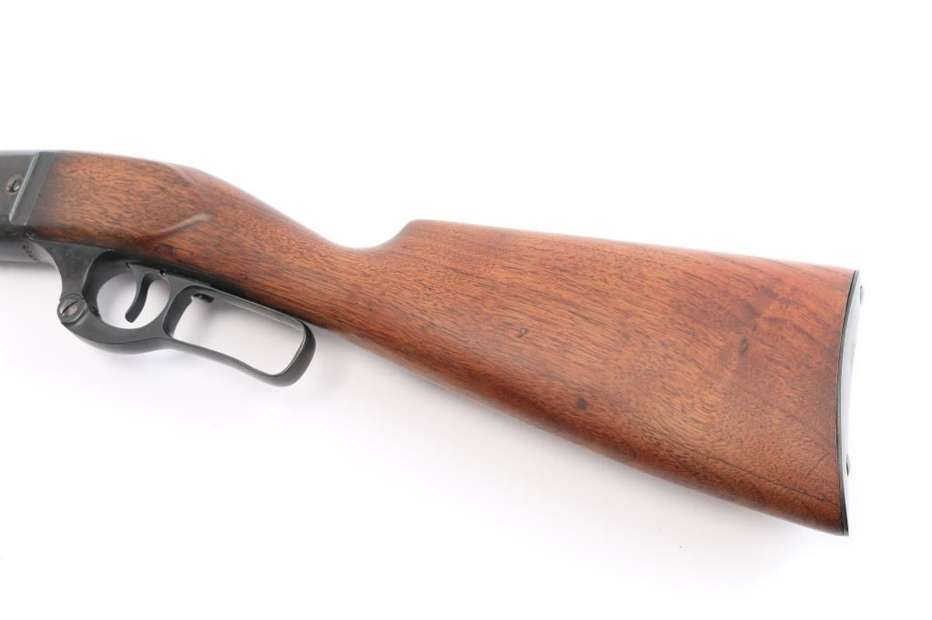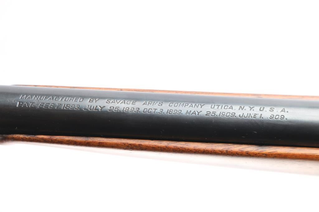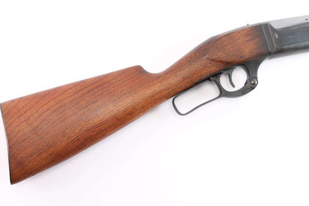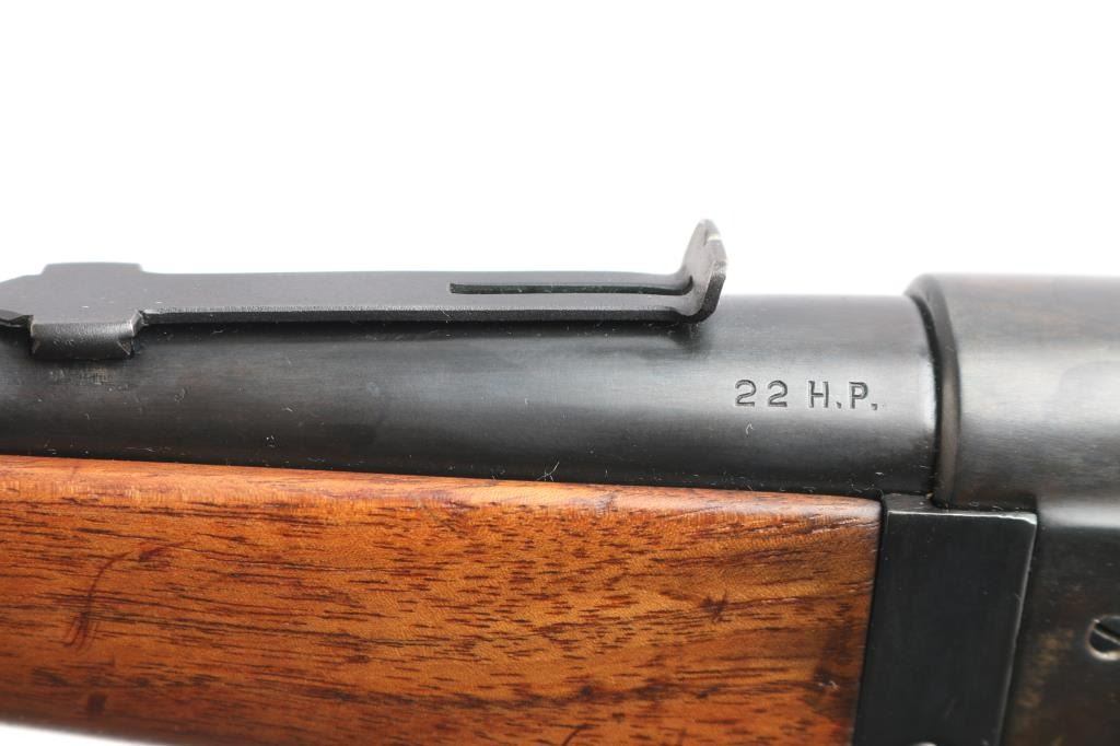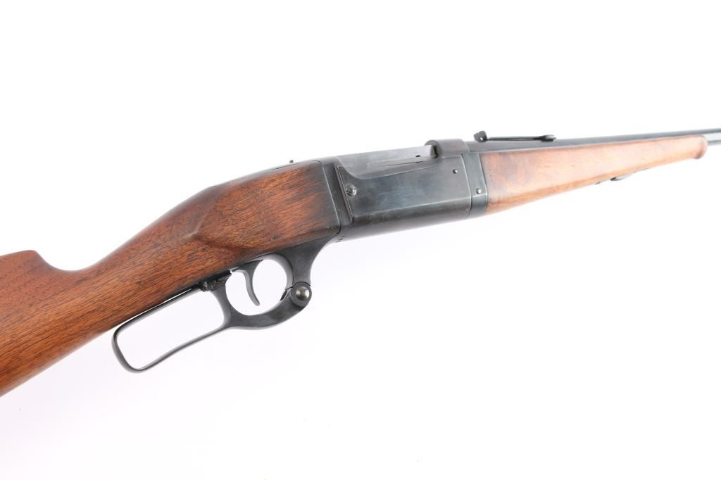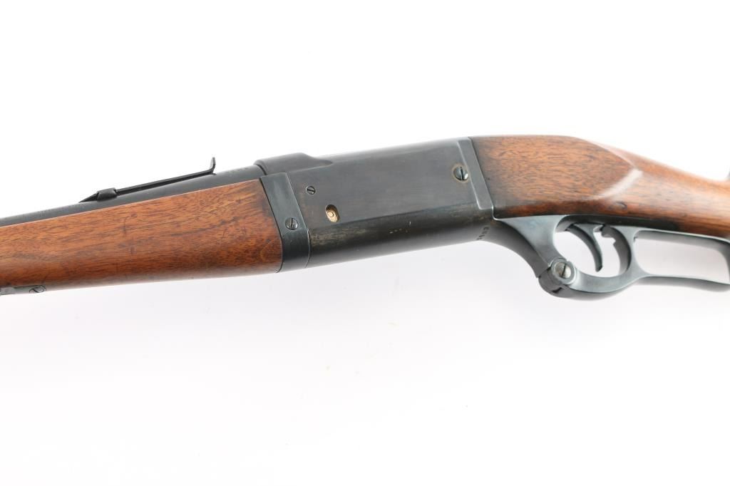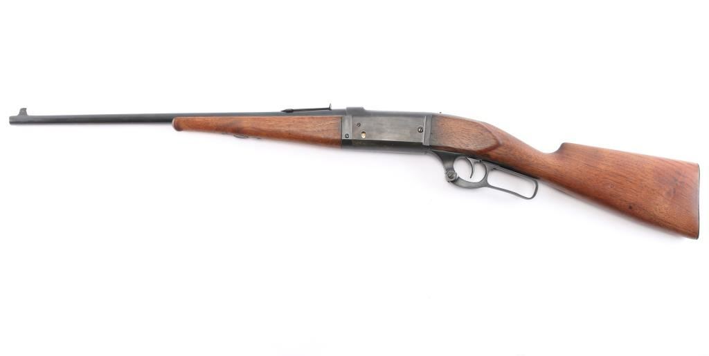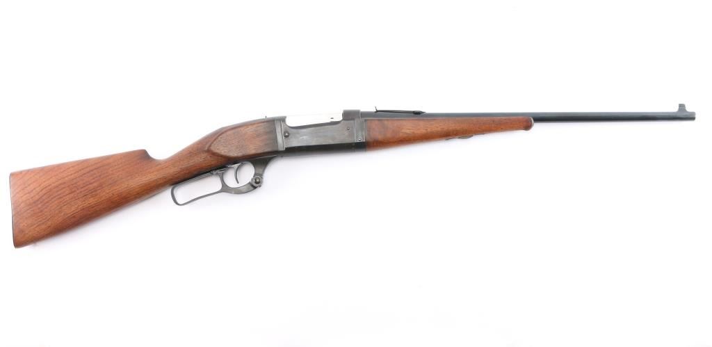"Take Down" Vintage lever action repeating rifle chambered in .22 Savage Hi-Power caliber, manufactured circa 1914. Features a dark re-blued finish, approx 20" barrel, pinned blade front sight, sporting rear sight (missing elevator), internal rotary magazine with brass spool/round counter, cocked indicator on the upper tang, smooth trigger, straight finger lever, sliding safety (and lever lock) on the lower tang, smooth walnut forend with schnabel tip, smooth walnut straight wrist shoulder stock, smooth steel buttplate. Bore is good condition, some frosting, strong rifling. Retains 85% re-finish, including receiver and lever, showing edge losses, some fading, discoloration on areas of receiver. Wood is good, lightly sanded & refinished.