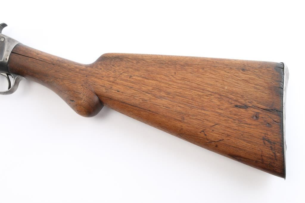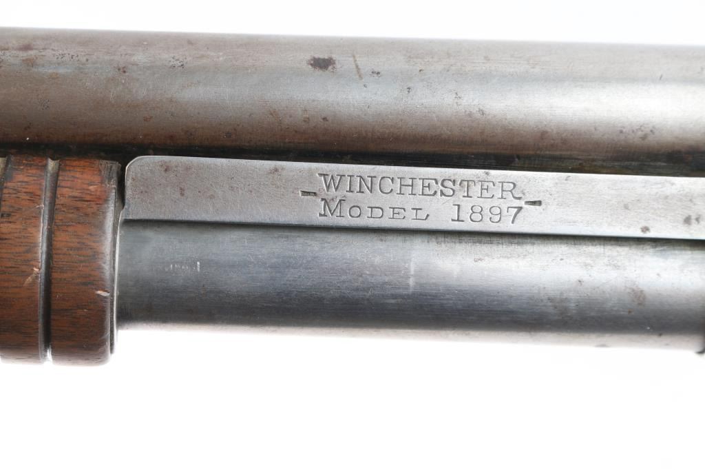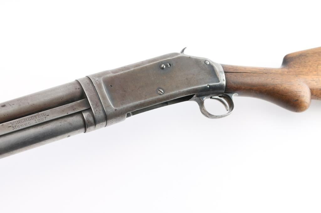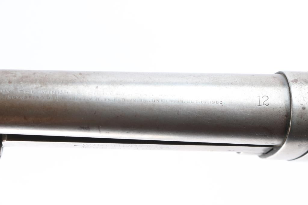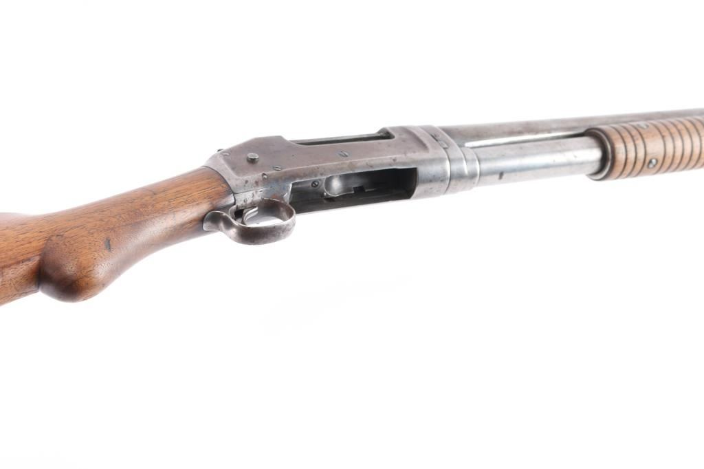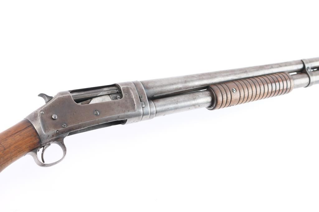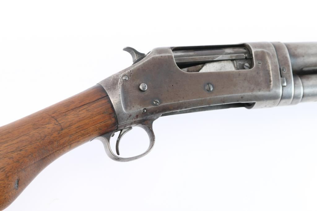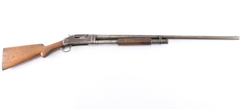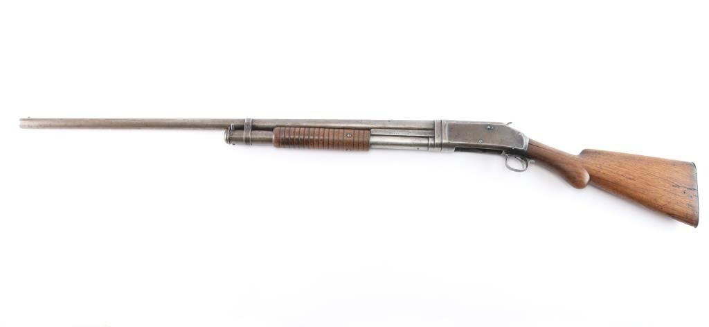 Vintage take down pump action shotgun manufactured circa 1903. Features blued finish, grooved "corn cob" walnut pump handle, smooth walnut stock with rounded 'Prince of Wales" grip, smooth steel butt plate. plain 32" barrel with red sighting bead, accepts 2-3/4" shells, fixed FULL choke, exposed hammer. Receiver extension numbered to receiver. LOP is 13". Bore is fair with scattered pitting. Retains none of the original blue, having turned a molted gray/brown patina, some scattered areas of very light pitting, action is smooth, wood has some minor scratches/dings, there is two hairline cracks on both sides of the grip