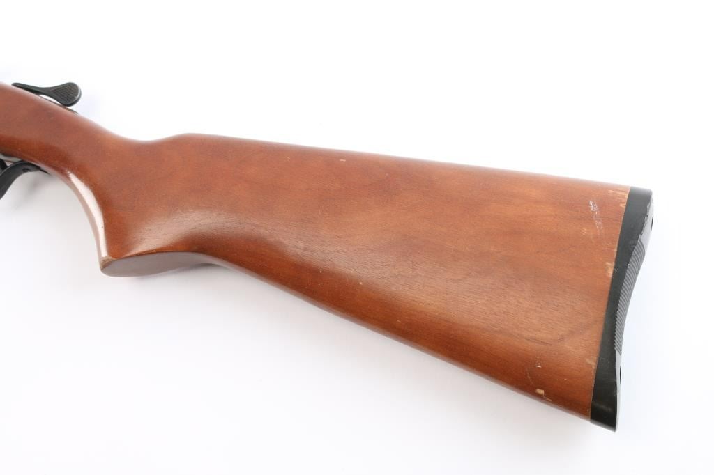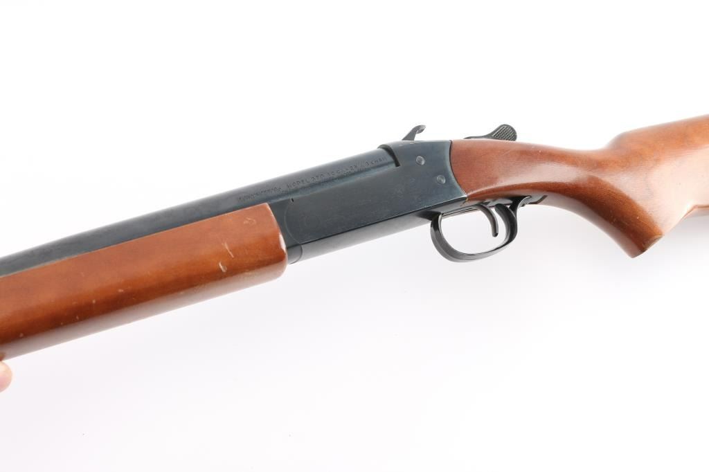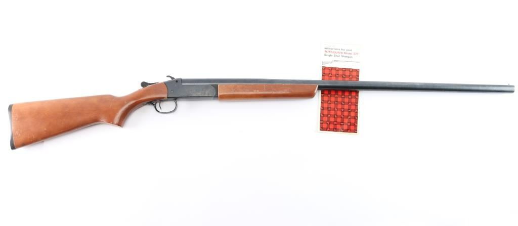 Produced by the Cooey company in Canada for Winchester from 1968 to 1973. Single shot shotgun chambered for 2 3/4" & 3" 12 gauge shells. Features a blued finish, 32" full choked barrel, bead front sight, smooth trigger, checkered top lever, serrated hammer, smooth wood forend and pistol grip shoulder stock with serrated black plastic buttplate. Shotgun retains approximately 90% of it's blued finish with the receiver with minor scratches/edge wear. Action is crisp, bore is excellent and wood stock are good to very good with some scratching. Comes with original manual.