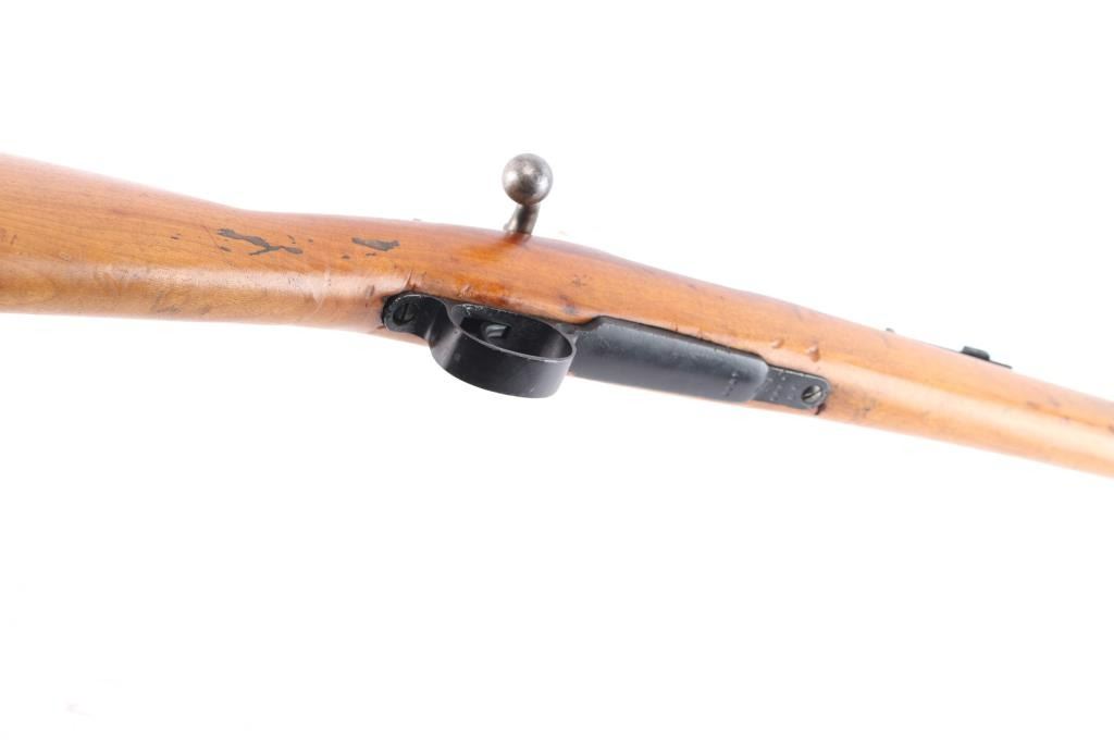 This sporterized small ring 1893 Spanish Mauser features a 21.5” barrel chambered in 7x57. The stock is a modified military stock, cut back behind the rear barrel band with many dents and impressions left by years of use. The receiver tang and bottom metal do sit proud of the stock. The barrel matches the receiver S/N and has some light pitting beneath the finish and some small spots have worn off without damaging the barrel. The receiver also has some tarnished areas of finish to include the bolt release. Rear sight is open-sighted ladder style and the sight notch has been filed to open the view. The bottom metal features heavy pitting and the receiver screws and sling swivel screws all show marring within the slots. The sides of the butt plate have been sanded down and lacquered with the stock. The bottom face of the butt-plate shows oxidation and pitting. Bore is excellent. Retains approximately 90% of its arsenal finish showing light wear, some scattered rust and old pitting under the finish along the stock line. Stock is in serviceable condition with numerous blemishes and showing water damage & shrinking. Makings are crisp and clear.