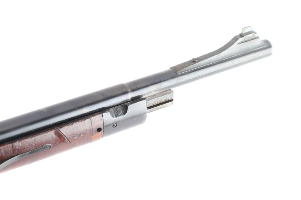 This is a post-war, Brazilian made 1808 pattern Mauser bolt-action rifle variant from the Itahuba, Brazil (later IMBEL) factory. The rifle is chambered from the factory in .30-06 with a 22” barrel. The rifle has seen some modification to by the previous owner to fit their needs. The banded rear sight and assembly has been completely removed in favor of a Lyman 57 receiver mounted, fully adjustable peep sight. The factory front sight post has also been removed in favor of a checkered, ramped front sight with a brass beaded sight. The upper handguard, barrel bands and the guard retainer screws are not present on the rifle. Serialized components are matching. The stock has a lot of wear, showing scratches, and depressions across its surface, but bears no significant damage or cracking. The stock is stamped with a matching serial number, has an armory rack number painted on it of 021 as well as the remnants of a crest on the right face. Original finish is approximately 70%, showing significant wear on the guard, receiver, barrel (just over the bayonet lug) and butt plate. The Brazilian crest has also been partially worn off. Bore shows evidence of wear, but remains shiny and crisp.