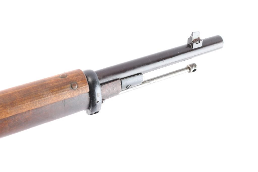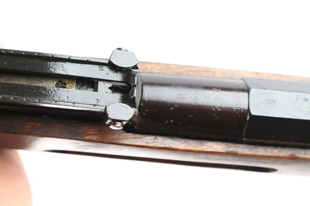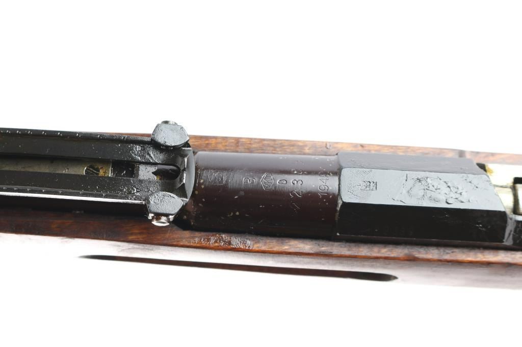 Very nice WW2 military bolt action rifle circa 1942 in the Jyvaskyla factory. Rifle Features 31.6" barrel, no bayonet lug, inverted "V" front sight, ladder tangent rear sight graduated to 1200 meters, hex receiver with stripper clip guides, fixed five round magazine with hinged floor plate, smooth forend, cleaning rod under barrel, sling swivels, straight bolt handle, straight wood stock & matching wood handguard. The stock is Finnish with two piece construction. Bore is bright, metal finish is good retaining most of its finish with some pitting towards the muzzle. Bolt is clean, and mechanically sound. It features a modified two-stage trigger, with smooth curved trigger bow. Receiver markings include "B", "D", "1942", "VKT", the serial number, and an "SA" in a rectangle. The stock is very good, with a couple of small gouges near the rear of the receiver. Receiver, barrel, and bolt have matching serial numbers "22389".
